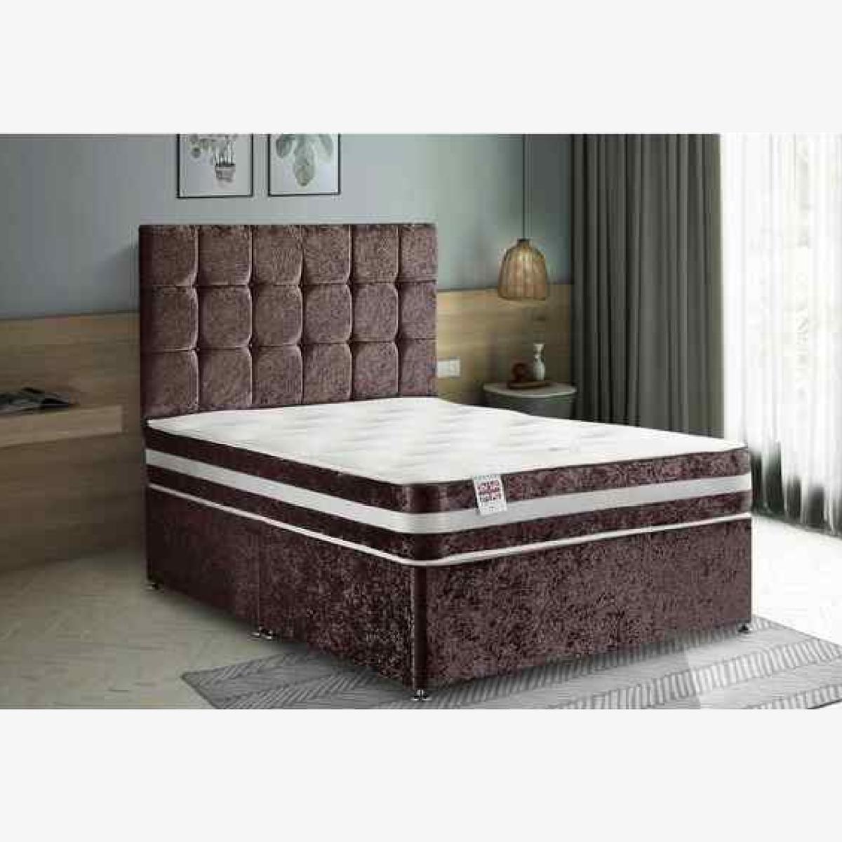 A contemporary style for any bedroom setting. This affordable yet quality divan bed comes with a 26 inch headboard, base and a memory spring mattress. This bed is available in 6 sizes and various fabrics and colours. There are storage options of having 2 drawers. The mattress is a 13.5 Open Coil Bonnell spring with a layer of responsive memory foam, hand tufted as it secures the classic mattress fillings and enhances the performance and life span. A medium to firm mattress with a depth of 10 inches this amazingly priced bed set represents great value for money.