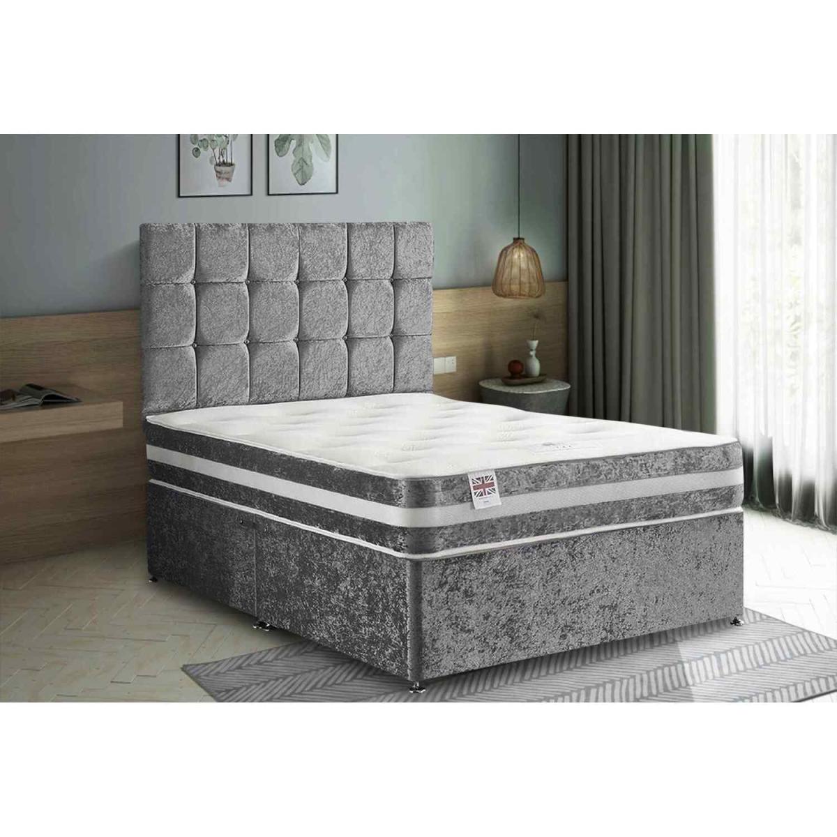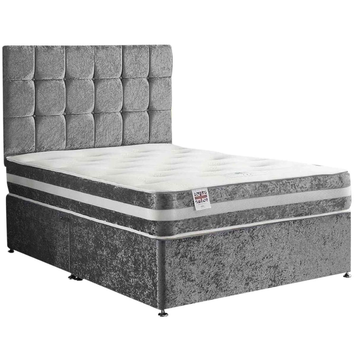A contemporary style for any bedroom setting. This affordable yet quality divan bed comes with a 26 inch headboard, base and a memory spring mattress. This bed is available in 6 sizes and various fabrics and colours. There are storage options of having 2 drawers. The mattress is a 13.5 Open Coil Bonnell spring with a layer of responsive memory foam, hand tufted as it secures the classic mattress fillings and enhances the performance and life span. A medium to firm mattress with a depth of 10 inches this amazingly priced bed set represents great value for money.