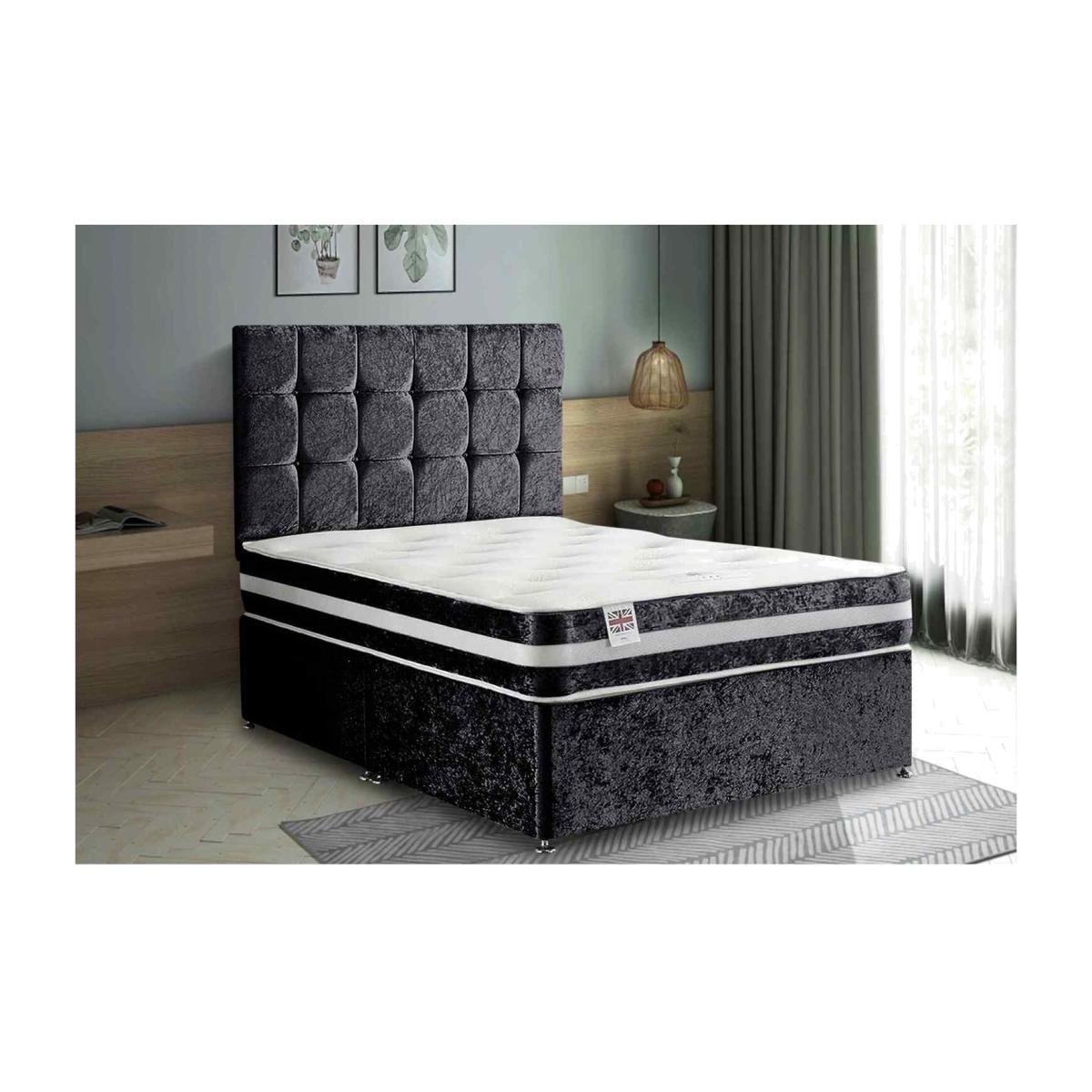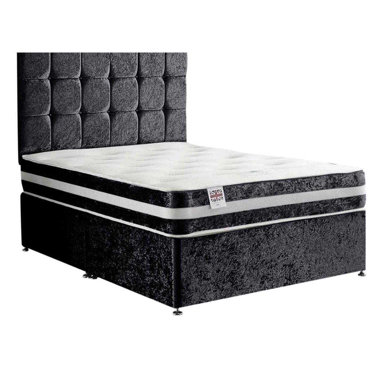 A contemporary style for any bedroom setting. This affordable yet quality divan bed comes with a 26 inch headboard, base and a memory spring mattress. This bed is available in 6 sizes and various fabrics and colours. There are storage options of having 2 drawers. The mattress is a 13.5 Open Coil Bonnell spring with a layer of responsive memory foam, hand tufted as it secures the classic mattress fillings and enhances the performance and life span. A medium to firm mattress with a depth of 10 inches this amazingly priced bed set represents great value for money.