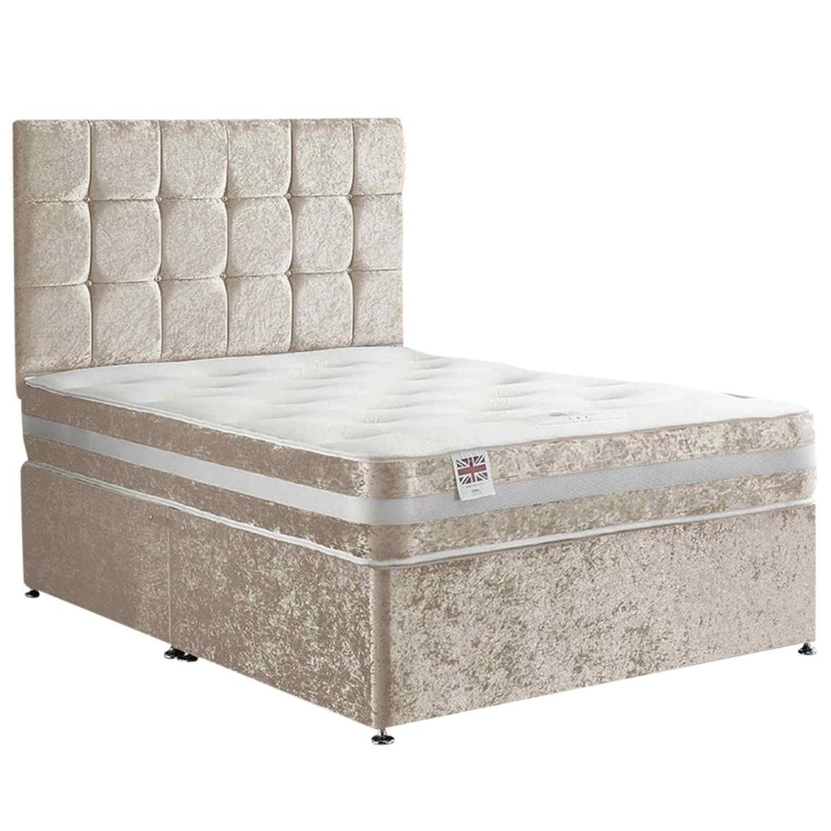 A contemporary style for any bedroom setting. This affordable yet quality divan bed comes with a 26 inch headboard, base and a memory spring mattress. This bed is available in 6 sizes and various fabrics and colours. There are storage options of having 2 drawers. The mattress is a 13.5 Open Coil Bonnell spring with a layer of responsive memory foam, hand tufted as it secures the classic mattress fillings and enhances the performance and life span. A medium to firm mattress with a depth of 10 inches this amazingly priced bed set represents great value for money.