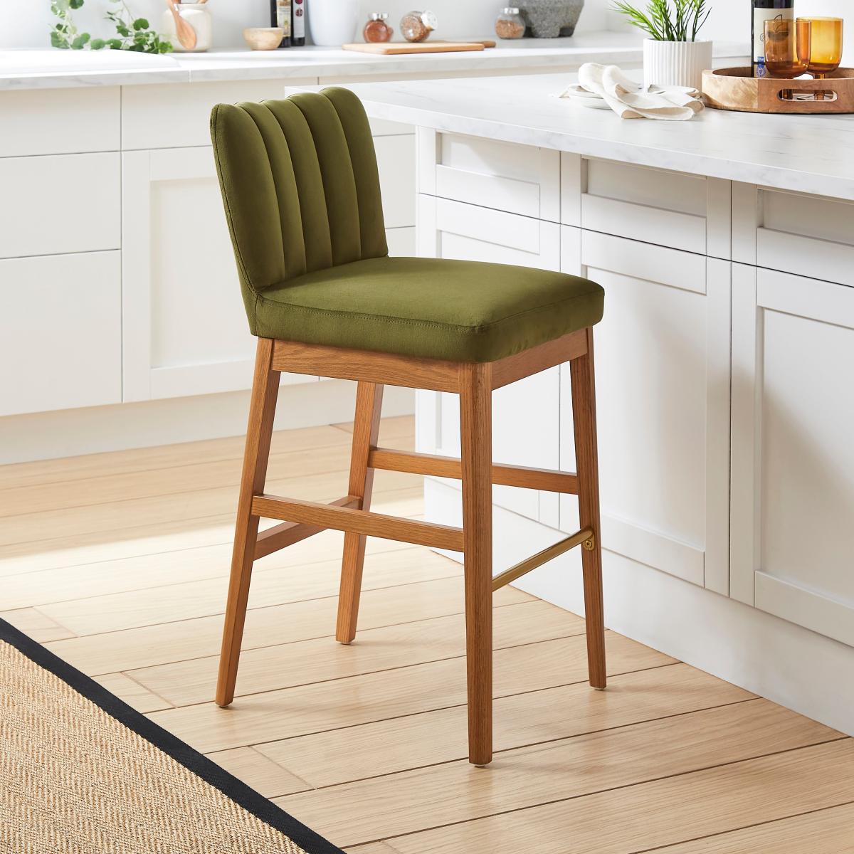 I love this bar stool because of its versatile and modern design, which instantly adds a touch of sophistication to any space. The velvet olive seat provides a rich colour that works well in both contemporary and classic interiors, especially when paired with natural wood tones like those in the legs for a warm, inviting feel. It’s perfect for creating a relaxed yet stylish breakfast bar or kitchen island area. Practical styling tips include mixing and matching with other upholstered seating or layering with patterned cushions for added comfort. Keep it uncluttered for a clean look, or complement it with brass or black accents for extra visual interest. This stool's earthy tone makes it adaptable to various colour schemes - think neutrals, warm tones, or even monochrome palettes.