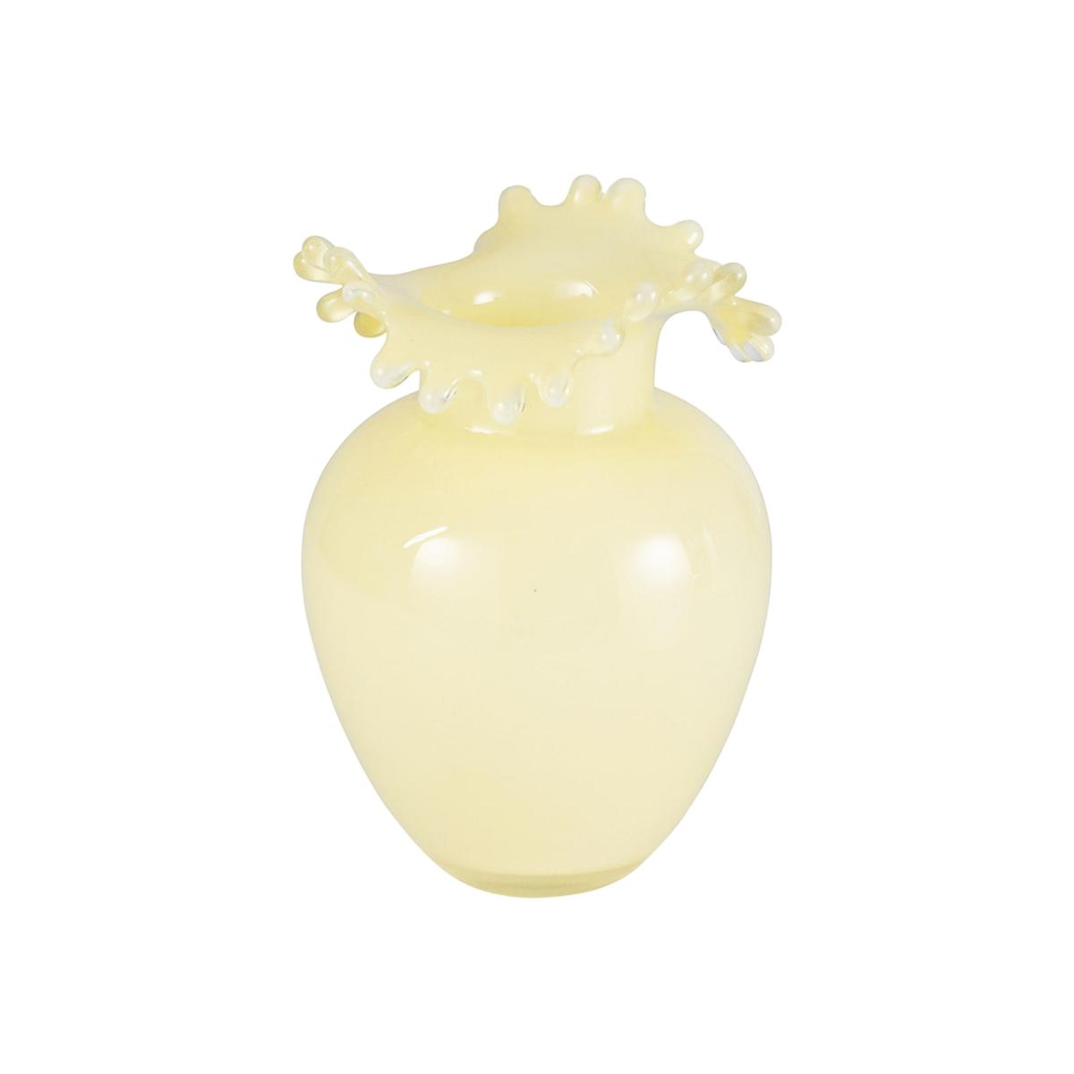 This charming pale yellow glass vase features a classic shape topped with an ornate, flower-like rim. Its soft colour and whimsical design make it a versatile piece that can brighten any room