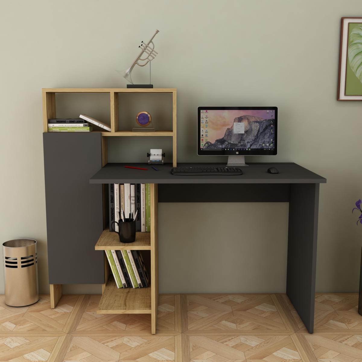 I love this modern desk for its functional design and versatile aesthetic. Its anthracite and wood finish lend it a contemporary yet warm look, making it suitable for a range of interiors from minimalist to industrial. It works well in a compact home office or a studio space, where practicality is key, thanks to the storage shelves and cabinet that help keep your workspace organised. For styling tips, pair it with sleek, understated accessories like a simple desk lamp and organised storage boxes to maintain its clean look. This piece is ideal for balancing style and function, especially if you’re after a contemporary feel with flexible storage options.