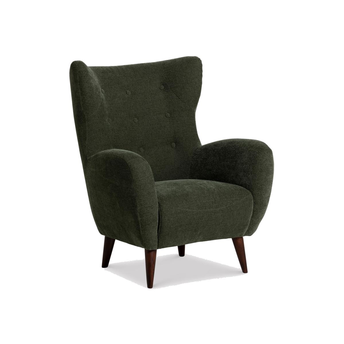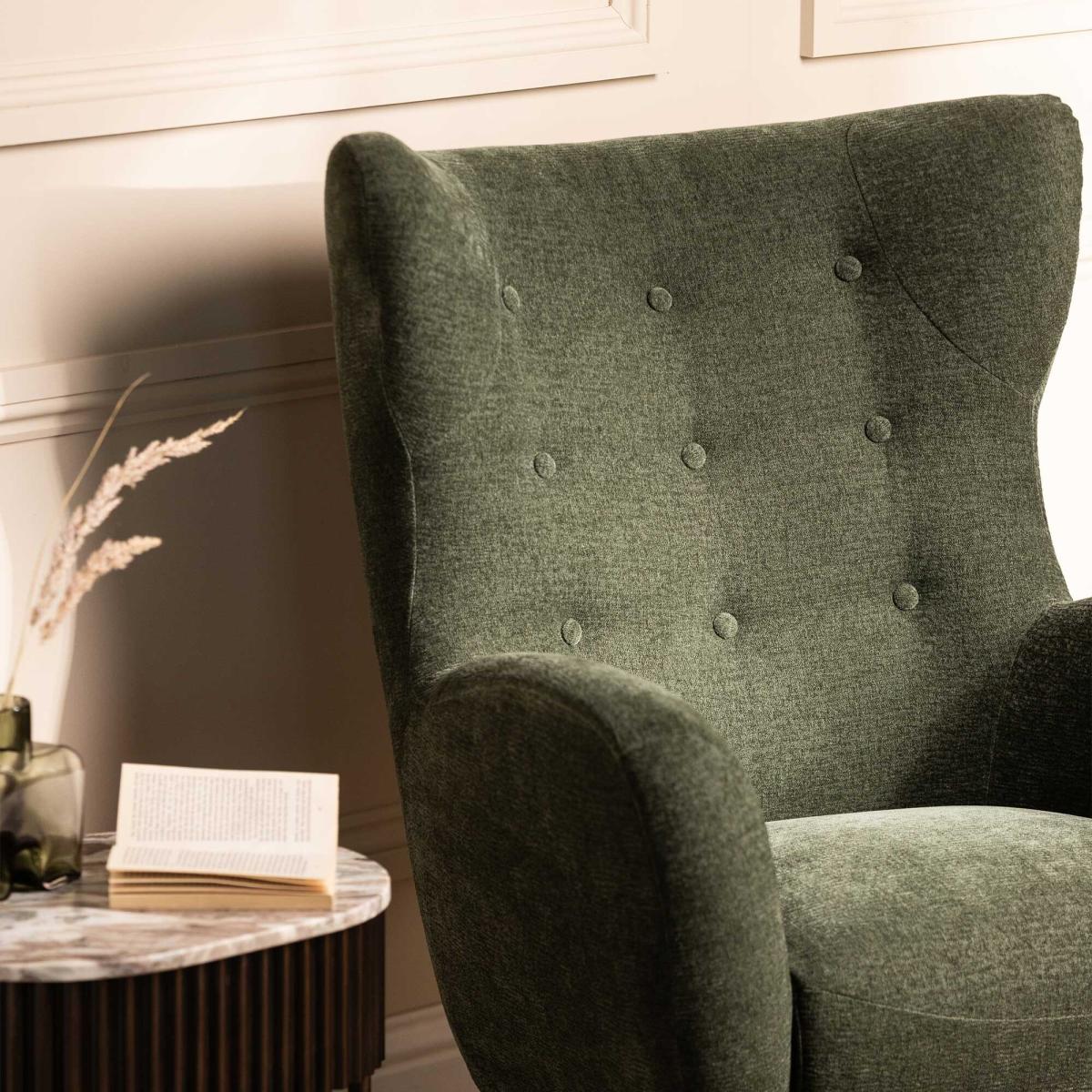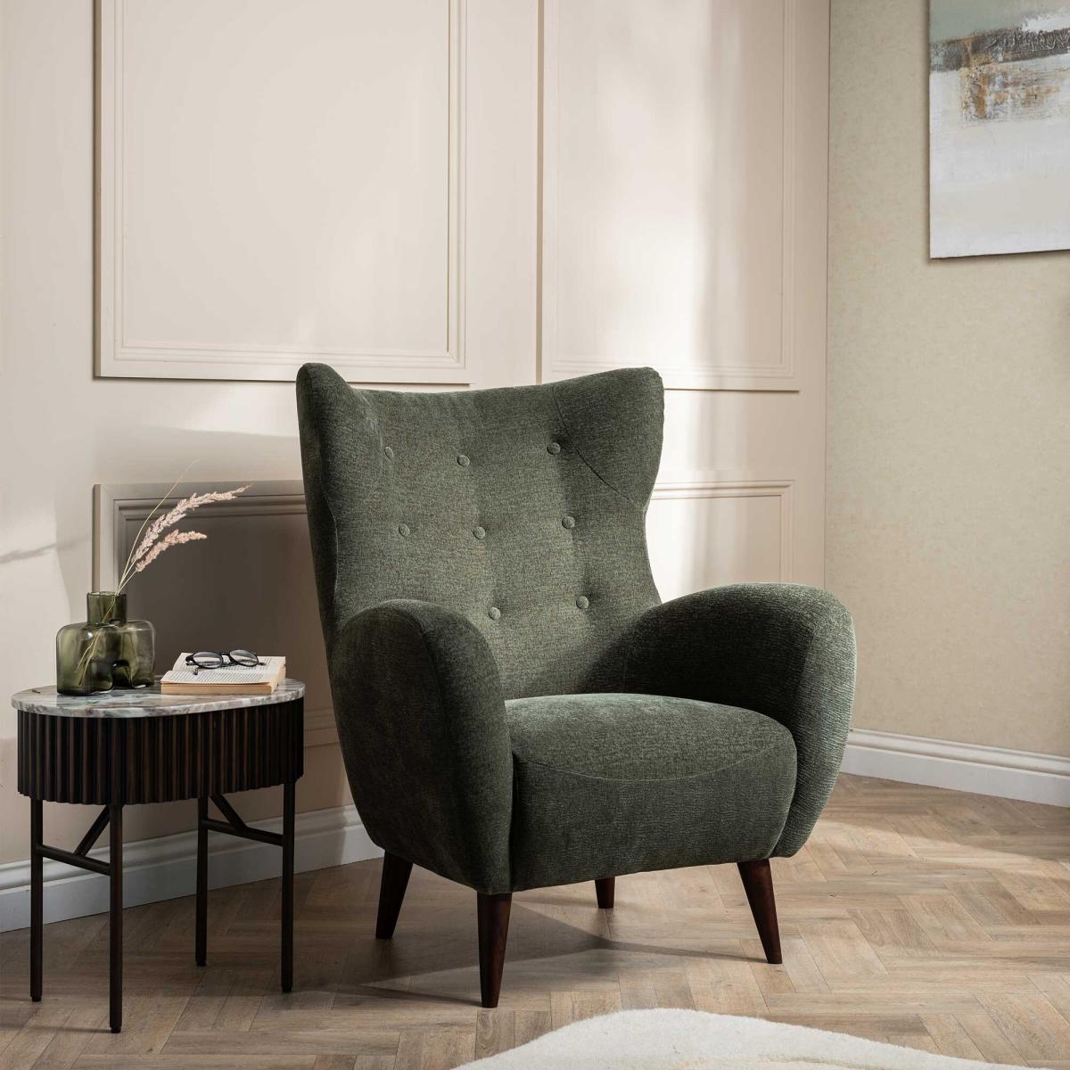 I’m a fan of the Delon chair for its simple wing-back profile and rich forest-green fabric, which adds depth without overwhelming a space. Its slim, tapered legs and subtle button-tufting work well in mid-century, Scandi or contemporary interiors - pair it with warm timber floors and a brass-trimmed side table for balance. For styling, add a light grey linen throw or a geometric cushion to introduce texture, then position alongside a tall floor lamp to create a cosy reading corner. If you’re using it in a living room scheme, echo the green in smaller accent pieces - like a vase or artwork - to tie the look together.