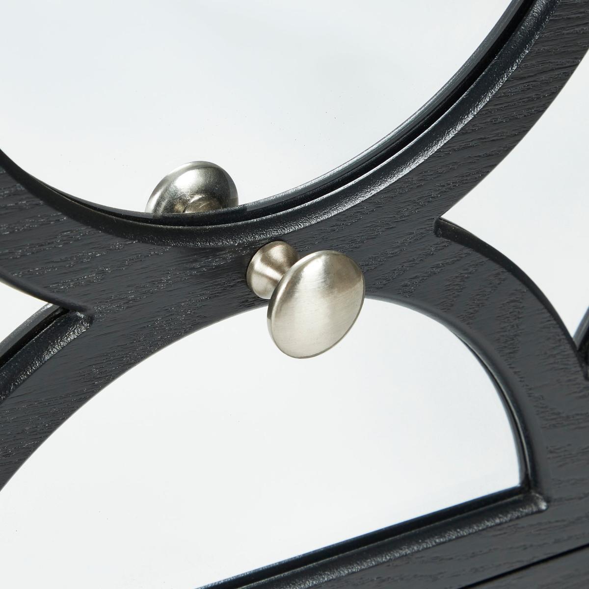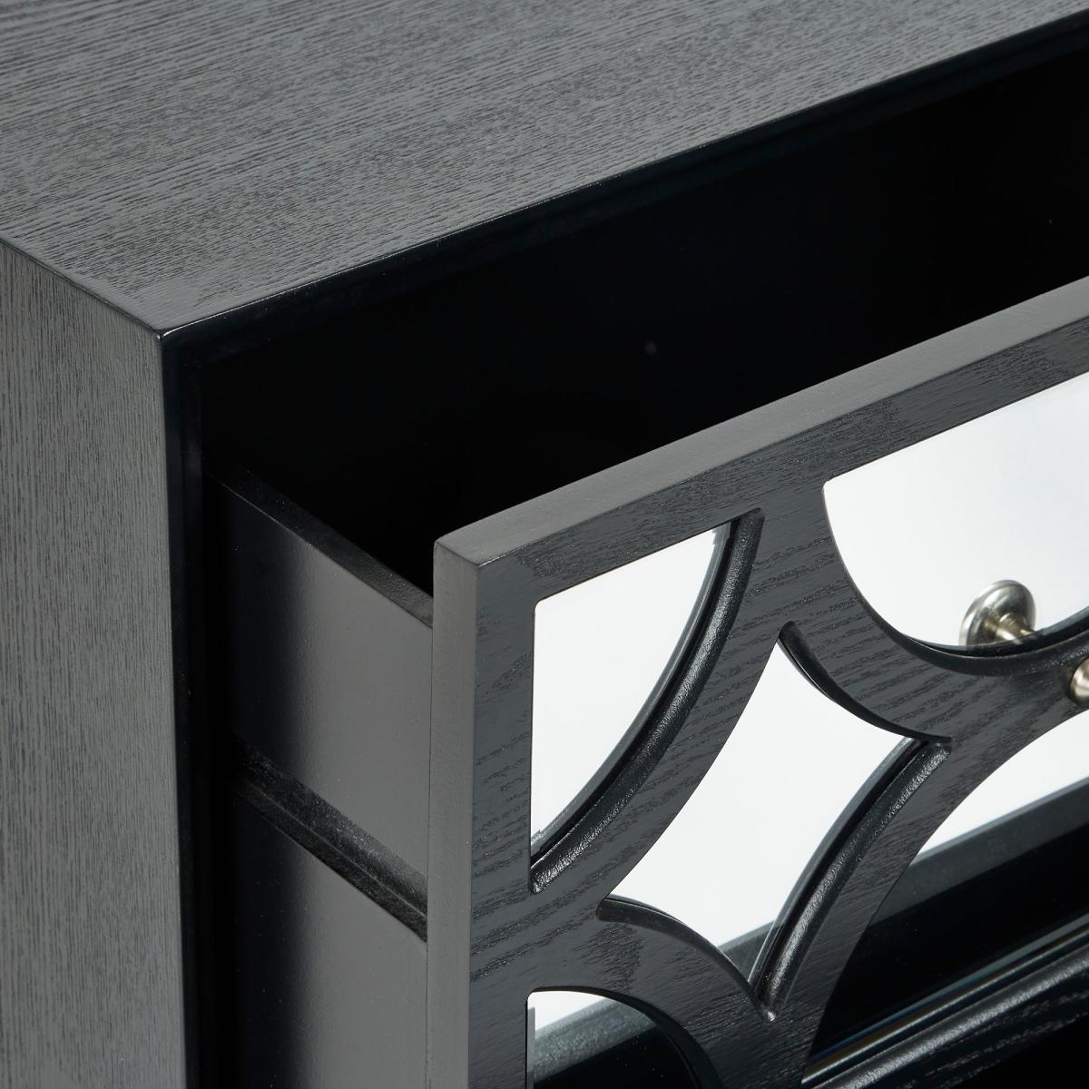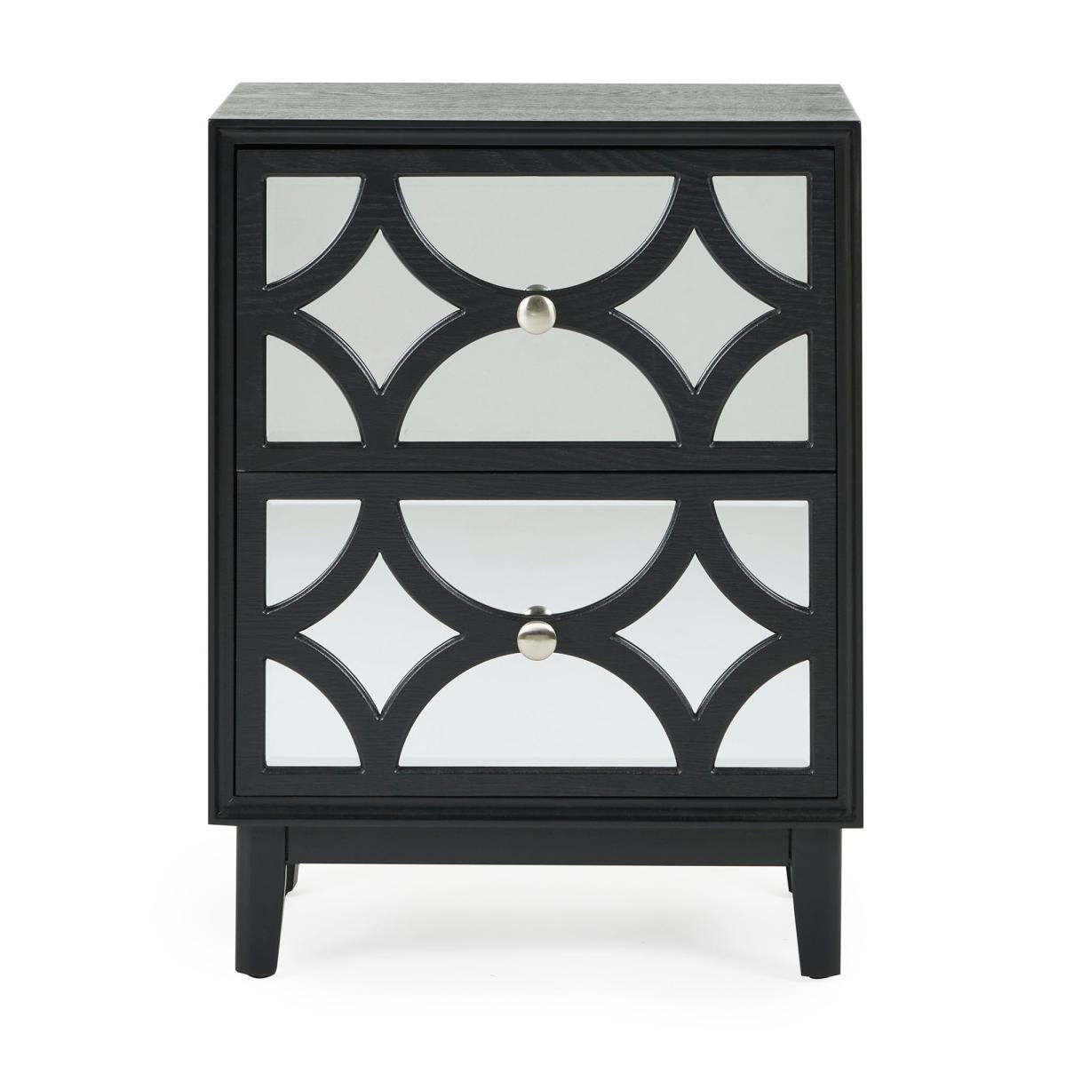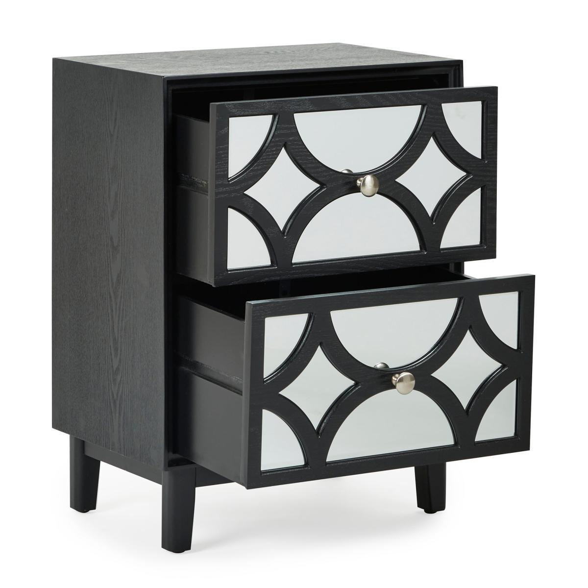 Dunelm Exclusive - Designed and Developed by Dunelm. Stylish and sophisticated, the Delphi collection boasts an elegant styling, perfect for adding a contemporary touch to your home. The gorgeous range is finished in a black coloured ash veneer showcasing the natural wood grain, whilst the carved pattern, mirrored fronts help to brighten your room and give the appearance of a bigger, lighter space. Crafted with solid wood legs, wooden runners and elegant metal handles, the stylish Delphi bedside table features two large drawers and is supplied fully assembled for added convenience. Care Instructions: Avoid prolonged exposure to direct sunlight. Wipe up spills immediately with a damp cloth, avoid common hazards such as harsh solvents or abrasives. Maintain with regular dusting. Clean metal fixtures with mild, soap and water, dry thoroughly. Do not use a brass cleaner as this will damage the lacquer. Item fully assembled.