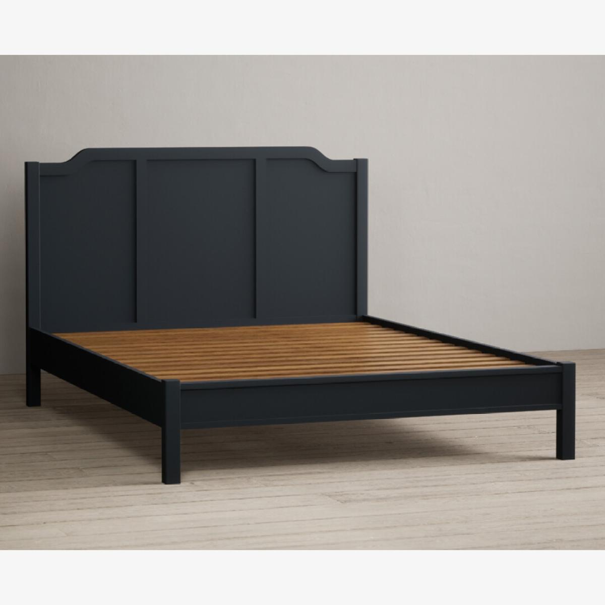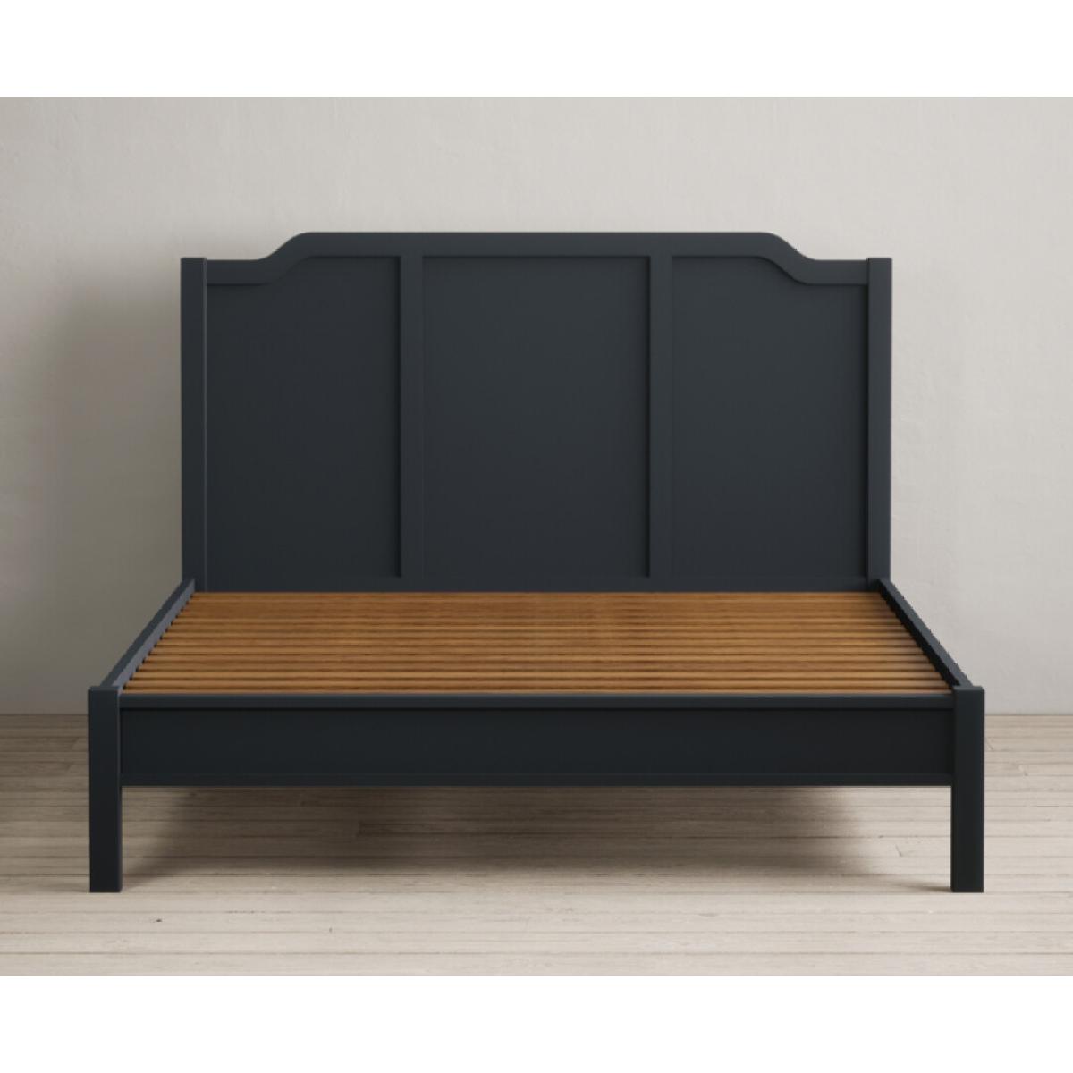 The Delphine Oak and Blue Double Bed is crafted from blue painted solid hardwood, with a high headboard with an ornate design and sturdy solid wood slats.