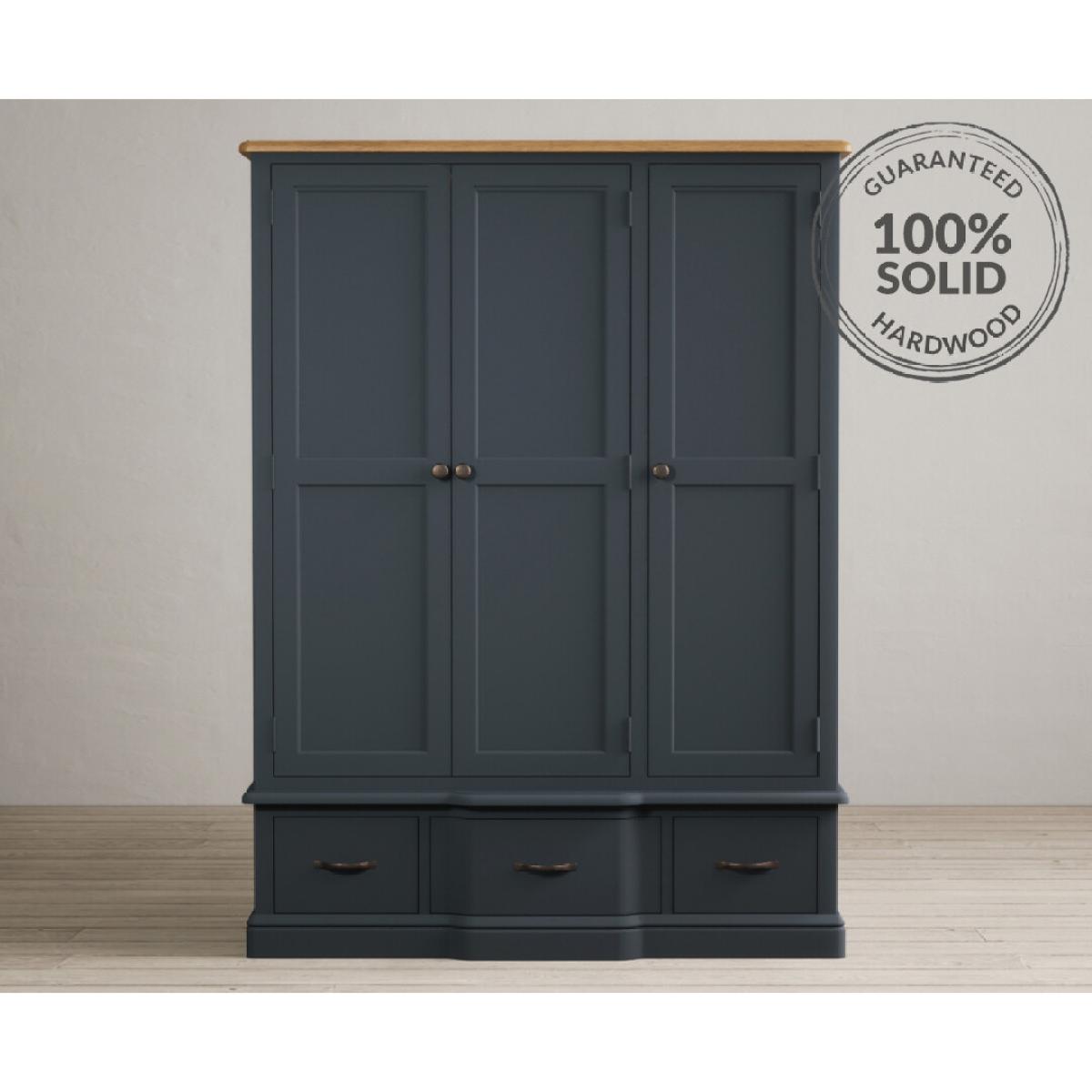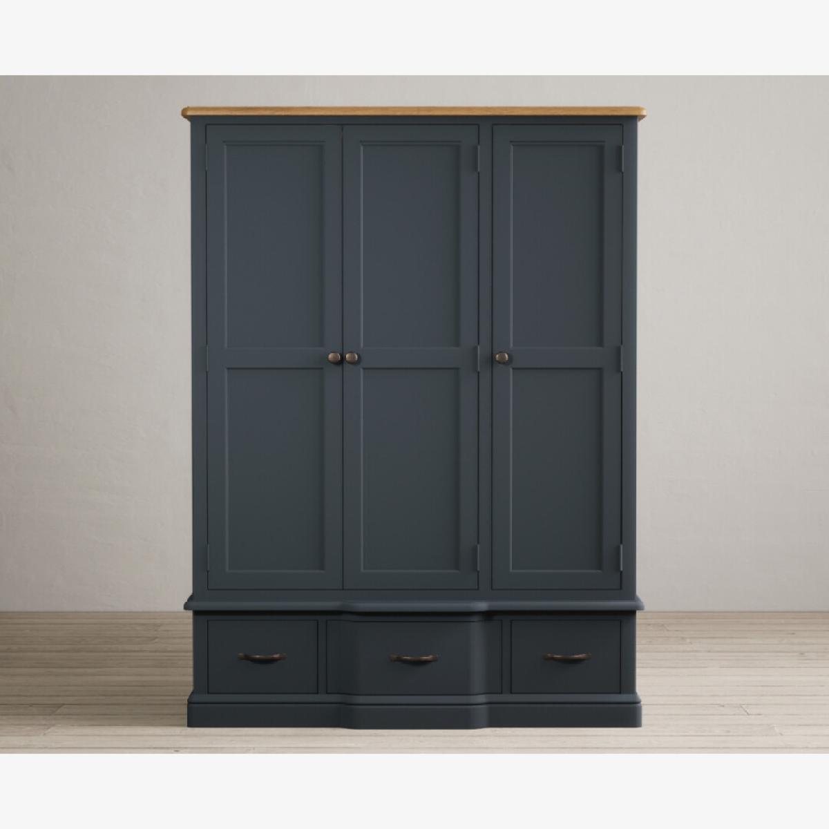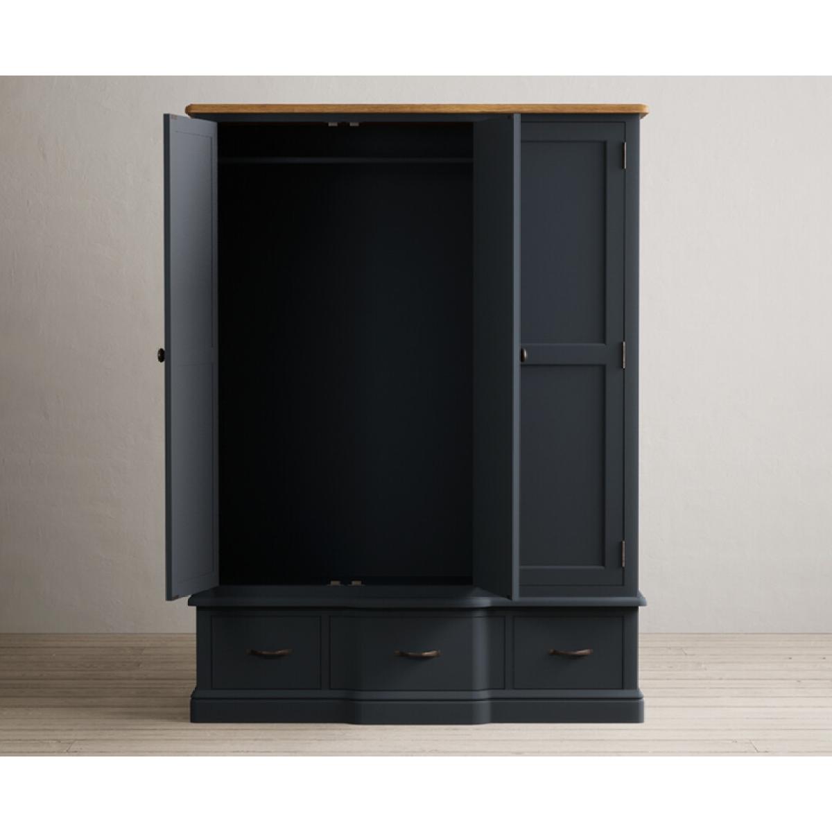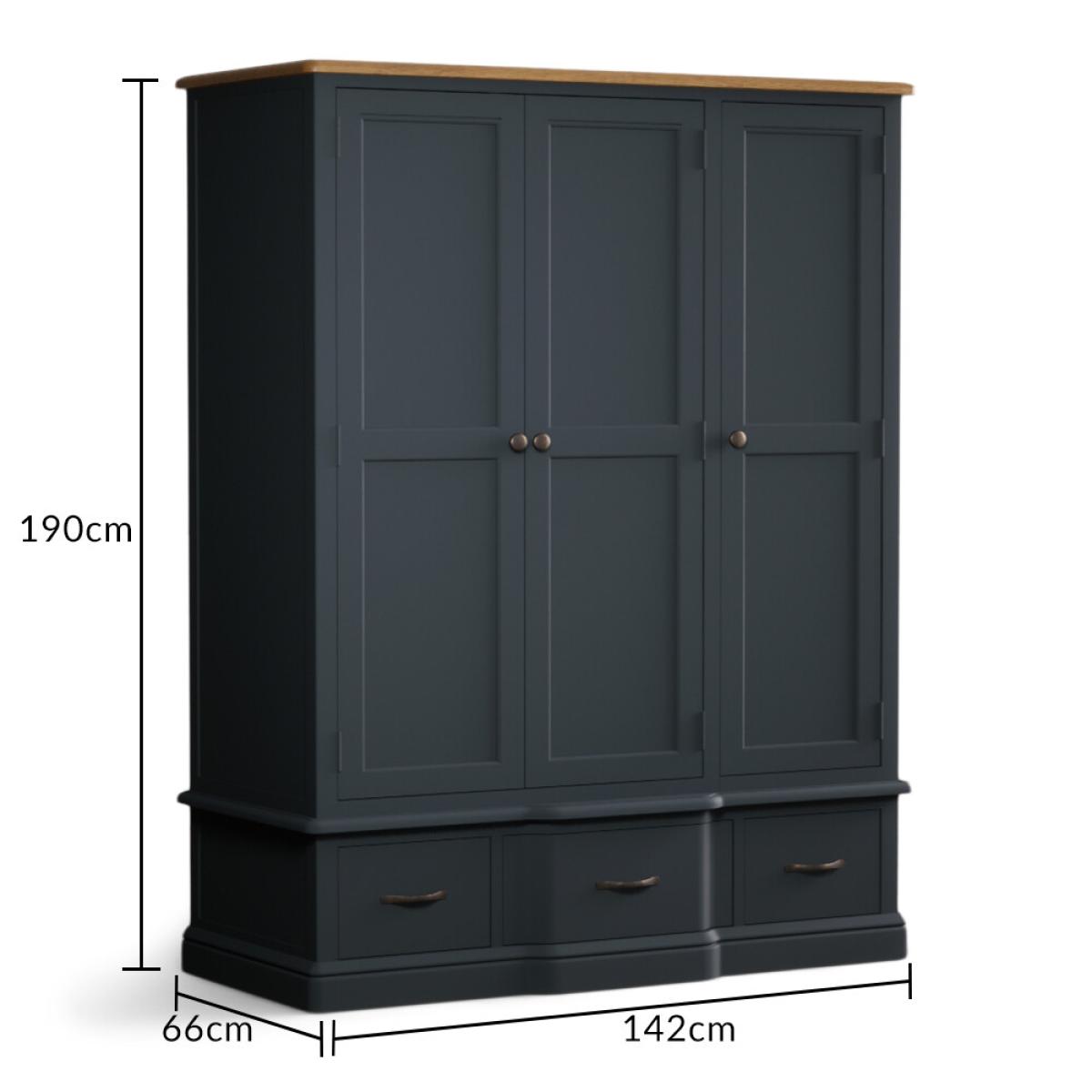 The Delphine Oak and Blue Triple Wardrobe is crafted from blue painted solid hardwood and topped with solid oak, with Dovetail drawers and removable shelves.
