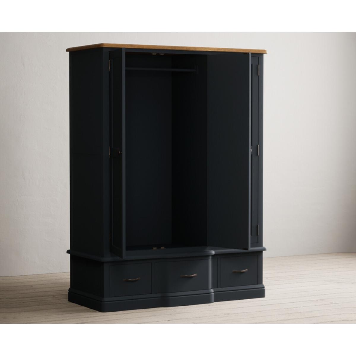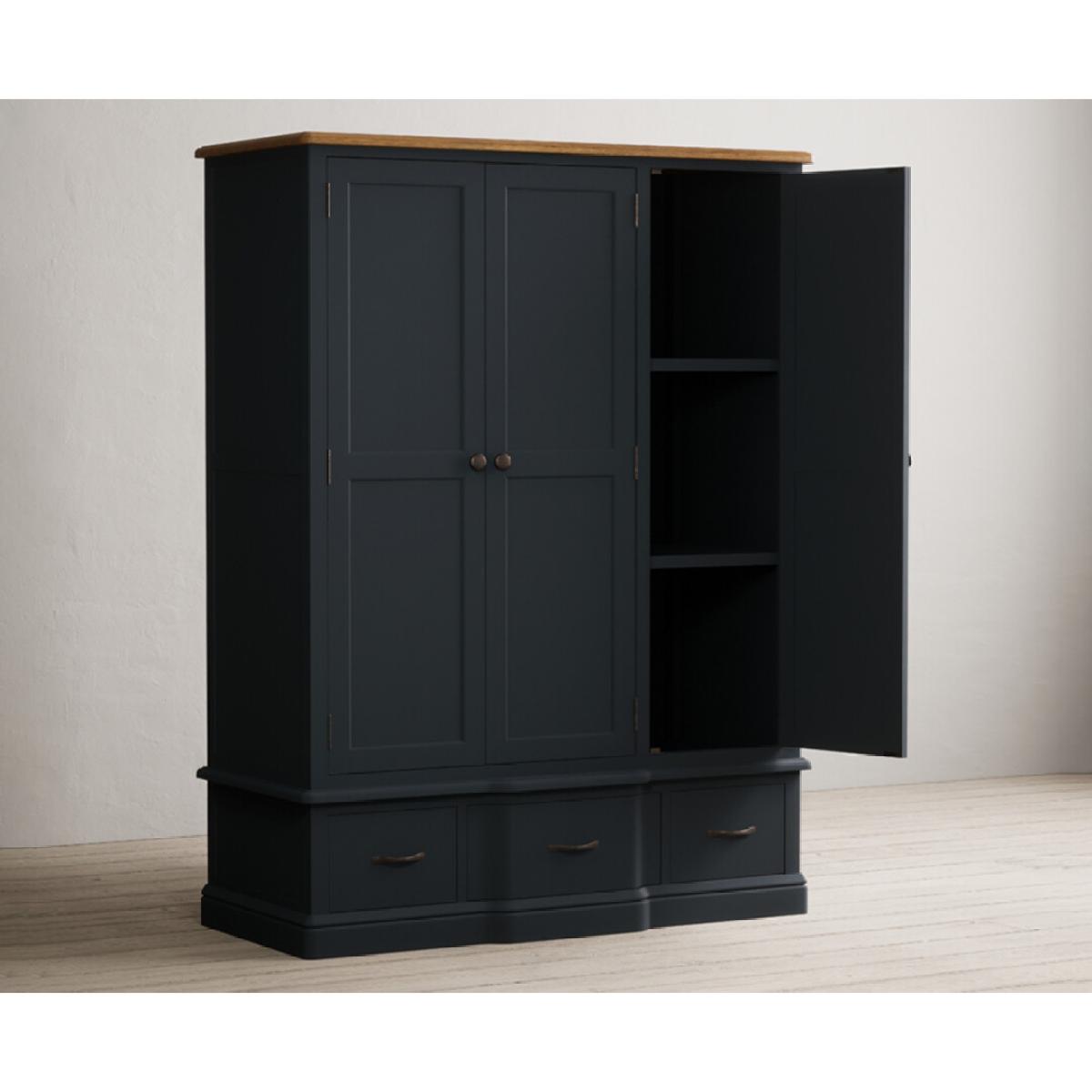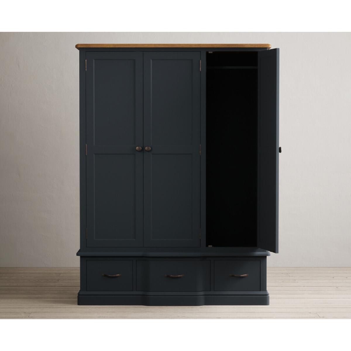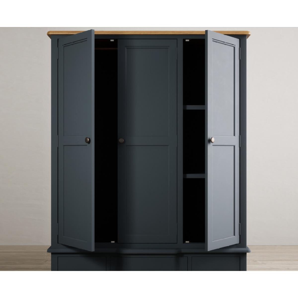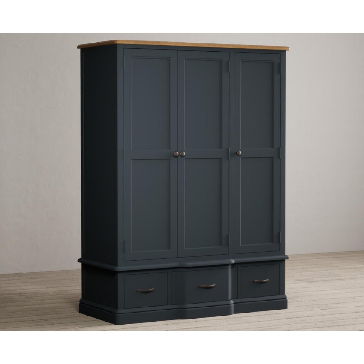 The Delphine Oak and Blue Triple Wardrobe is crafted from blue painted solid hardwood and topped with solid oak, with Dovetail drawers and removable shelves.