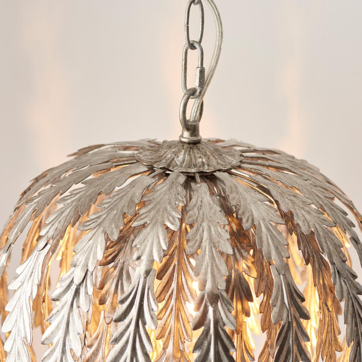 An opulent and ornate silver leaf finished floral pendant light, formed from long floral leaves and suspended from height adjustable chain. Add some gold glamour to your interior, perfect when paired with LED filament lamps to create striking light patterns. This product is dimmable. Other family items available.
