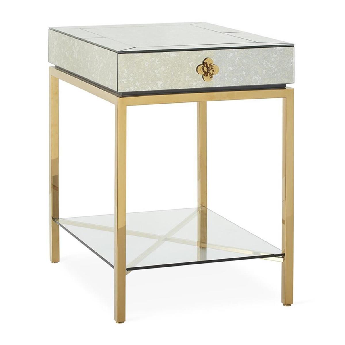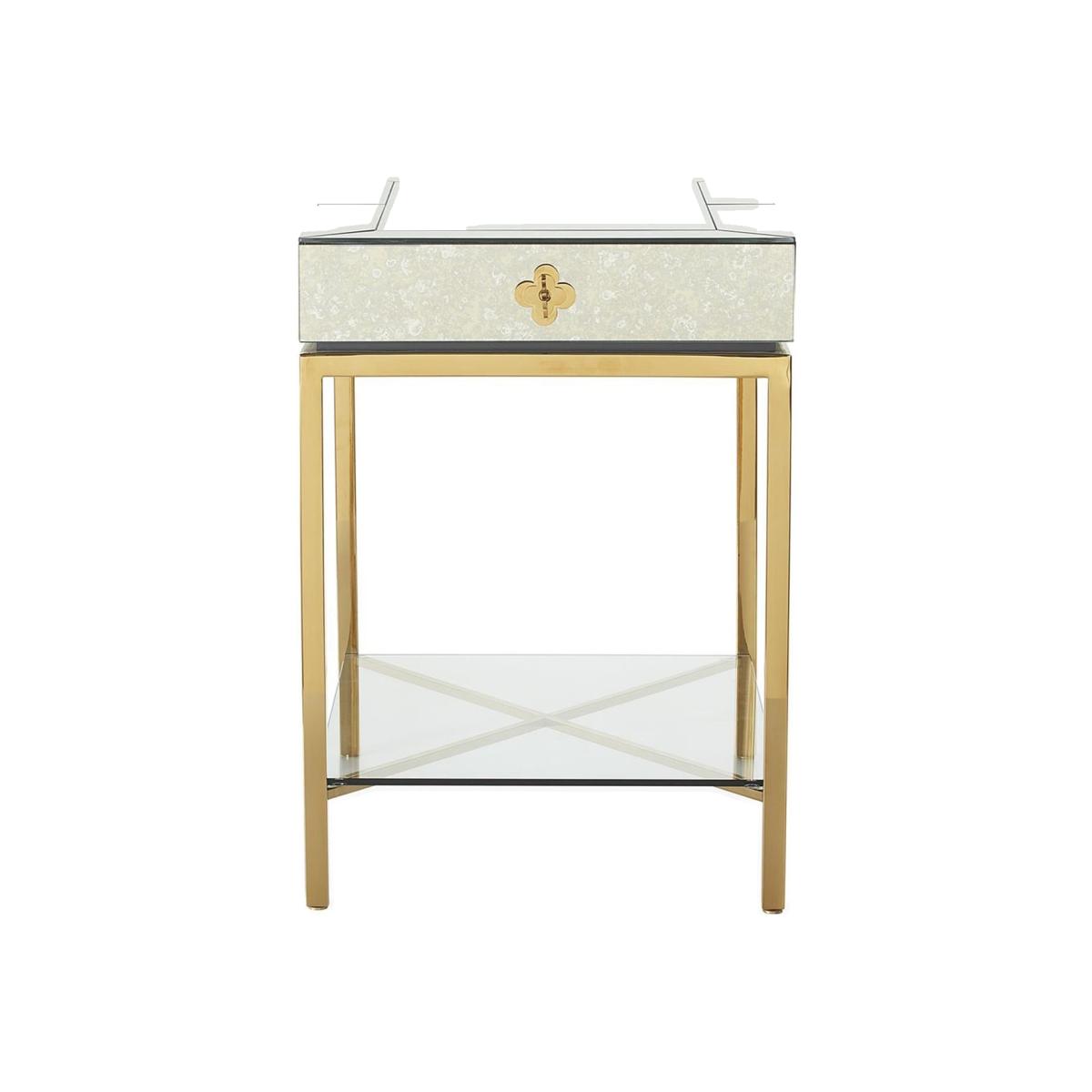 Bring a little luxury into your interior with this Delphine side table from Jonathan Adler. Boasting an antique mirror finish, it features one handy drawer that opens to reveal a Robin’s egg blue lacquer interior. Complete with a polished brass frame and additional glass shelf, this beautiful brass table provides an elegant finishing touch to any space.