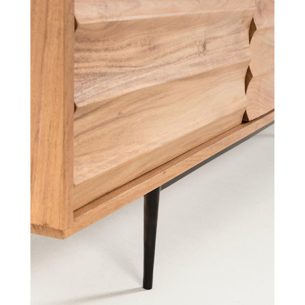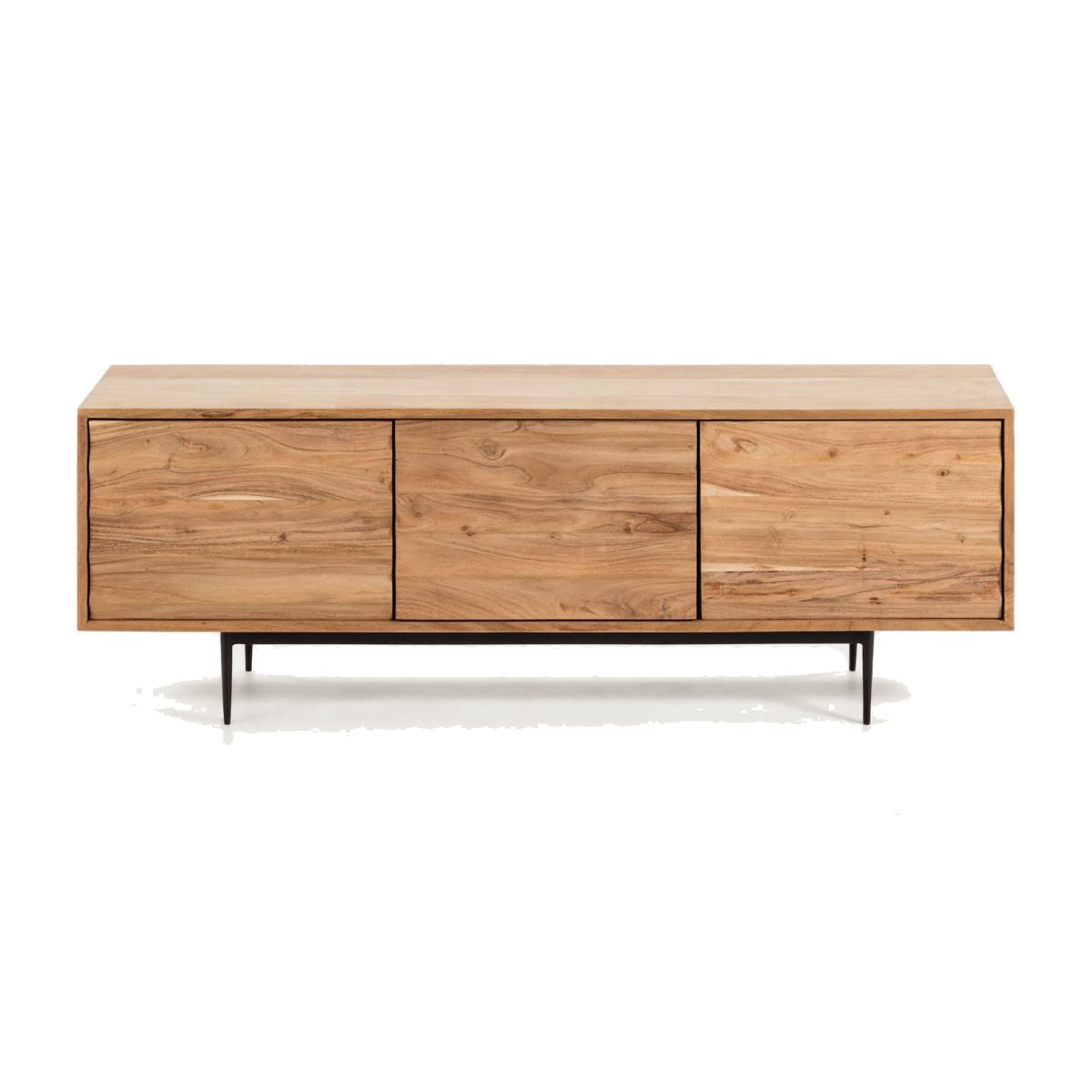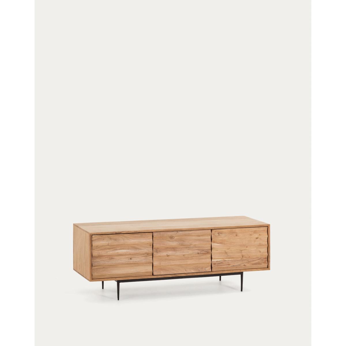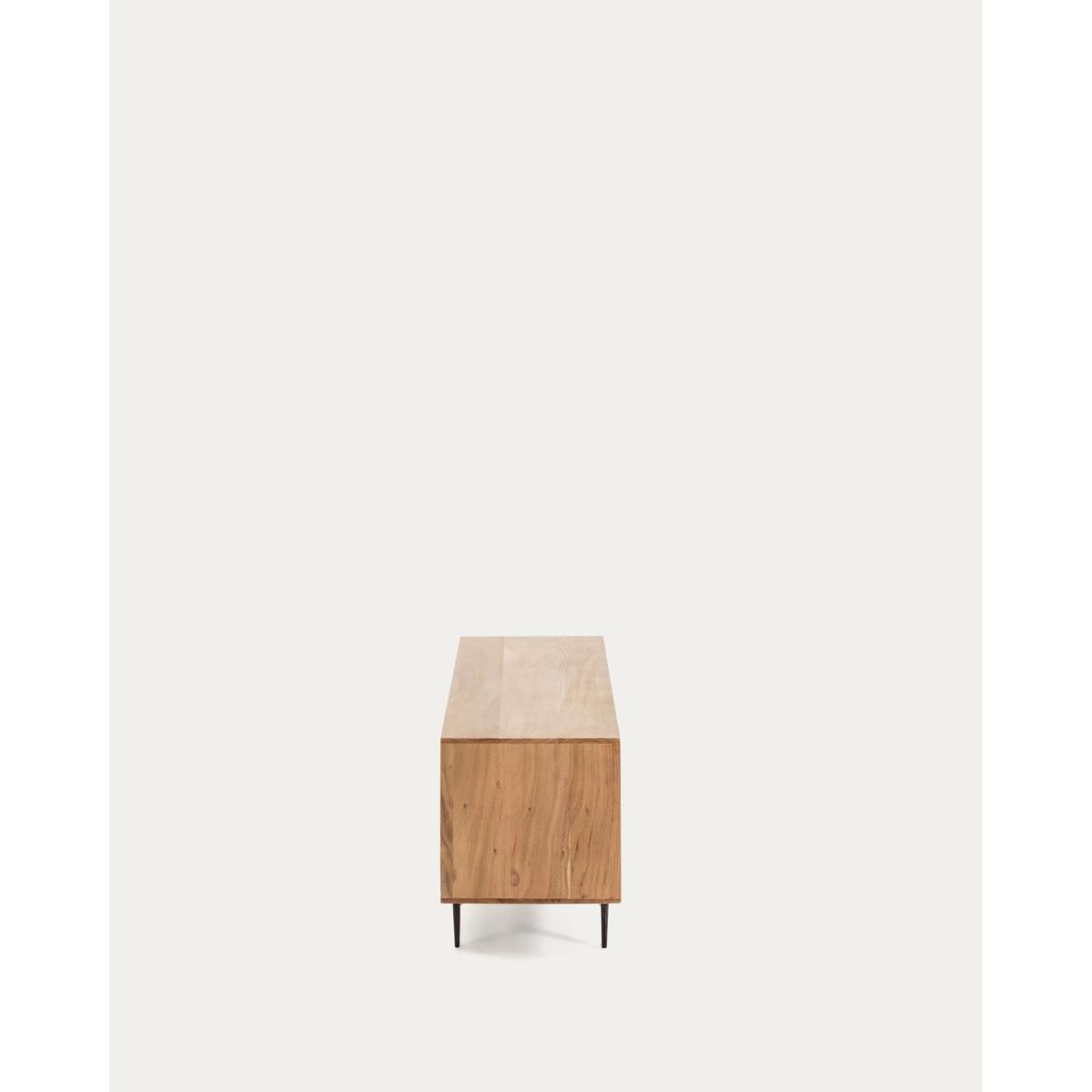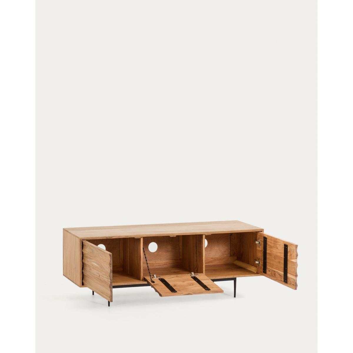 I really love this TV stand for its clean, versatile look and sturdy construction. The solid acacia wood brings natural warmth and texture, making it a great fit for both modern and rustic interiors, while the black steel accents add a contemporary edge. It works particularly well in minimalist, Scandinavian, or industrial schemes, but can also ground a more eclectic space. For styling, consider layers of indoor plants or decorative trays on top to add personality, and keep the cables neat by using the internal space efficiently. Its size makes it ideal for medium to large living rooms, offering ample storage without overwhelming the space. Overall, it’s a practical yet stylish piece that can anchor a living area beautifully.