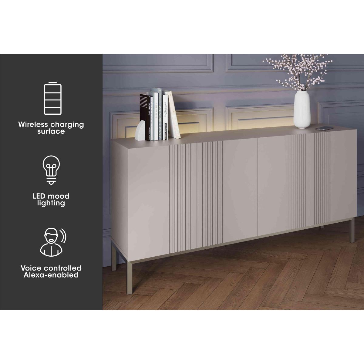 The furniture in our Delta range is beautiful – and this time it’s more than skin deep. A truly innovative range, Delta combines contemporary design with high-tech features that include built-in mood lighting operated via smart speaker or phone app, wireless phone charging, and Intelligent Eye media storage. Technology is seamlessly integrated into a design aesthetic that makes a quiet statement. Clean and linear, pieces have a painted satiny finish with subtle fluting detail and brushed nickel legs. All that plus spacious well-designed storage. The Delta range is only available online at Furniture Village. Here’s the ultimate sideboard – spacious, stylish and packed with high-tech features that enhance its functionality including built-in mood lighting and wireless phone charging. Why you'll love it There’s so much more to this 4-door sideboard than meets the eye. The ultimate in contemporary furniture design. Built-in mood uplighting controlled via smart speaker or phone app. Discrete wireless phone charging point. Painted top and front with smooth satin finish. Fluted door fronts and brushed nickel base. In a choice of stylish colours. Seamless interior finish in the same colour. Easy click-together self-assembly. A Furniture Village online exclusive. This 4-door sideboard is part of the Delta range. What you need to know 2 double-door cupboards each with 1 adjustable shelf. The finish may show small surface scratches, a result of the finishing process. Do not place in direct sunlight. Do not use abrasive cleaning products. Wipe clean with a damp cloth, and dry with a soft duster. We recommend using coasters and placemats. WARNING!