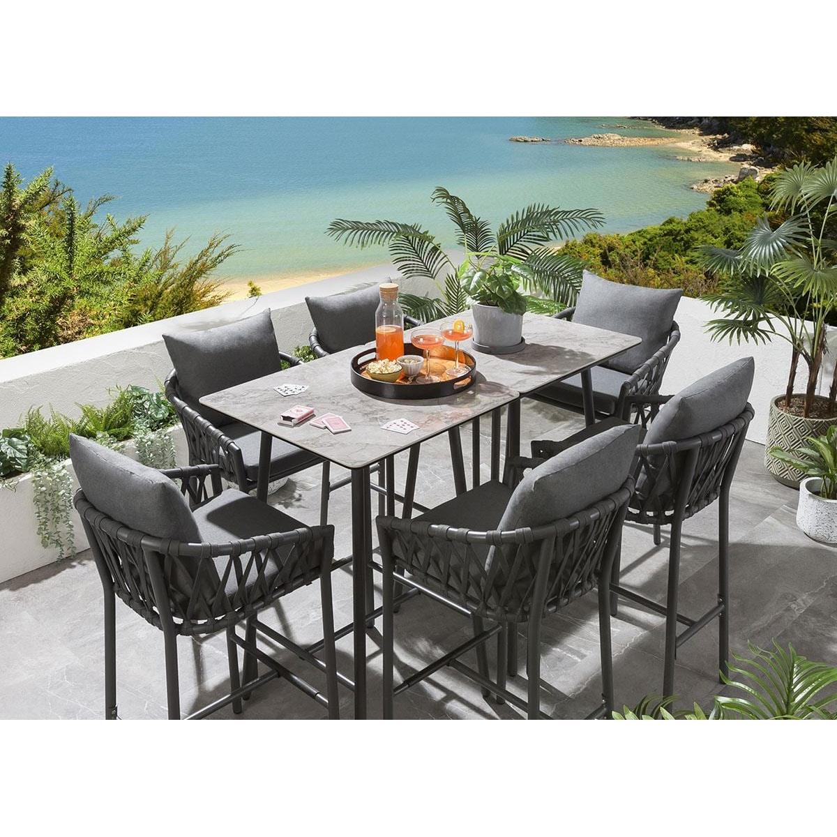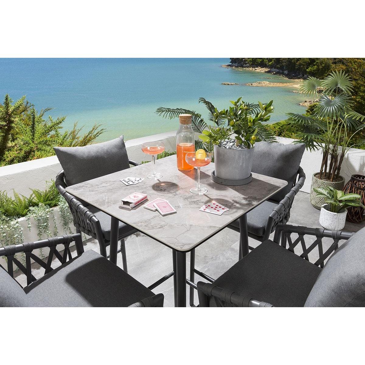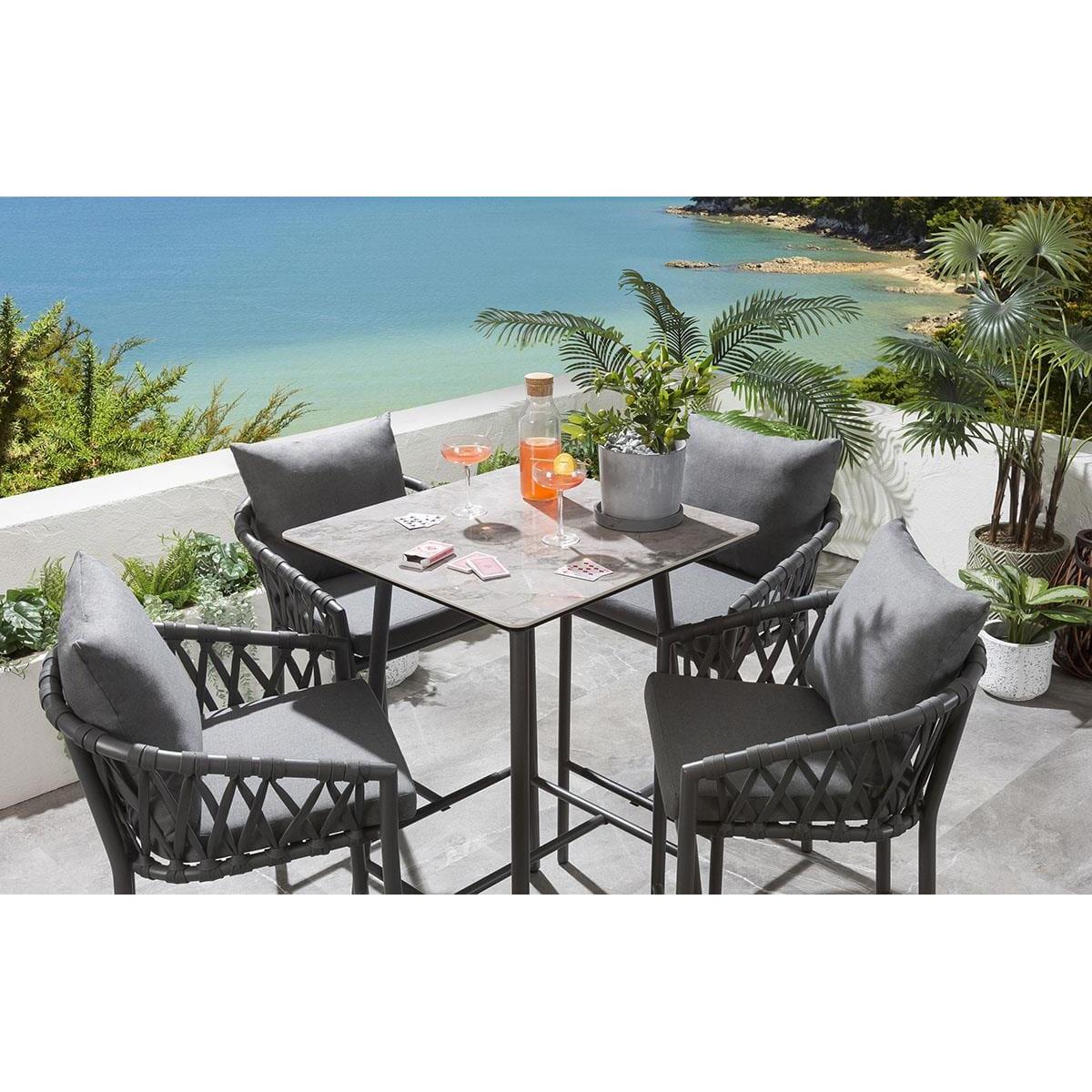 Our hard-wearing and spacious ceramic 70cm square garden high bar table makes a perfect addition to any contemporary, modern or minimalist outdoors, providing enough space for up to four people to enjoy the sunshine in comfort. The 120cm tall bar table is made from robust and ultra-durable ceramic in a natural smooth grey marble-effect finish, atop a hard-wearing grey aluminium metal frame - which are set to last for years to come. Expertly crafted aluminium frames are highly durable, complemented by clean lines that lend contemporary style. It is robust and weather-resistant for outdoor use & aluminium frames will not rust and are lightweight to move around. If you need more information about this product, use the Live Chat service to speak to the team or send us a message. Spread the cost our with interest-free finance options. Minimum spend applies. W70cm D70cm H120cm 4 Seater Grey Ceramic Marble Effect Garden Bar Table Adjustable Feet