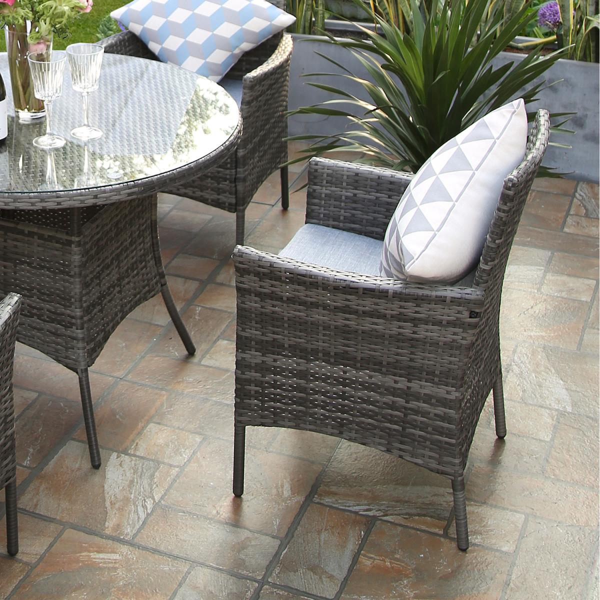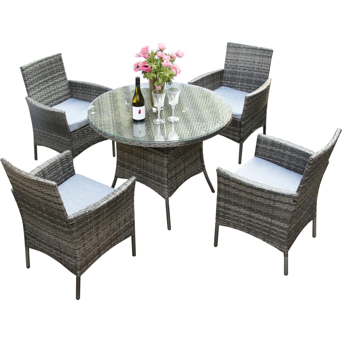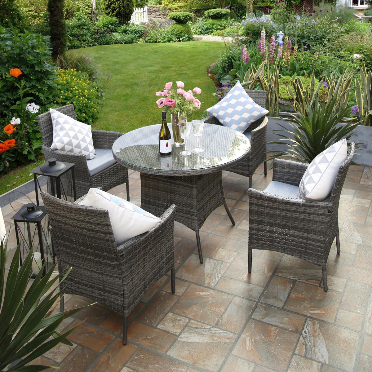 Introducing our stunning rattan garden furniture set, perfect for those who love to spend time in their outdoor space. Made from high-quality, weather-resistant rattan material, this set is both durable and stylish. The neutral colour palette will blend seamlessly with any garden or patio decor, making it the perfect addition to your outdoor oasis. This set includes a four armchairs, and a large, round, glass topped table, providing ample seating space for you and your guests. The armchairs feature plush cushions, ensuring comfort and support while you relax. The table top is made from tempered glass, making it easy to clean and maintain. This rattan garden furniture set is designed with convenience in mind. The lightweight design makes it easy to move around, while the compact size means it will fit even in smaller outdoor spaces. The furniture is also low maintenance, a simple wipe down with a damp cloth is all it takes to keep it looking its best. Invest in quality, style, and comfort with our rattan garden furniture set. Whether you're looking for a place to enjoy your morning coffee, read a book, or host a garden party, this set is the perfect solution. Order yours today and transform your outdoor space into a stylish and inviting retreat!