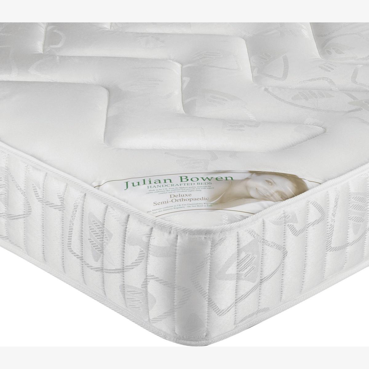 This Julian Bowen Deluxe Semi-Orthopaedic Mattress has a soft gauge Bonnell spring unit making it perfect for those who enjoy relaxing in luxury. Its cover has been stitched with oyster damask marking to ensure maximum cosiness, whilst the rod edge support maintains the mattress' shape and prolongs its life. The polyester filling and the spring insulator will ensure the coils will stay in place, adding to the comfortable design.
