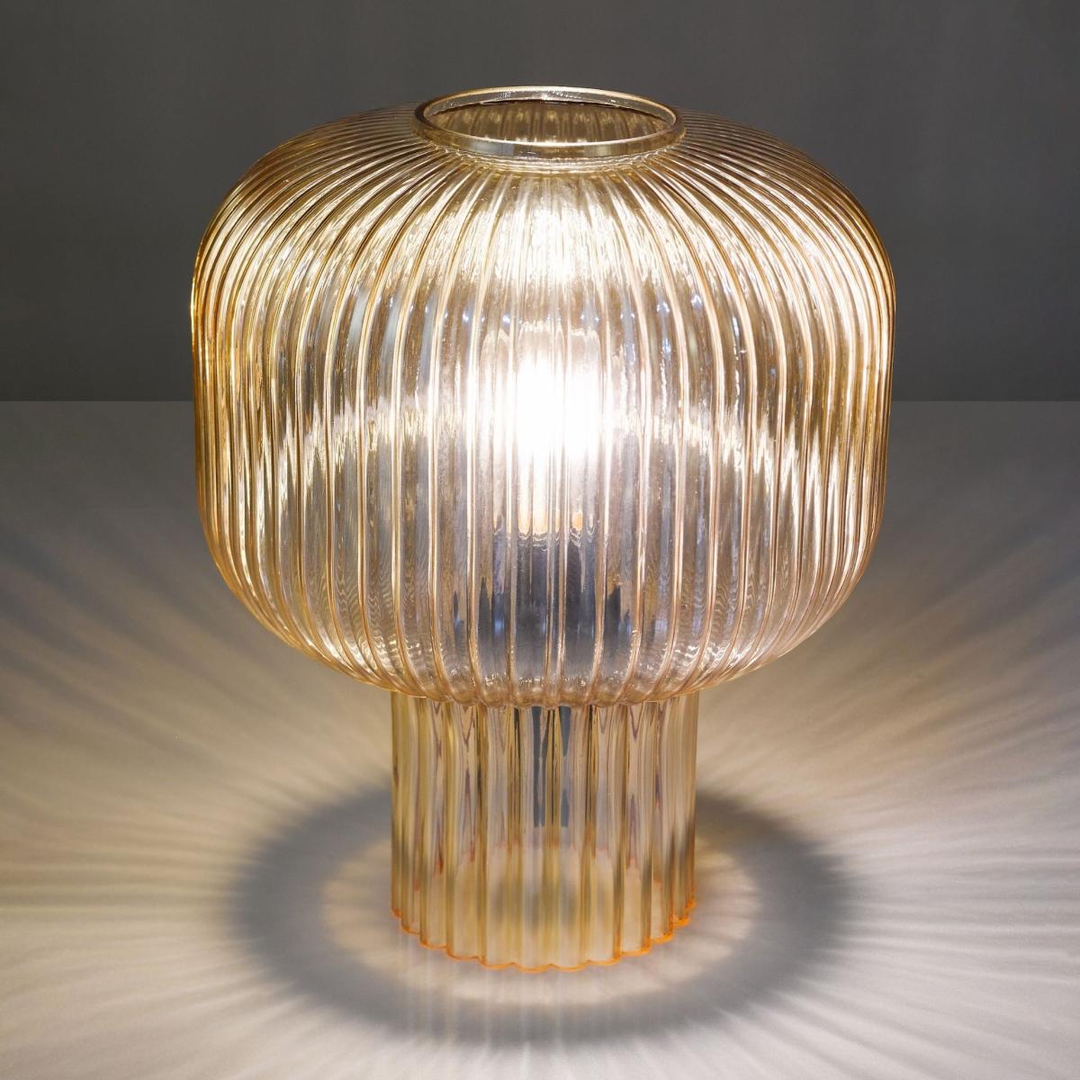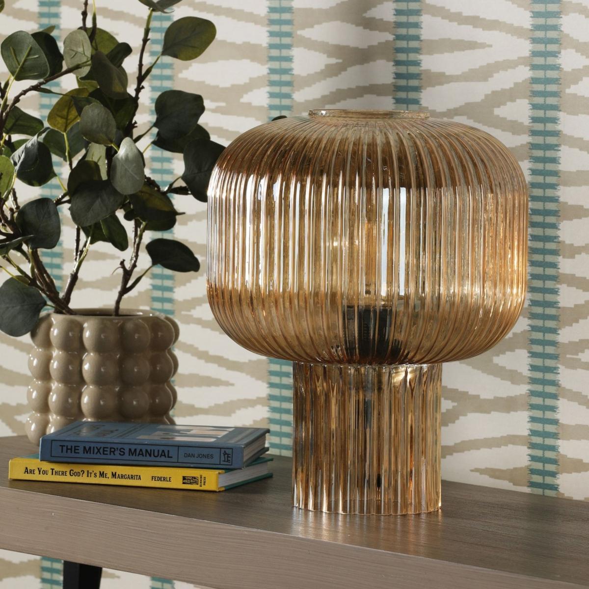 Demarius 1-light table lamp, made from ribbed amber glass. The Demarius table lamp brings warmth and sophistication to your space with its stunning ribbed amber glass construction. The textured design of the glass creates a beautiful interplay of light and shadow, casting a soft, inviting glow that enhances the ambiance of any room. Perfect for adding a touch of elegance to side tables, desks or nightstands, this lamp offers both functional lighting and a stylish decor accent. The rich amber hue and timeless design make the Demarius table lamp a versatile piece that complements a variety of interior styles, from mid-century modern to contemporary. Demarius 1-light table lamp, made from ribbed amber glass. The Demarius table lamp brings warmth and sophistication to your space with its stunning ribbed amber glass construction. The textured design of the glass creates a beautiful interplay of light and shadow, casting a soft, inviting glow that enhances the ambiance of any room. Perfect for adding a touch of elegance to side tables, desks or nightstands, this lamp offers both functional lighting and a stylish decor accent. The rich amber hue and timeless design make the Demarius table lamp a versatile piece that complements a variety of interior styles, from mid-century modern to contemporary.