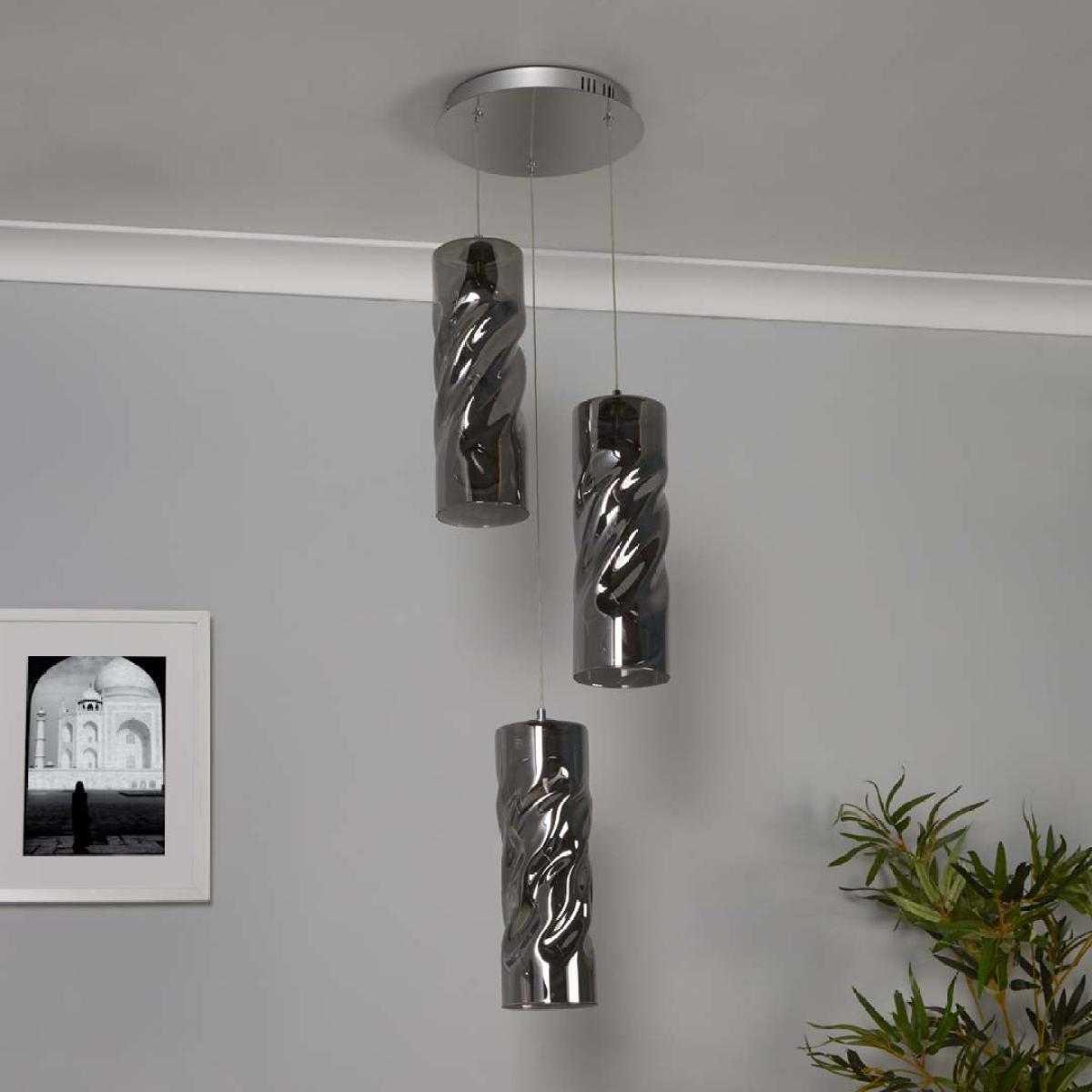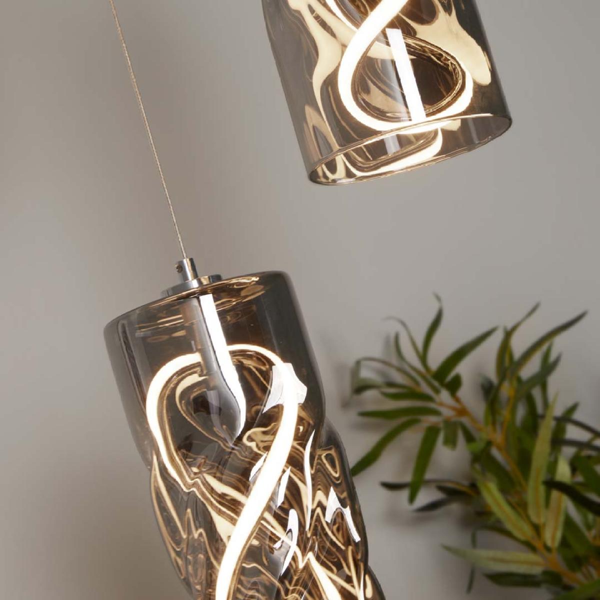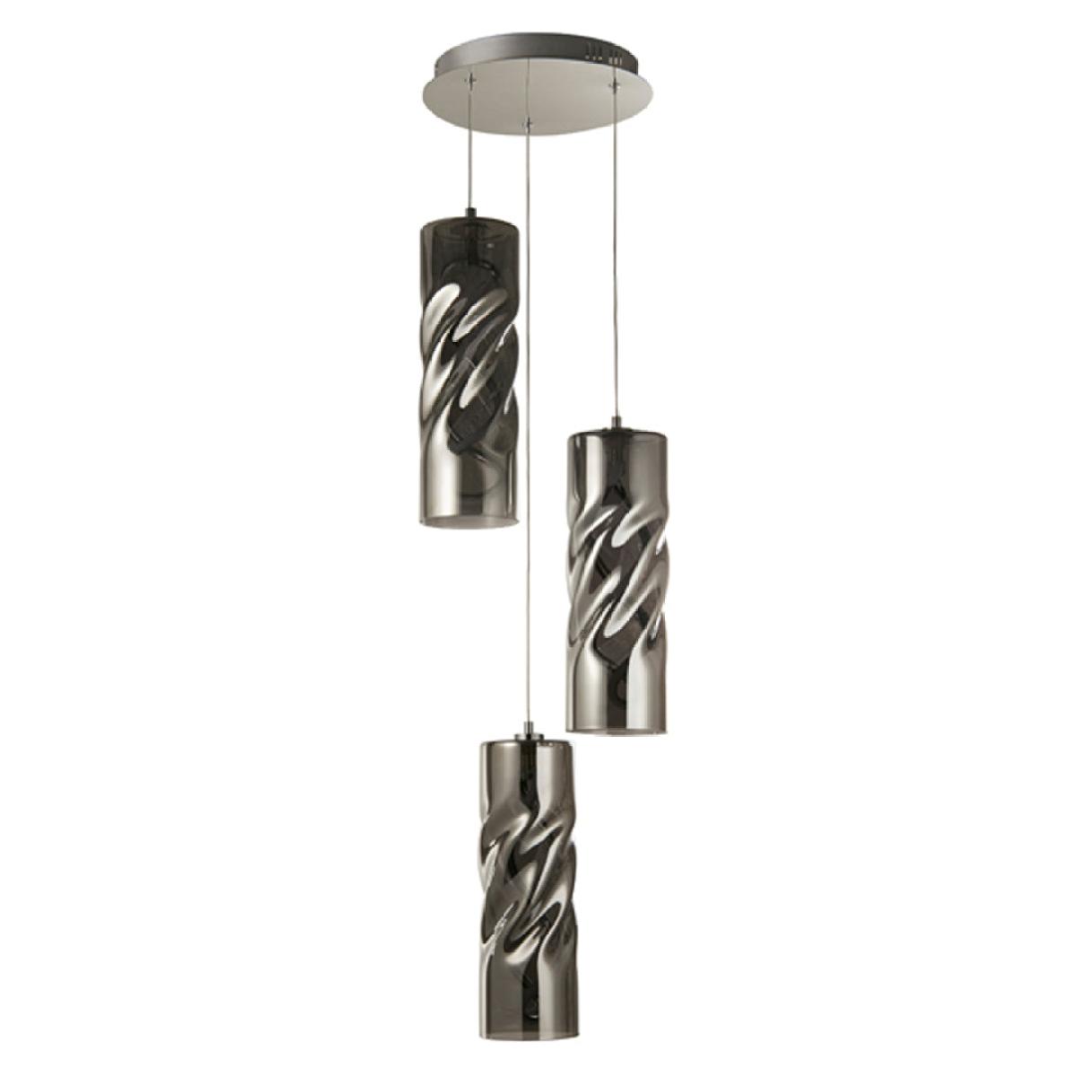 The Demeter 3-light LED Smoke Glass Cylinder Multi-drop showcases a sleek blend of mild steel and silicon in chrome and white finishes. Highlighted by its contemporary twisted glass effect, the smoked glass shades create a captivating and eye-catching focal point. With an adjustable mechanism and an integrated LED strip, this lighting solution provides optimal convenience and functionality. The Demeter 3-light LED Smoke Glass Cylinder Multi-drop showcases a sleek blend of mild steel and silicon in chrome and white finishes. Highlighted by its contemporary twisted glass effect, the smoked glass shades create a captivating and eye-catching focal point. With an adjustable mechanism and an integrated LED strip, this lighting solution provides optimal convenience and functionality.