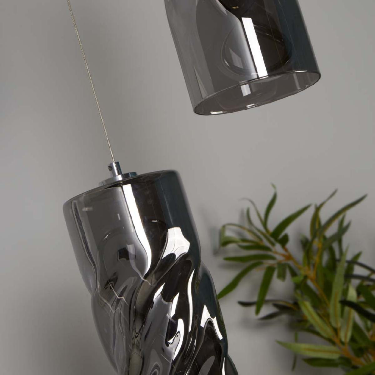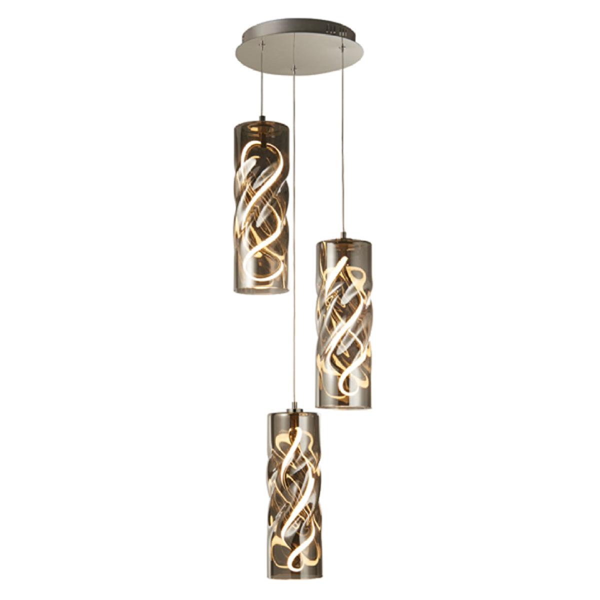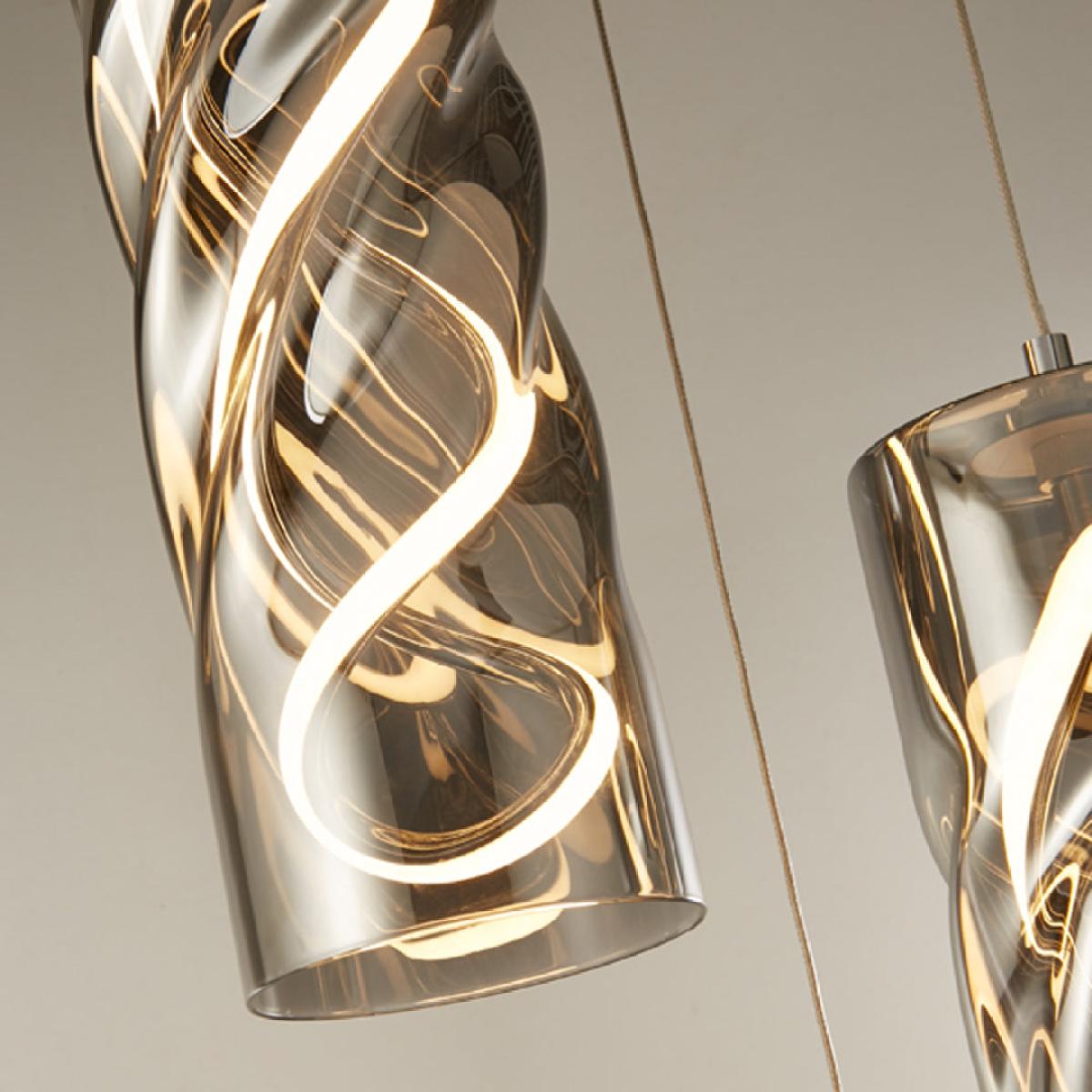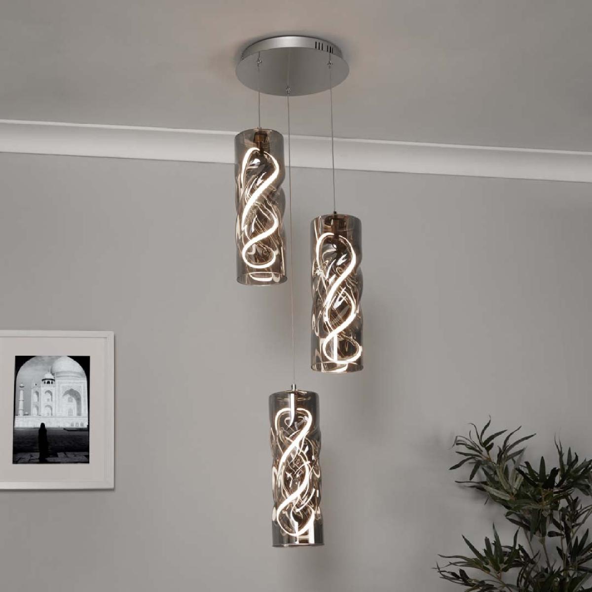 The Demeter 3-light LED Smoke Glass Cylinder Multi-drop showcases a sleek blend of mild steel and silicon in chrome and white finishes. Highlighted by its contemporary twisted glass effect, the smoked glass shades create a captivating and eye-catching focal point. With an adjustable mechanism and an integrated LED strip, this lighting solution provides optimal convenience and functionality. The Demeter 3-light LED Smoke Glass Cylinder Multi-drop showcases a sleek blend of mild steel and silicon in chrome and white finishes. Highlighted by its contemporary twisted glass effect, the smoked glass shades create a captivating and eye-catching focal point. With an adjustable mechanism and an integrated LED strip, this lighting solution provides optimal convenience and functionality.