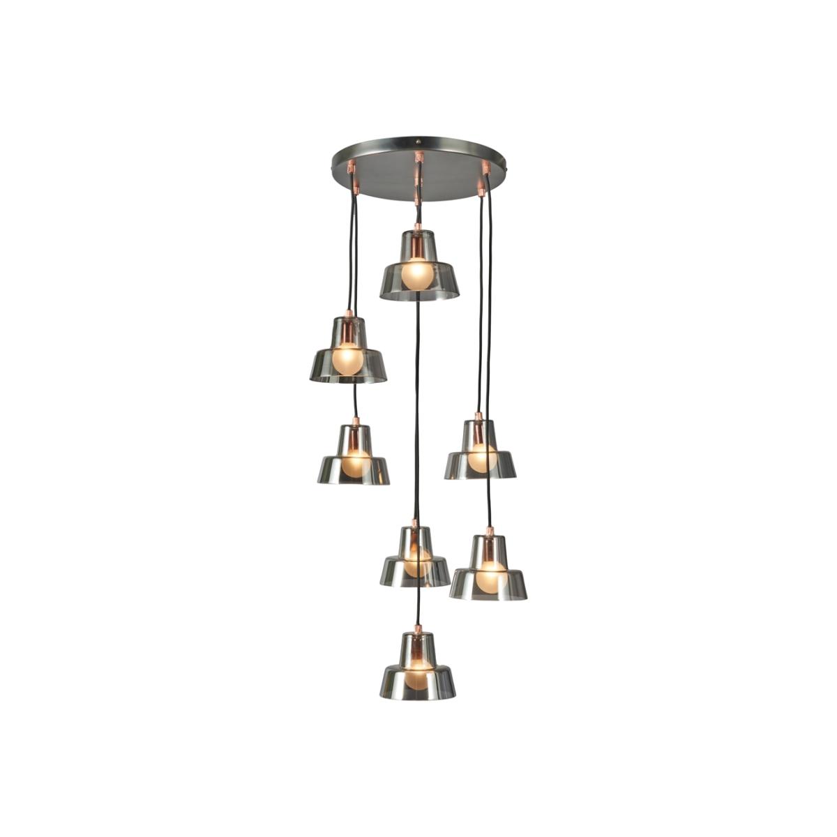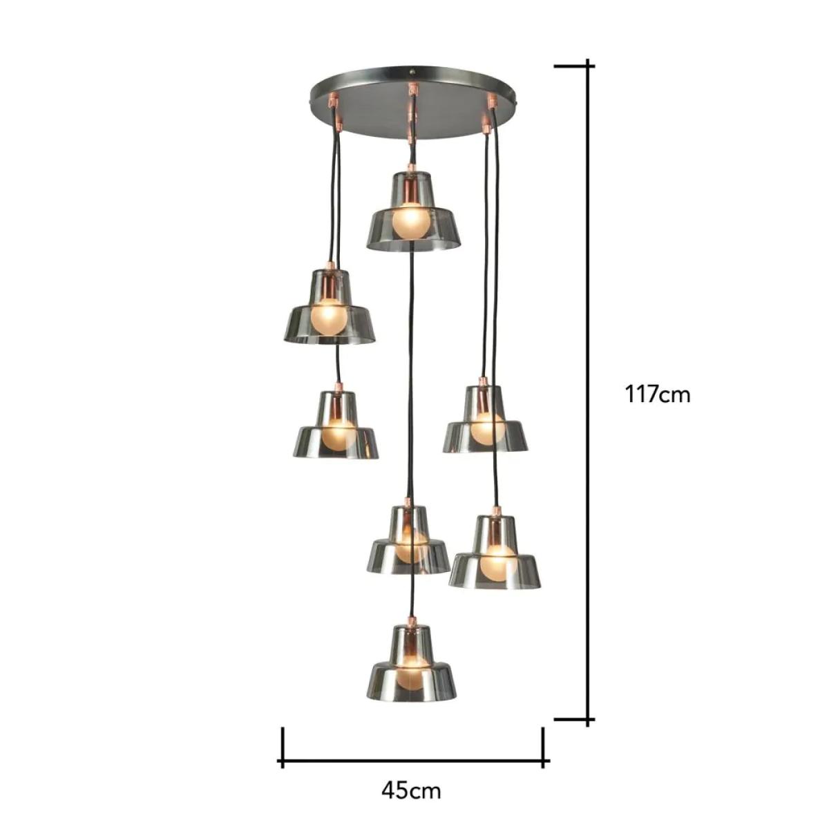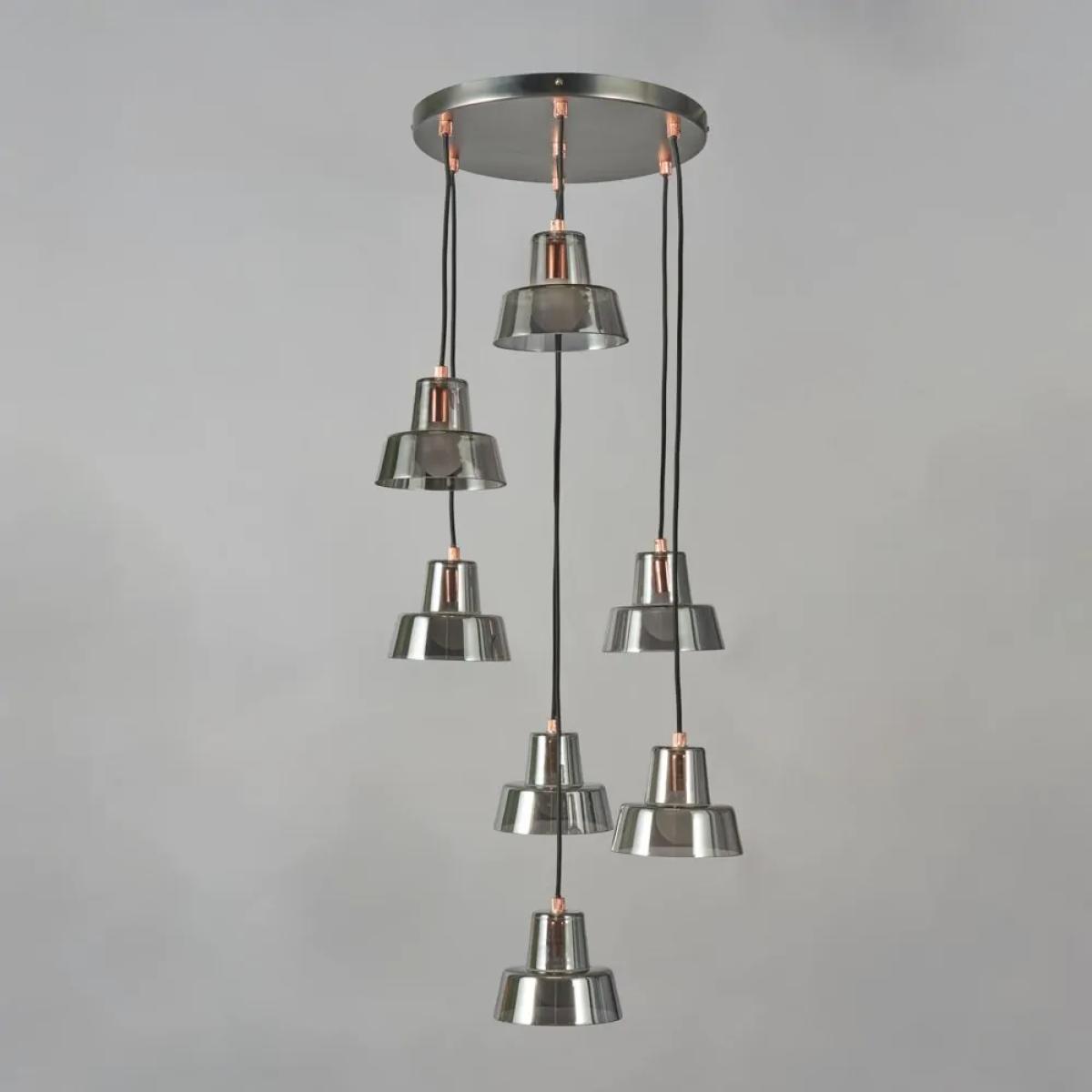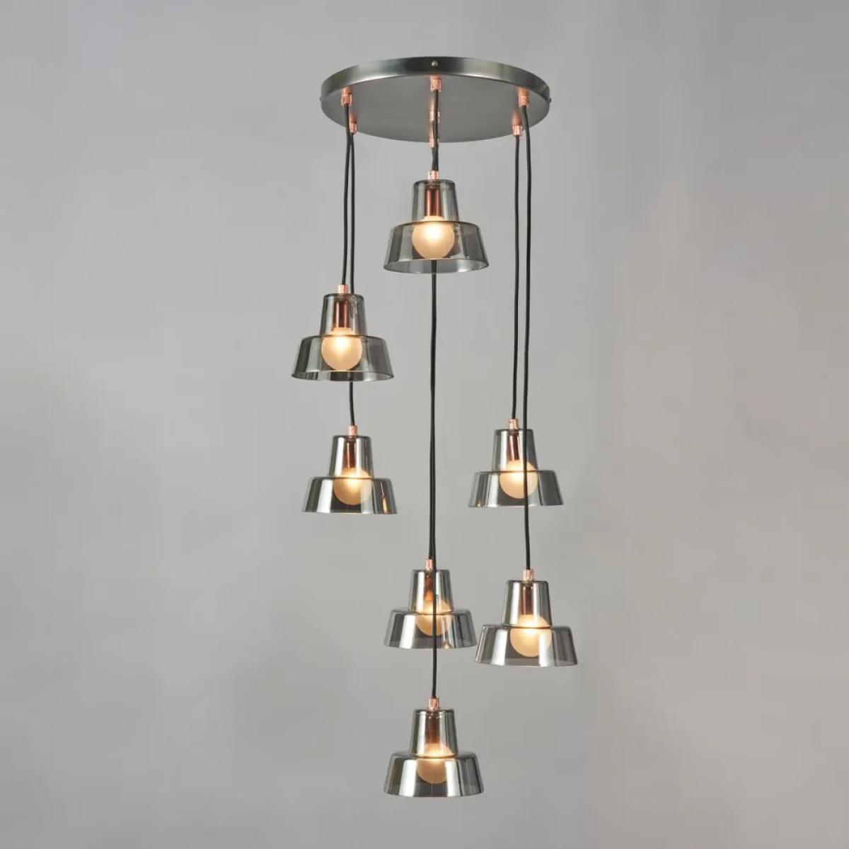 Make a statement with the Demi 7 Light Conical Glass in Matte Black and Copper. Its striking conical glass shade design combines modern aesthetics with a touch of industrial charm. The interplay between the matte black frame and copper accents adds a unique flair to your living space, with the cascading pendant effect offering an eye-catching look to any stairwell or kitchen island.