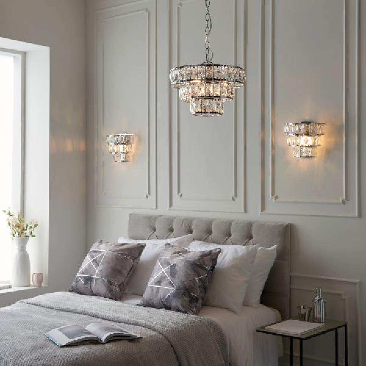Glamorous wall light boasting a polished chrome finish. A beautiful addition to your home, this wall light is part of the Dempster range from Pagazzi Lighting. Boasting a polished chrome finish, this elegant fitting is a three-tiered piece, featuring clear crystal glass detailing. When lit, a sparkly diffusion of light is cast. It is ideal for use in lounges, hallways and bedrooms. Glamorous wall light boasting a polished chrome finish. A beautiful addition to your home, this wall light is part of the Dempster range from Pagazzi Lighting. Boasting a polished chrome finish, this elegant fitting is a three-tiered piece, featuring clear crystal glass detailing. When lit, a sparkly diffusion of light is cast. It is ideal for use in lounges, hallways and bedrooms.