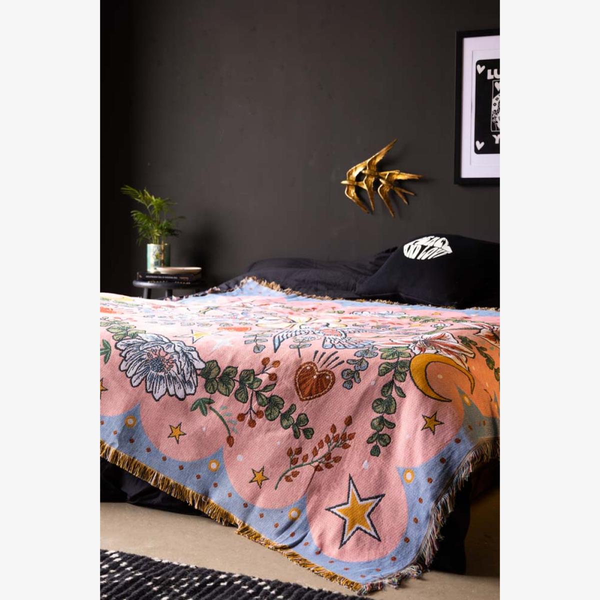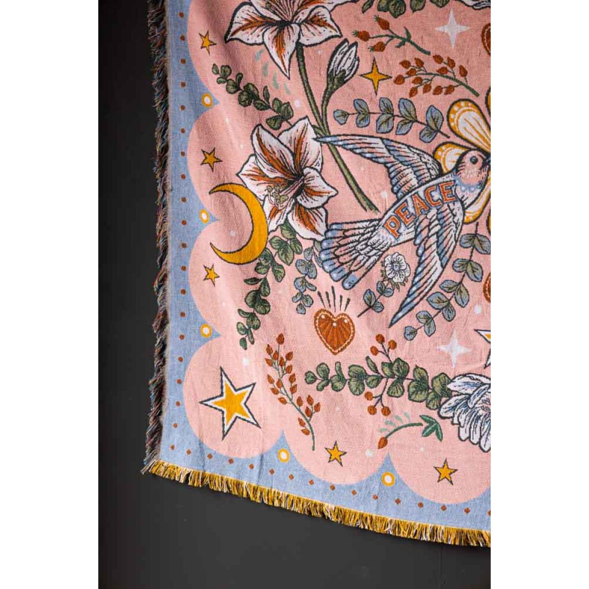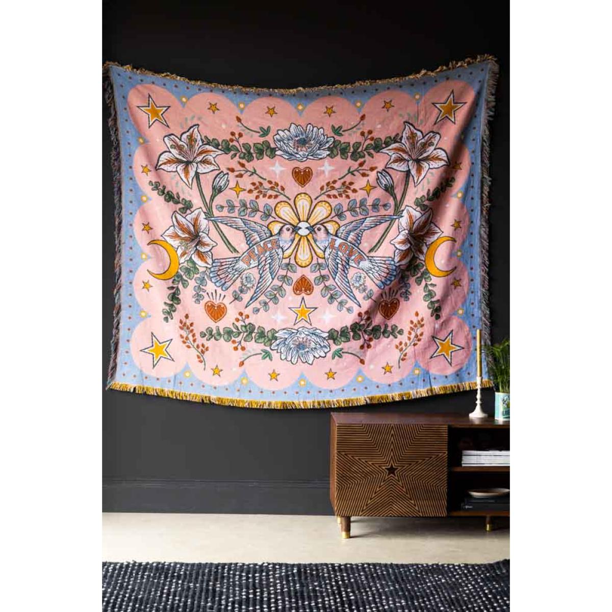 We don’t know whether to gaze at this in adoration or wrap ourselves up in its vast swathes of gorgeousness. Embrace warmth and style with our beautifully-crafted, fringed woven throw, which features delightful blue lovebirds in the centre, alongside floral, celestial and heart motifs. A feast for the eyes in pinks, blues, crimson and yellow hues, this exquisite piece not only offers comfort but also serves as a stunning accent for your living space. Each throw is intricately designed, with the lovebirds symbolising peace and harmony. The soft fabric invites you to snuggle up with those you love best, and transforms your living room or bedroom into a tranquil retreat. Made from soft, high-quality cotton for maximum comfort, this is versatile enough to complement both modern and traditional decor, and is a unique, quirky piece that you’ll treasure forever. - Denim & Bone Blue Lovebirds Woven Cotton Throw - Material: 100% Cotton - Measures: W190cm x L160cm