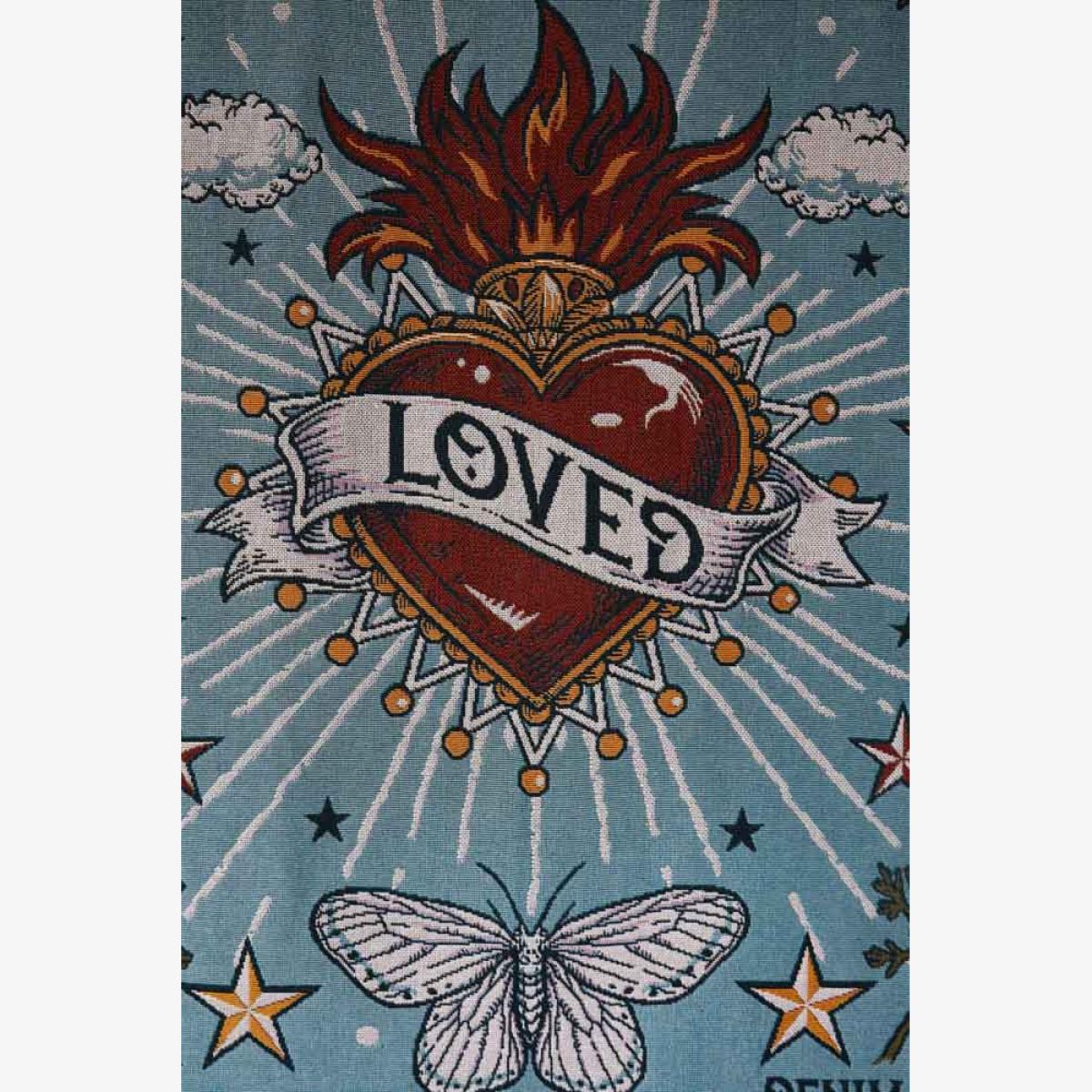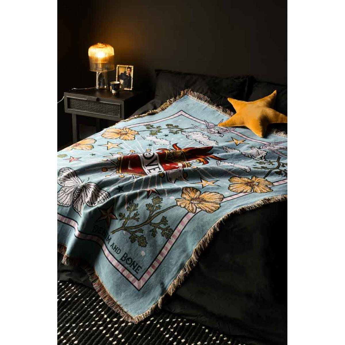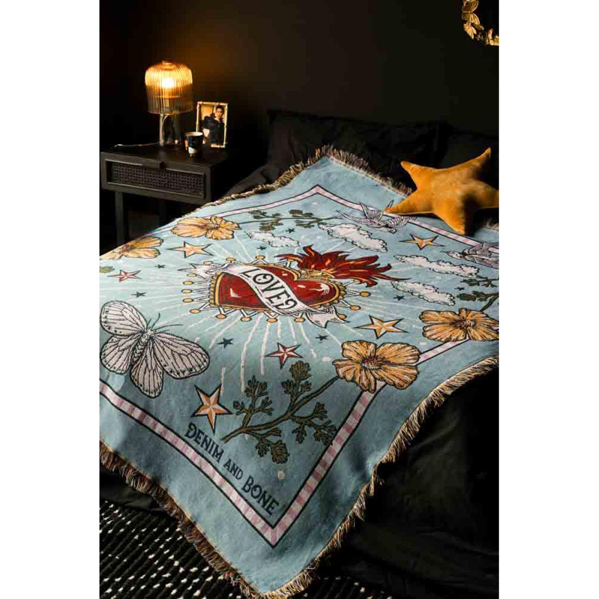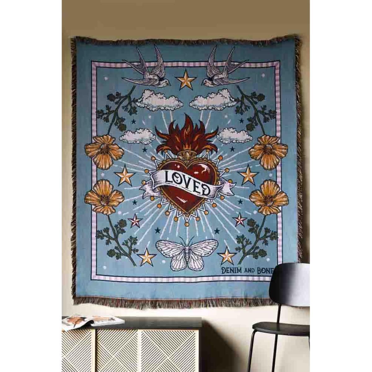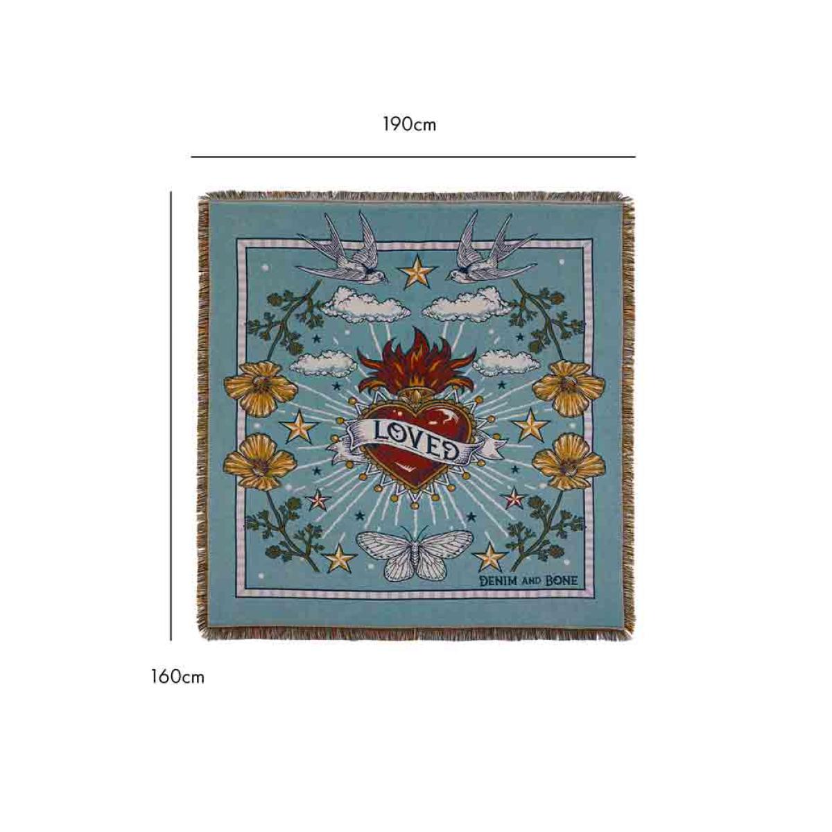 About The Denim & Bone Blue Loved Woven Cotton Throw Magnificently maximalist, the Denim & Bone Blue Loved Woven Cotton Throw will make a striking statement in your home. This colourful throw is made from 100% cotton showcasing a heavenly design of a rich Milagros style heart, wild poppies, swallows, moths and clouds. What’s more, this cotton throw features a mixture of black and yellow thread fringe on the sides and a multicoloured fringe on the top and bottom. This large cotton throw measures 160cm in width and 190cm in length. Please note, this is throw is suitable for machine wash if necessary. Line dry and iron on the reverse where needed. Delivery Times: Delivery for this blanket is expected early March 2022. However, if you'd like to order this blanket for that special someone for Valentine's Day, then Denim & Bone will send you a Valentine's card which you can give to your recipient on the day. Please place your order through the website and your Valentine's card will be posted to you within 3-5 working days. Why We Think You’ll Love Denim & Bone Love The Extra Large Throw Showcasing remarkable attention to detail, this colourful picnic blanket is utterly eye-catching, the longer you observe its beauty the more you see. Perfect for making a striking statement in your home, this large blanket can be used to cuddle up on wintery nights or hung up as a stunning piece of wall art. Where To Style The Denim & Bone Blue Cotton Throw The perfect addition to any home, this statement throw has a multitude of uses. Its stunning design deserves to be seen so why not hang it up on a large wall in your home as a tapestry. Alternatively use it practically as a picnic blanket, chic bedspread or cuddle up with it on the sofa when watching a movie.