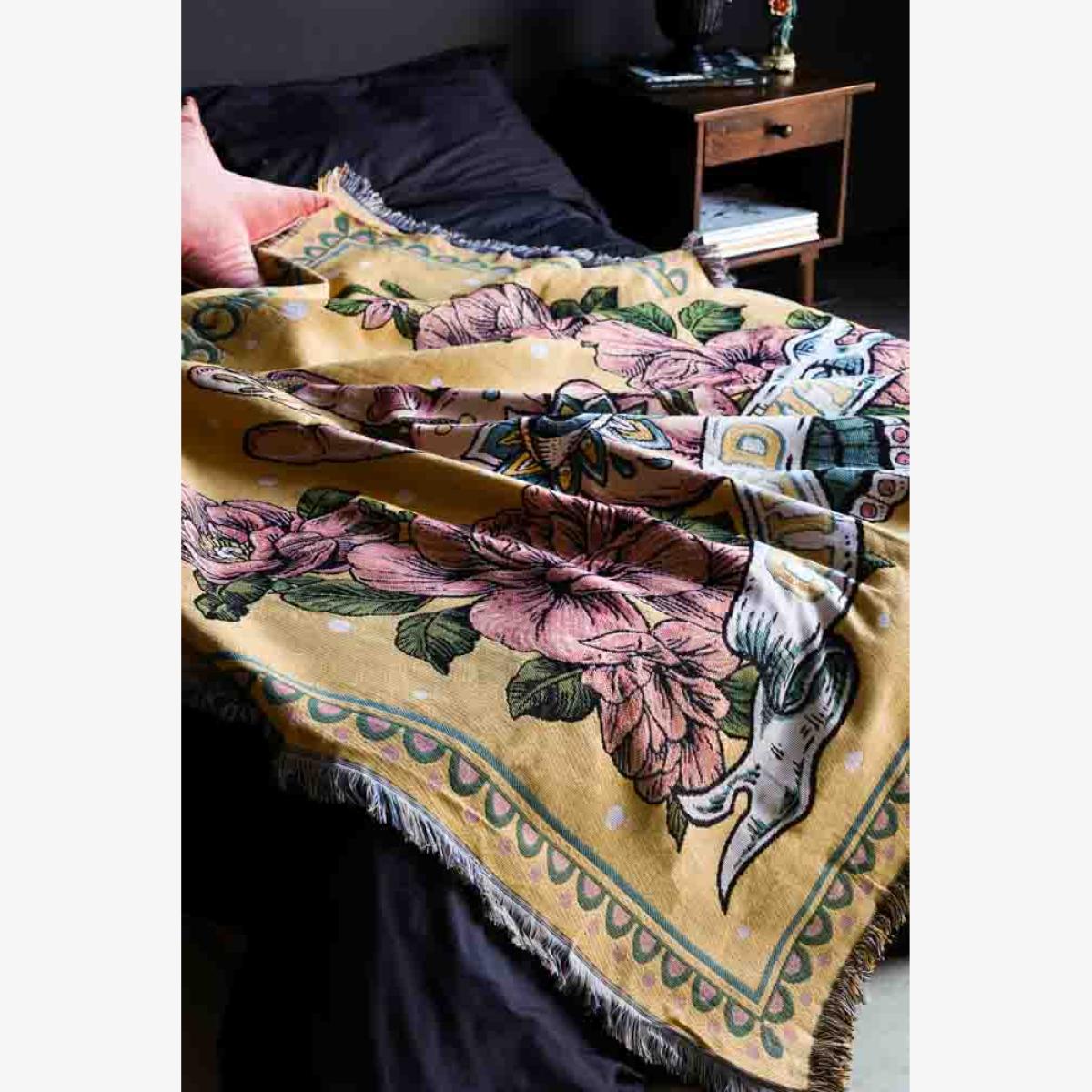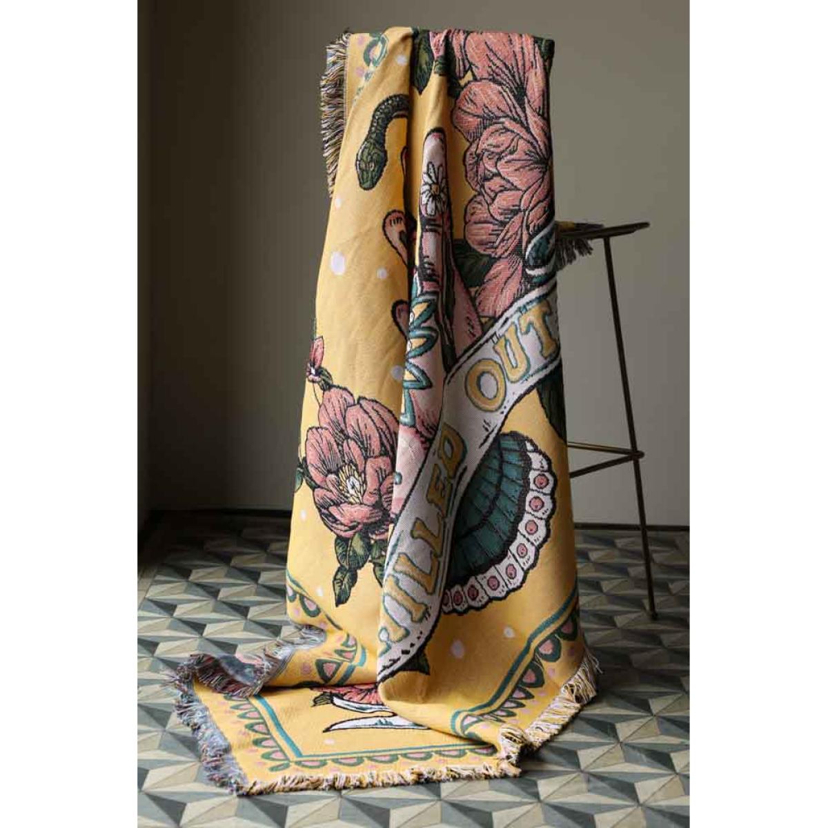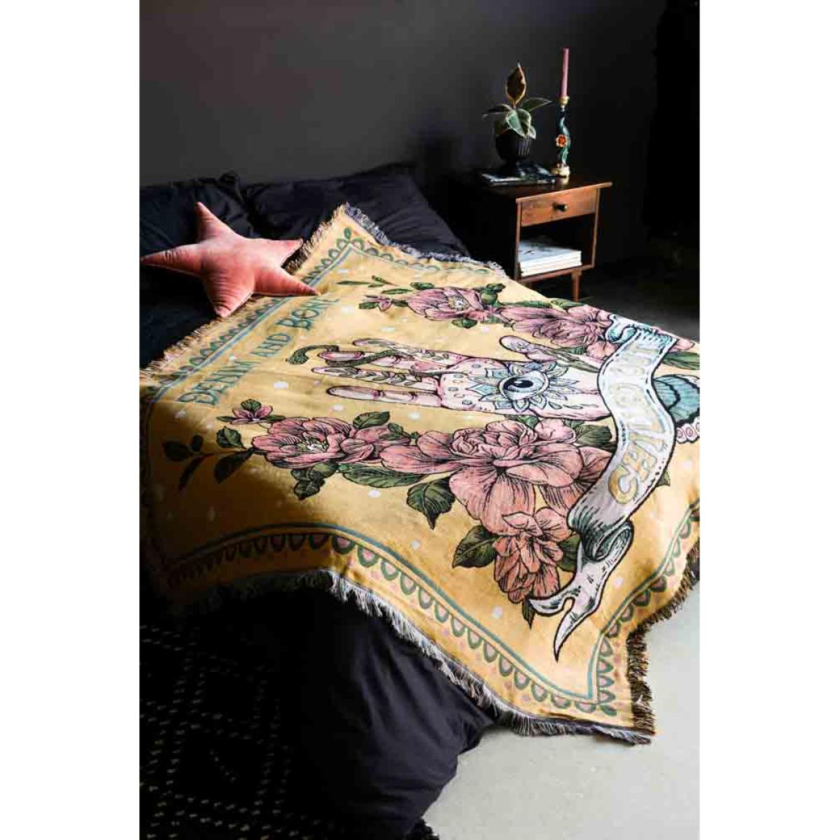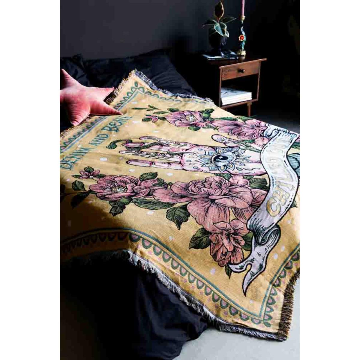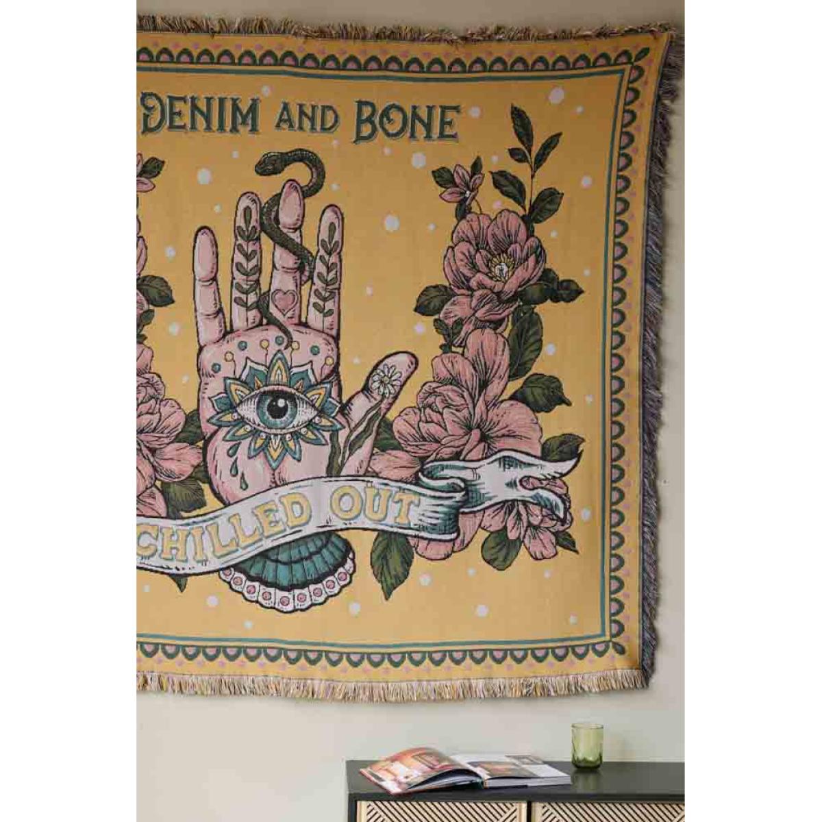 About The Denim & Bone Yellow Chilled Out Throw Another beautiful design from the brilliant Daisy Harkness, the Denim & Bone Yellow Chilled Out Throw joins our collection alongside the Loved Denim & Bone Throws. Made from 100% cotton, the throw blanket features an iconic Hamsa symbol in the centre, surrounded by flowers with the slogan ‘Chilled Out’ woven across the bottom of the design. Measuring W190cm x L160cm this versatile throw can be used throughout your home, both inside and out in the garden. Why We Think You’ll Love The Chilled Out Yellow Throw Designed in a gorgeous shade of sunshine yellow, a colour renowned for happiness and positivity, the chilled out sofa throw is the ultimate piece of dopamine décor! With complimentary colours of pink, blue and yellow woven into the design, the chilled out throw celebrates the ancient evil eye talisman believed to offer the wearer/owner protection from evil and pairs this with beautiful pale pink flowers and a colourful geometric border. Perfect for bringing a healthy dose of sunshine into your home, whatever the season, this fabulous yellow throw is ideal for anyone looking to introduce more colour to their home. How To Style The Denim & Bone Bed Throw Throw blankets are a versatile home accessory so it’s always a good idea to keep a couple on hand to jazz up furniture or keep you cosy on cool nights. With a statement design and colour palette, we recommend keeping your Denim & Bone Yellow Chilled Out Throw on display, whether used as a sofa throw, piece of wall art, bed throw or even a picnic blanket for enjoying the best of the weather in summer!