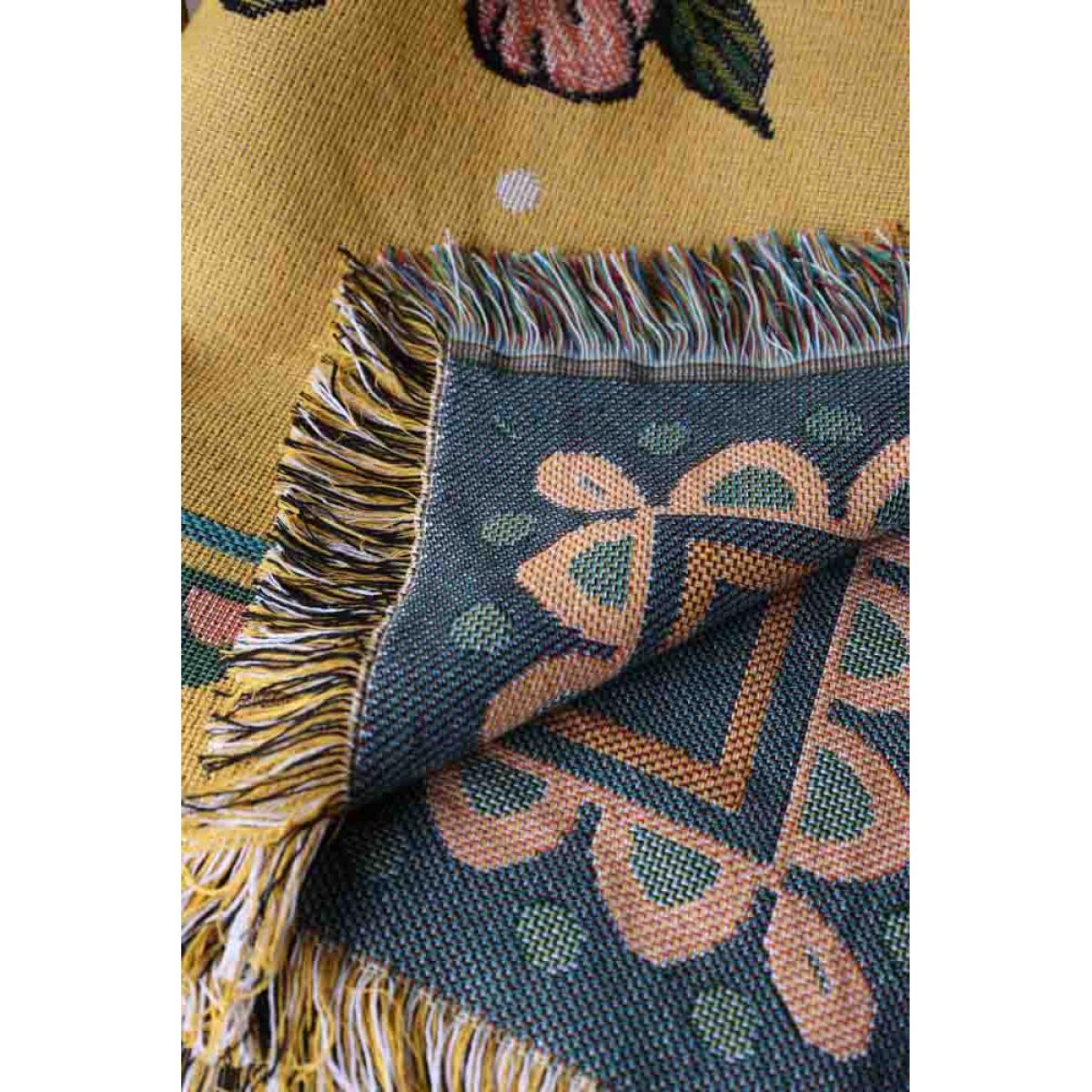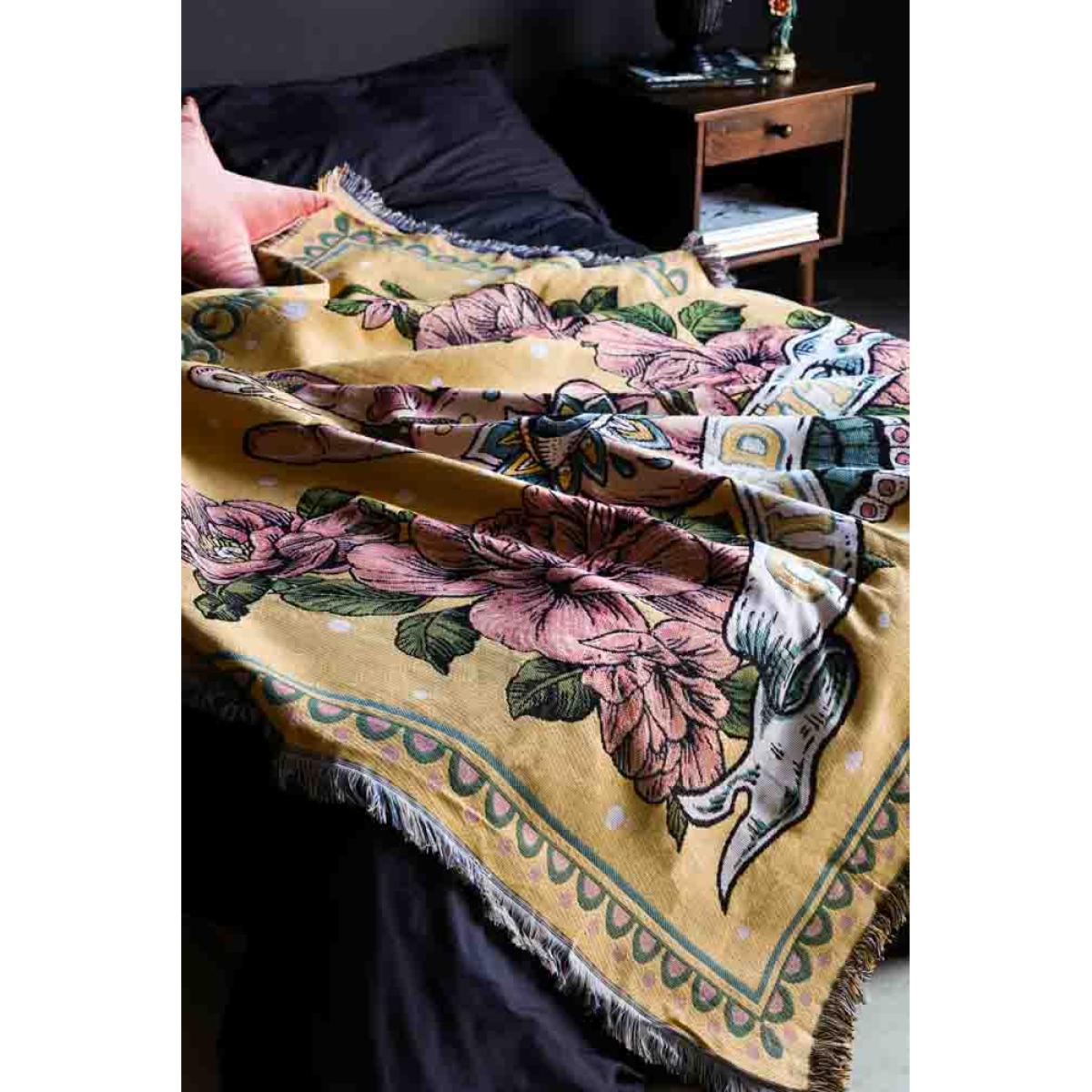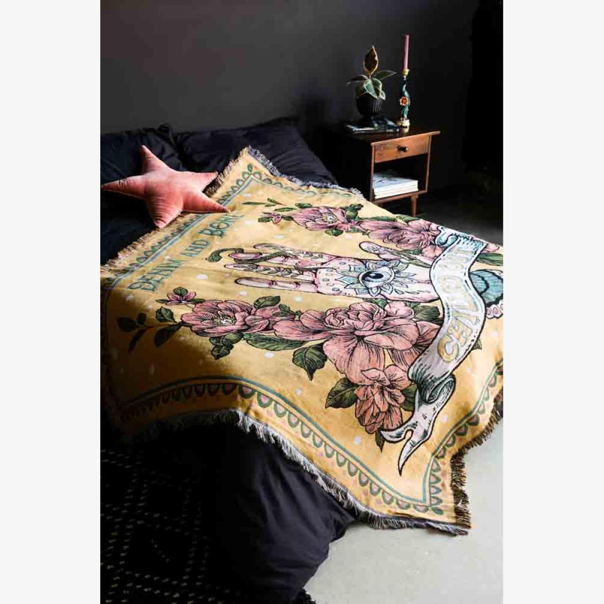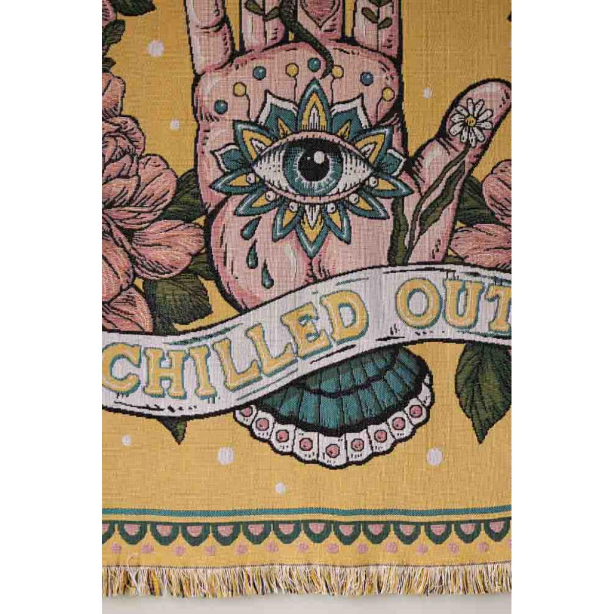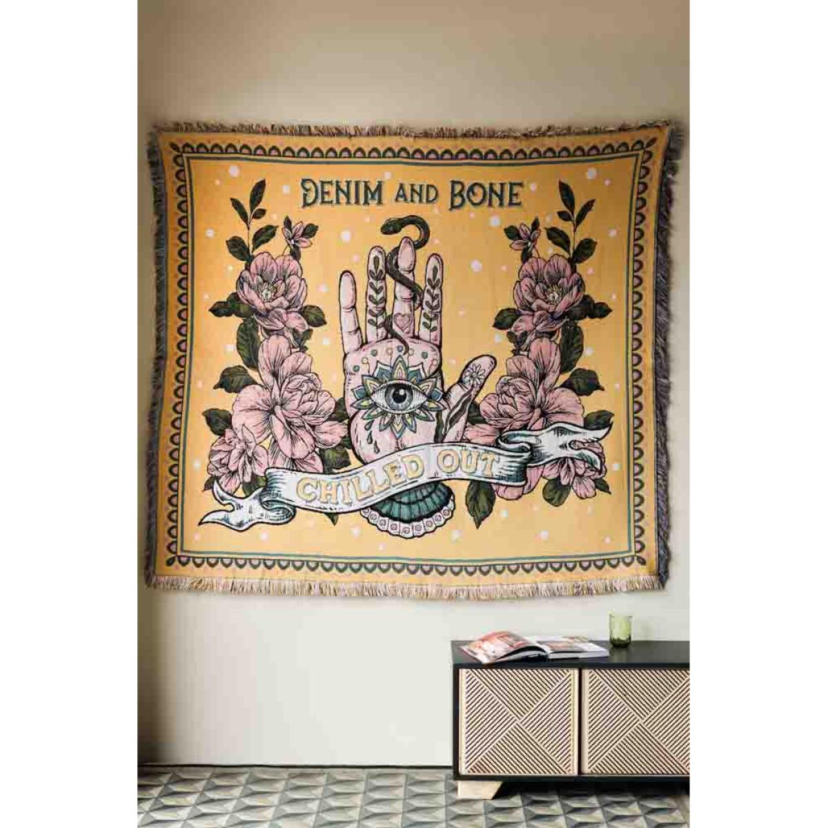 About The Denim & Bone Yellow Chilled Out Throw Another beautiful design from the brilliant Daisy Harkness, the Denim & Bone Yellow Chilled Out Throw joins our collection alongside the Loved Denim & Bone Throws. Made from 100% cotton, the throw blanket features an iconic Hamsa symbol in the centre, surrounded by flowers with the slogan ‘Chilled Out’ woven across the bottom of the design. Measuring W190cm x L160cm this versatile throw can be used throughout your home, both inside and out in the garden. Why We Think You’ll Love The Chilled Out Yellow Throw Designed in a gorgeous shade of sunshine yellow, a colour renowned for happiness and positivity, the chilled out sofa throw is the ultimate piece of dopamine décor! With complimentary colours of pink, blue and yellow woven into the design, the chilled out throw celebrates the ancient evil eye talisman believed to offer the wearer/owner protection from evil and pairs this with beautiful pale pink flowers and a colourful geometric border. Perfect for bringing a healthy dose of sunshine into your home, whatever the season, this fabulous yellow throw is ideal for anyone looking to introduce more colour to their home. How To Style The Denim & Bone Bed Throw Throw blankets are a versatile home accessory so it’s always a good idea to keep a couple on hand to jazz up furniture or keep you cosy on cool nights. With a statement design and colour palette, we recommend keeping your Denim & Bone Yellow Chilled Out Throw on display, whether used as a sofa throw, piece of wall art, bed throw or even a picnic blanket for enjoying the best of the weather in summer!