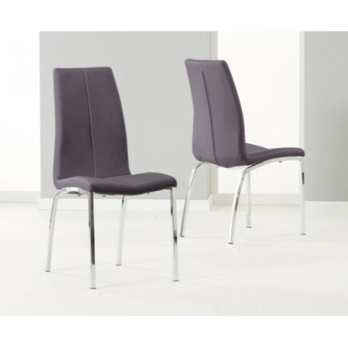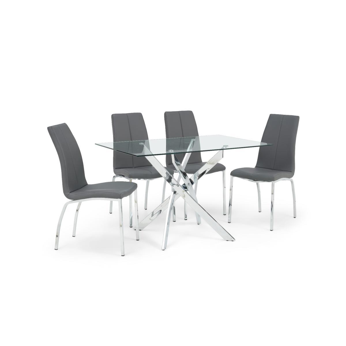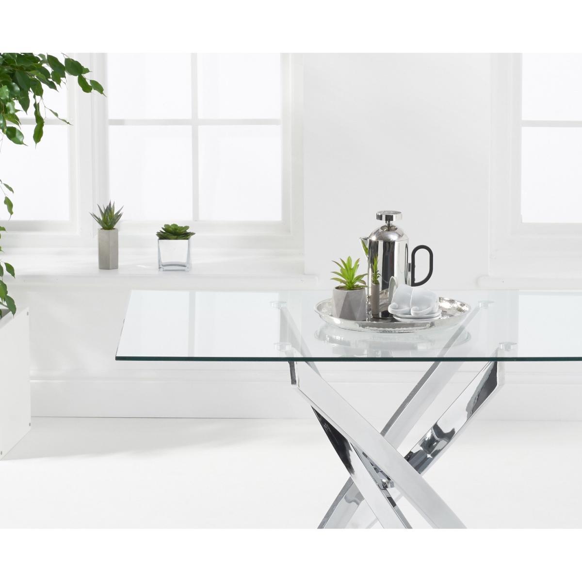 The Denver 120cm Glass Dining Table with Cavello Chairs brings sleek modern style to your home. Seating 6 diners, the Denver table features a rectangular glass table top with chrome legs in a stunning crossed design. The small, statement table is complemented by faux leather Cavello chairs with a stitched design and chrome legs. Sleek modern dining set makes an impression. Rectangular glass dining table. Seats 6 people. Wipe-clean clear glass table top Smooth handmade chrome legs in unique crossed design Faux leather chairs complete the look. With a deep buttoned design and chrome legs