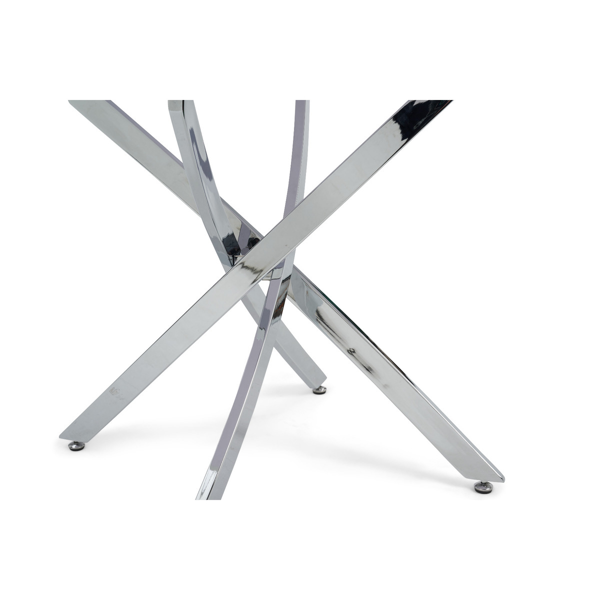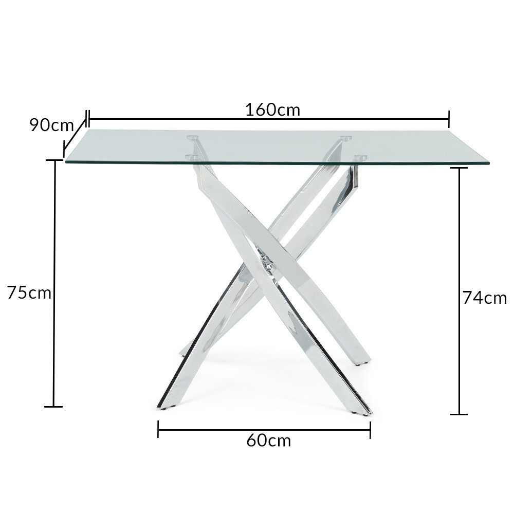 The Denver collection of tables is distinguished by glass surfaces and eye-catching, flat metal legs that tastefully overlap one another, meeting in the space between the tabletop and the floor. The smooth glass surface of this medium-sized, rectangular table is handsome, airy, and practical, wiping clean with ease. The stunning chrome metal legs come together in a graceful focal point below the surface of the table.