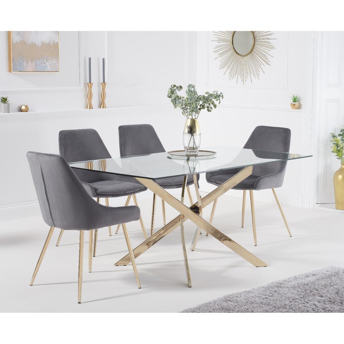 Denver 160cm Rectangular Gold Leg Glass Dining Table with Fern Velvet Chairs - Blue, 4 Chairs