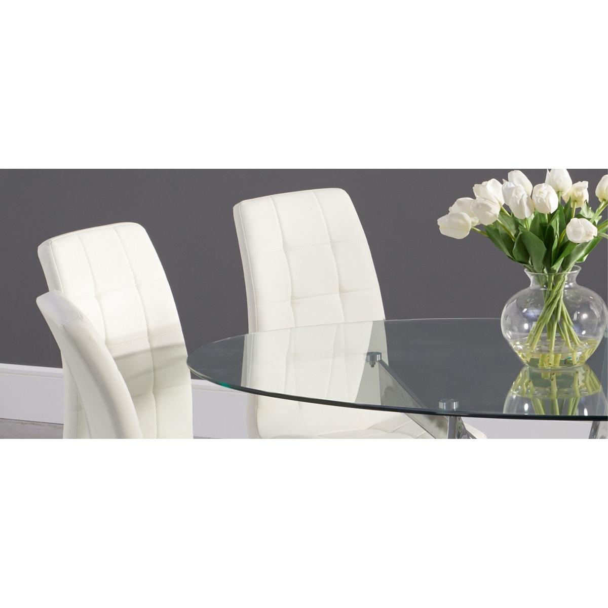 Chic and sophisticated, the Denver 165cm Oval Glass Dining Table with Calgary Chairs is a glass table dining set that comes with faux leather chairs. A light-reflecting and airy dining set, this set suits modern and contemporary interiors, and seats up to 6 people. A sleek and elegant table, the Denver 160cm Oval Glass Dining Table offers a flawless piece of 10mm-thick glass that’s durable and resilient enough to deal with any amounts of plates and serving dishes as a traditional oak table. The tabletop is supported by interwoven strands of chrome for a unique and stylish pedestal leg look. The Calgary Chairs that accompany this table have sleek and streamlined look that complements the table. Boasting arched chrome legs and faux leather upholstery - in your choice of black, white, grey, cream, white or red - the Calgary Chairs are as comfortable as they are stylish.