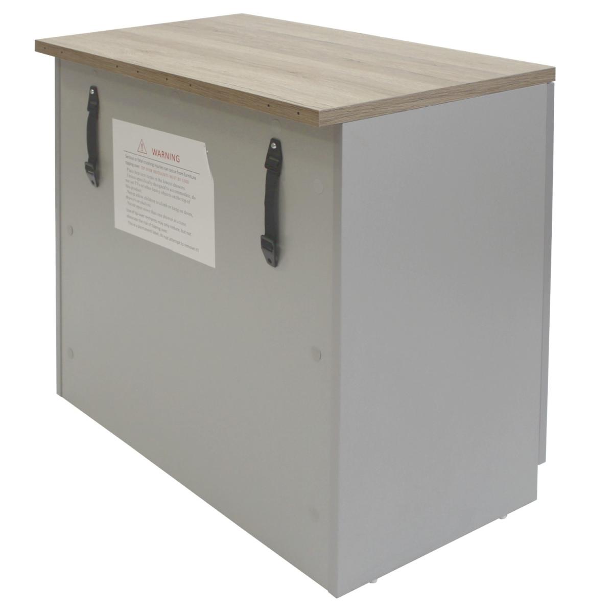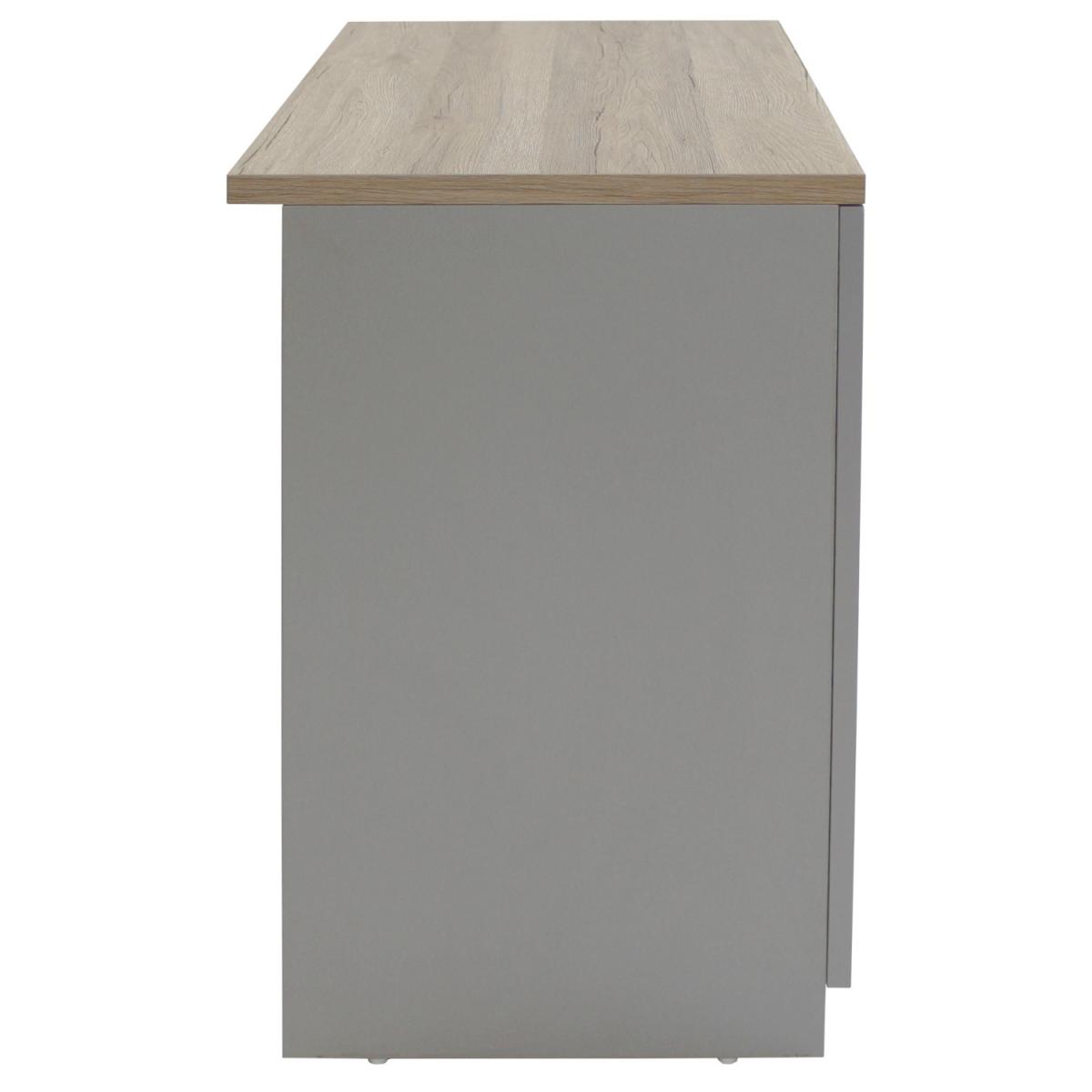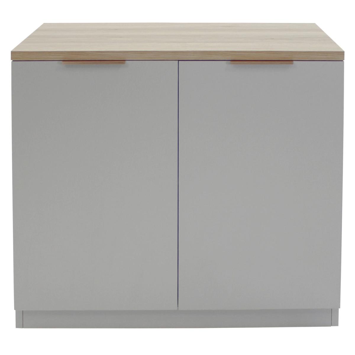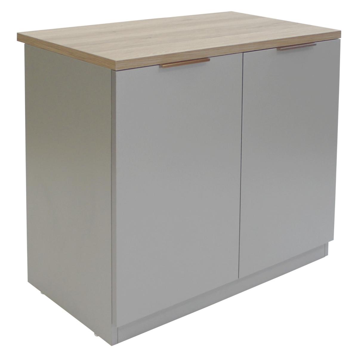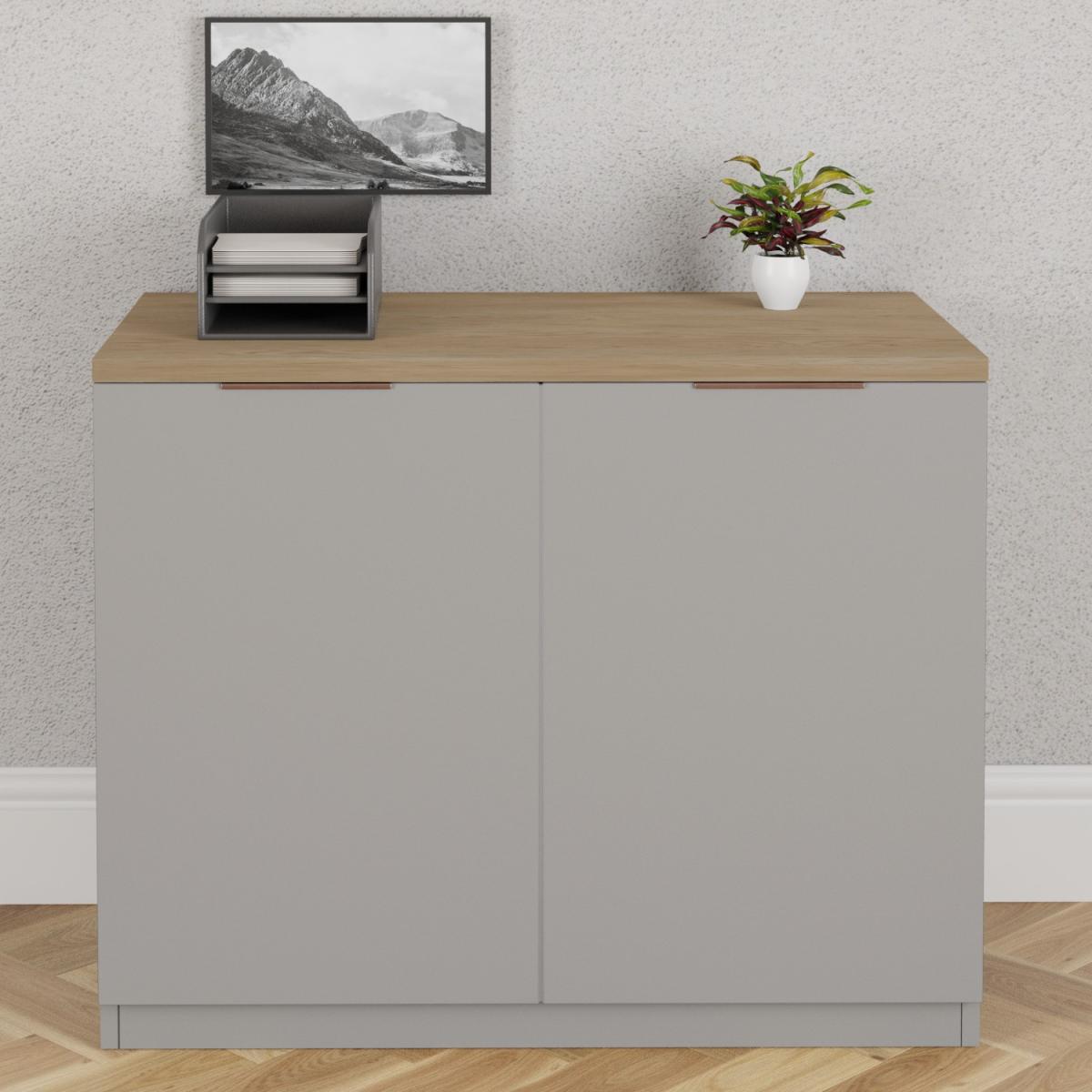 Dimensions:H76 x W80 x D46 cm A modern, ready to assemble cupboard suitable for living room and home office environments. Features: Manufactured in a stylish light grey painted effect with light oak effect tops Finished in a robust, easy-clean surface resistant material to withstand the rigors of everyday life Additional features include soft-close door hinges, which can be handed left or right hand hinged Adjustable foot levellers allow for uneven floors Elegant and sleek top-mounted brushed metal handles