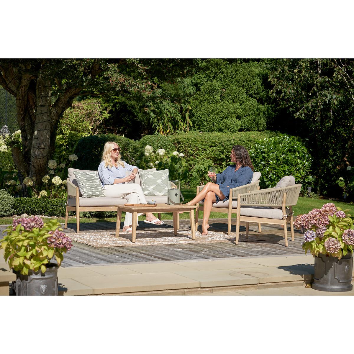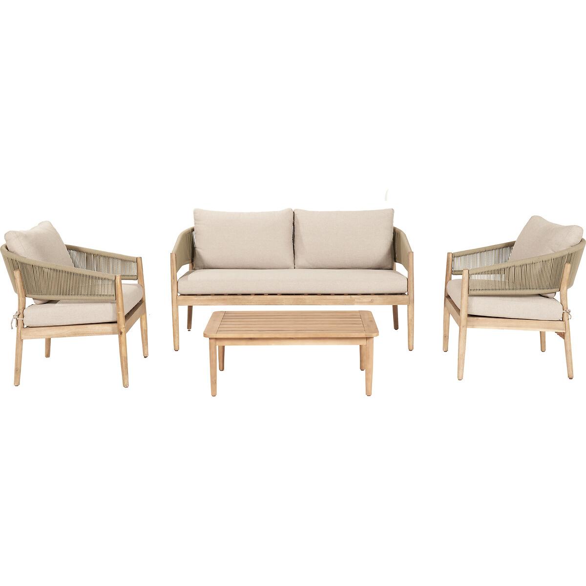 Please note: this product cannot be delivered to all Offshore Islands, Northern Ireland or Republic of Ireland - postcodes starting with; AB, BT, DD, IV, KW1-14, PA21-38, PH, TR17-27 & ALL ROI.Create a modern, on-trend outdoor area with this sophisticated 4 Seater Garden Set. The Denver Lounge Set, hand crafted in Vietnam, consists of a two seater sofa, 2 armchairs and a coffee table. Using a comfortable, contemporary weather resistant, twisted polyrope in Sage Green, and framed with a gorgeous Antique Teak Effect Acacia Wood frame, this stylish set really steps up the garden styling stakes. The use of acacia wood in outdoor furniture is an excellent choice as it is an environmentally friendly wood, quick-growing, tough and a long lasting hardwood, finsihed here in a contemporary Teak Effect finish. The season proof cushions are finished in a complementary Medium Weave Soft Beige Fabric providing a sleek tonal look to your outdoor lounging area. Product Dimensions: Chair: 75x70x80cm. Sofa: 75x150x80cm. Table: 60x90x34cm Parcel 1 Packaged Dimensions: 104cmx82cmx74cm Weight: 32kg Parcel 2 Packaged Dimensions: 153cmx78cmx78cm Weight: 40kg. Composition: Acacia Wood 70%, PU Foam 10% Rope 10% Steel 5% and Olefin 5%Please note this item is a large piece of furniture that will require some self assembly. Please ensure you have space to receive delivery. This product will be dispatched by one of our trusted suppliers. You’ll be contacted by their selected courier about your delivery. PACIF01