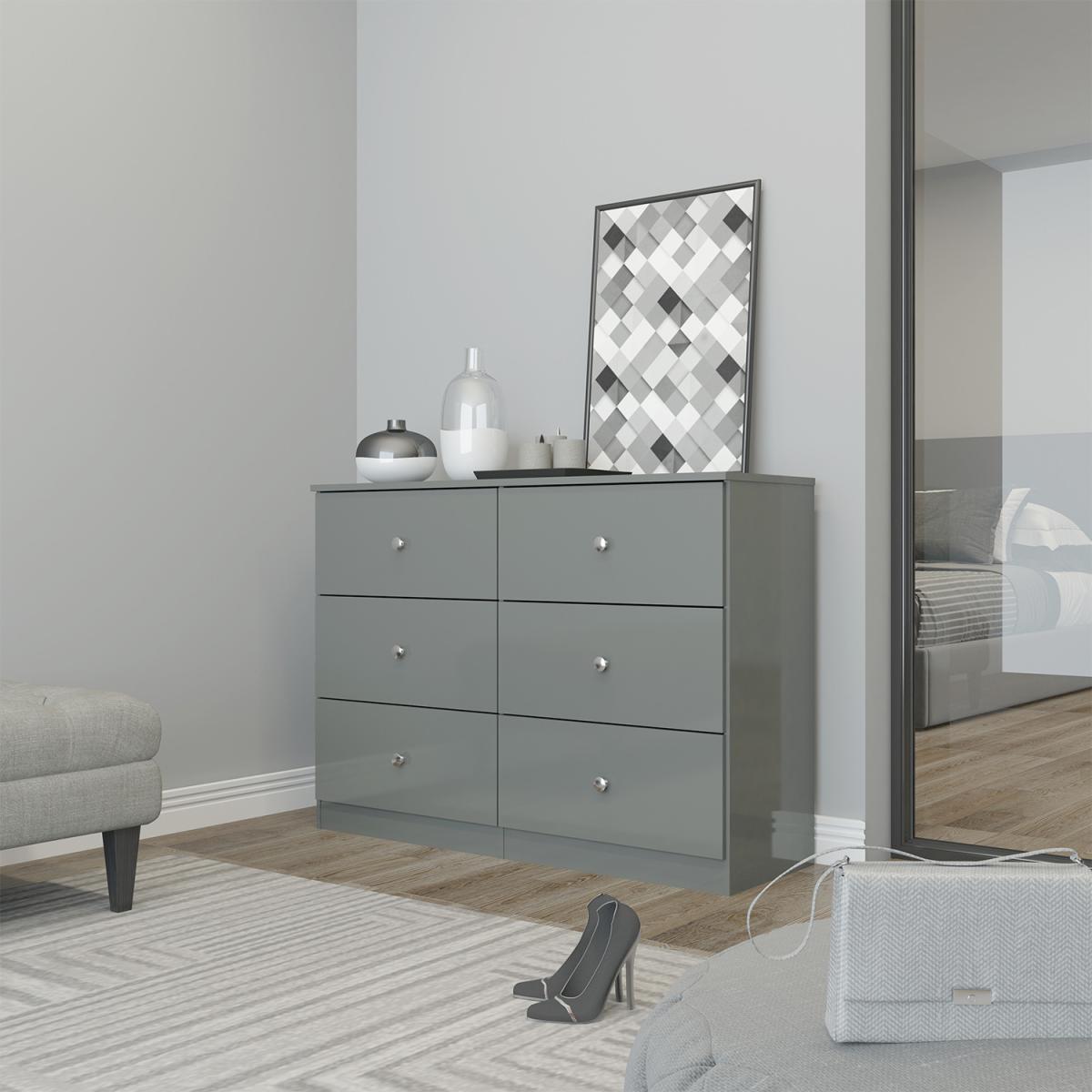The Denver 6 Drawer Chest is a stylish and practical storage solution for any modern home. With its sleek high-gloss finish, this chest adds a touch of contemporary elegance to your bedroom while offering ample space to keep your essentials organized. The six spacious drawers glide smoothly, providing easy access to clothing, accessories, or household items. UK Mainland delivery only, between 9 am and 9 pm (weekdays) the courier will contact you on the day of delivery to offer a time slot. This takes place within 10 working days (Ground floor only). Please also ensure that we have a note of your up-to-date address and contact information, to be passed to the couriers.