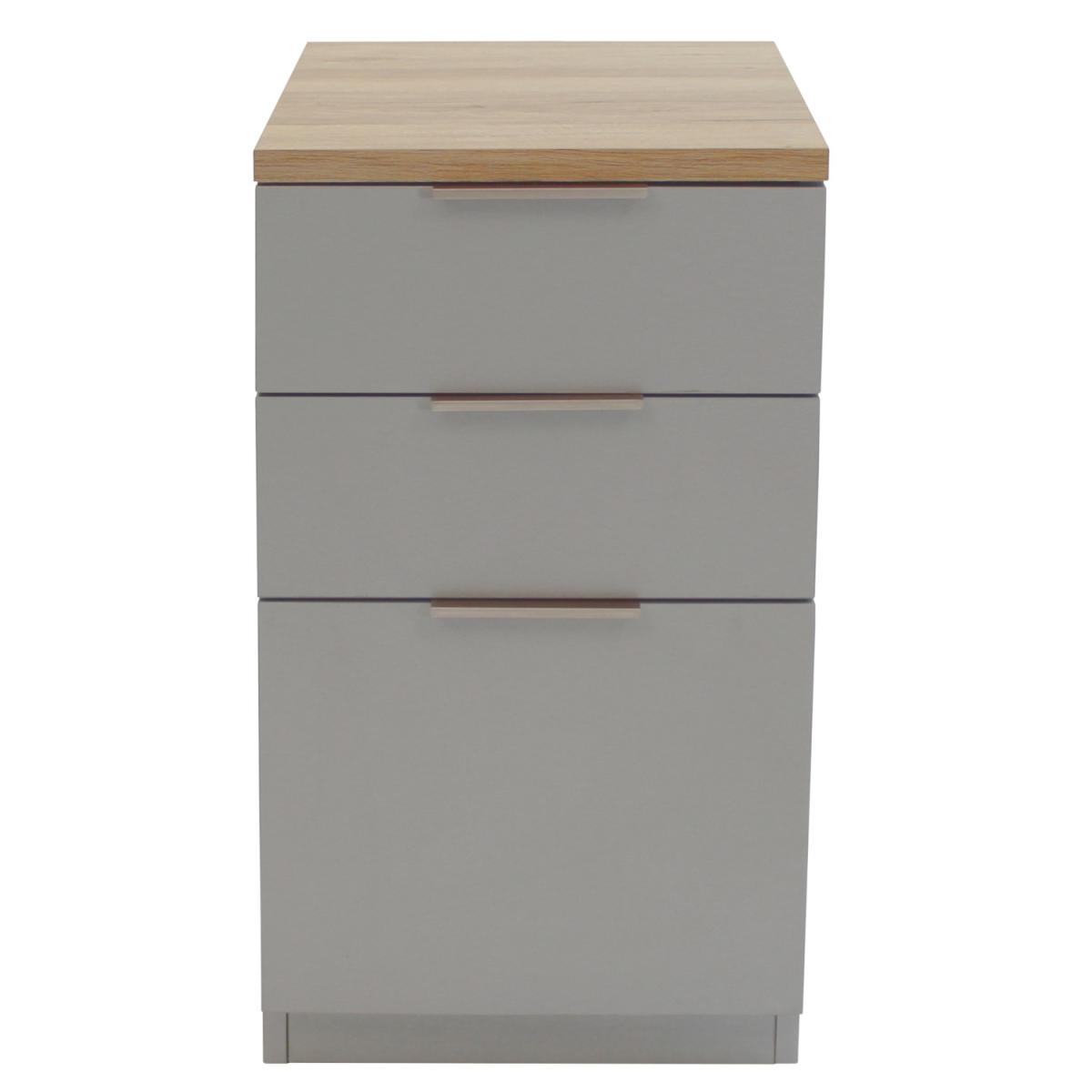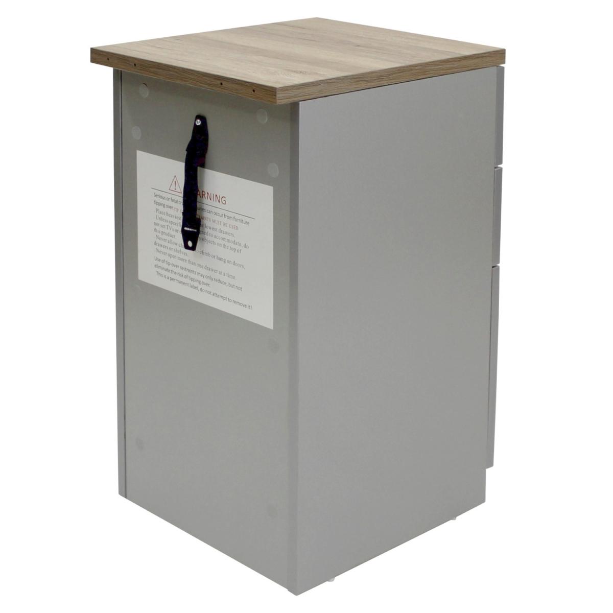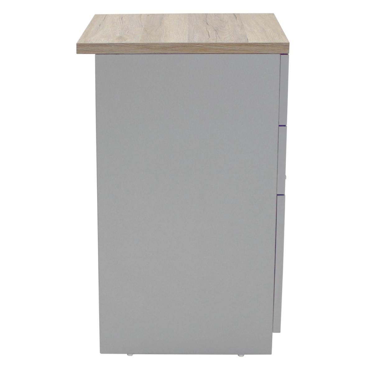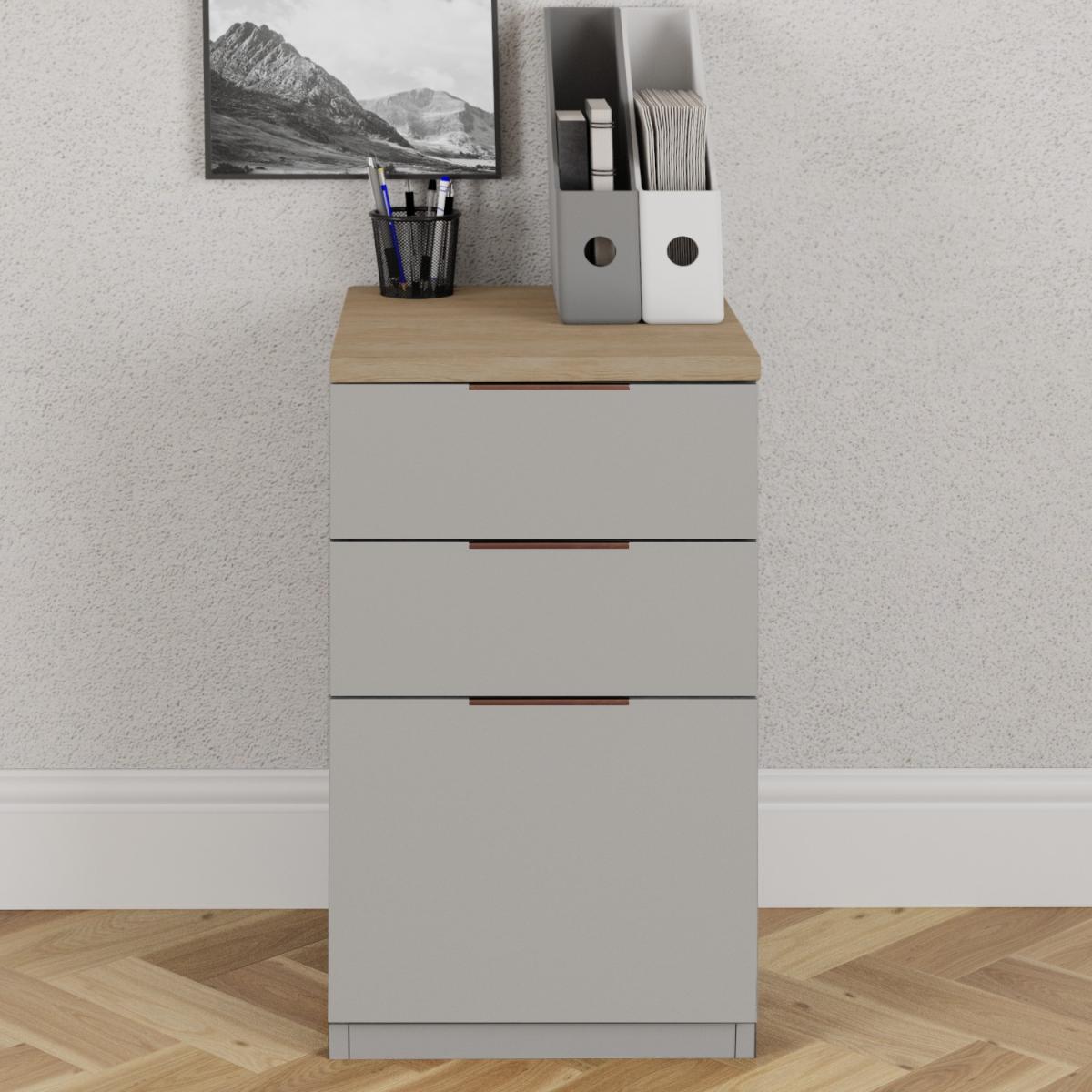Dimensions:H76 x W41 x D46 cm A modern, assembled filing cabinet suitable for home office environments. Features: Manufactured in a stylish light grey painted effect with light oak effect tops Finished in a robust, easy-clean surface resistant material to withstand the rigours of everyday life Features metal drawer runners for easy opening and closing Includes filing drawer suitable for A4 suspension files Adjustable foot levellers to allow for uneven floors