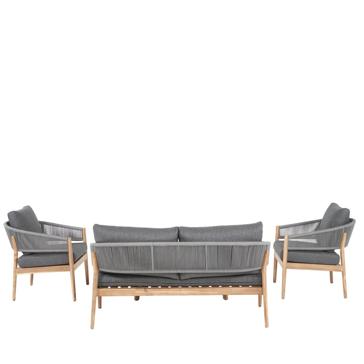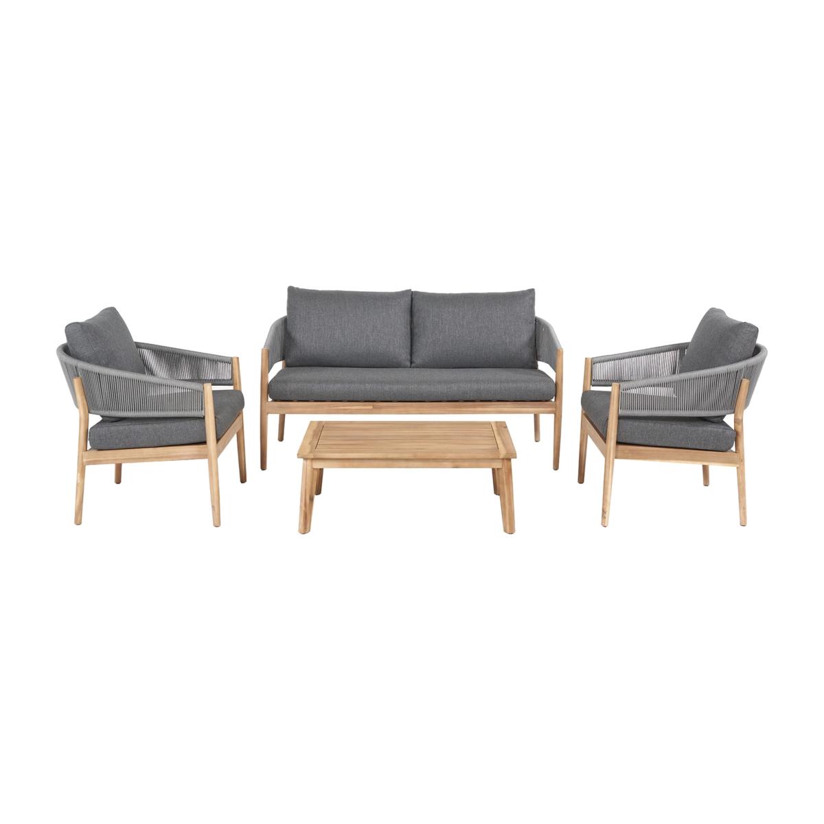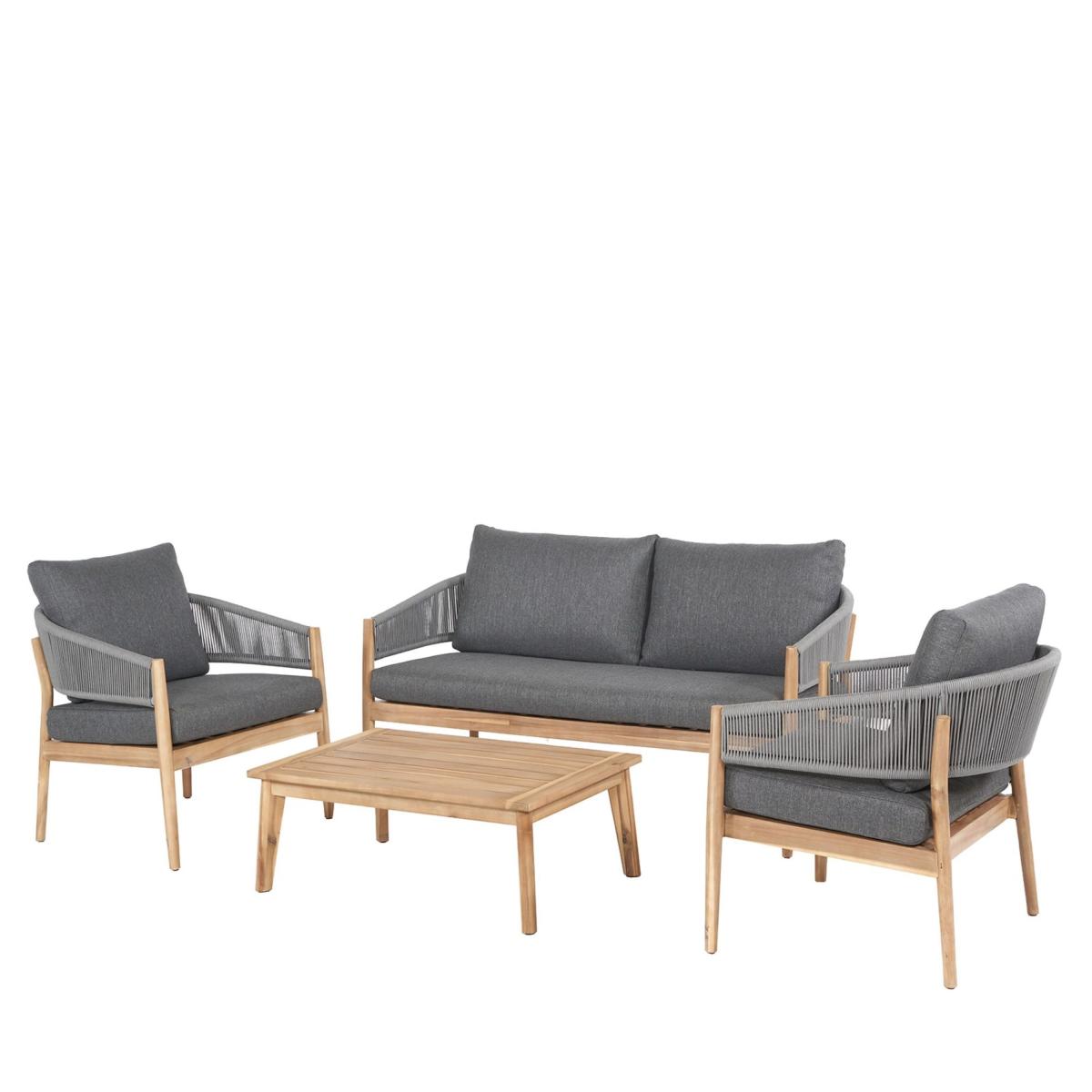 I love this set because of its versatile, contemporary style that works well both outside and slightly inside an airy, minimalist conservatory or modern outdoor patio. The grey upholstery paired with natural wood accents gives it a relaxed yet sophisticated look, making it suitable for relaxed family gatherings or stylish outdoor entertaining. To style, consider layering with cosy throws and textured cushions to add tactile appeal and comfort. It also pairs nicely with natural fibre rugs or sleek stone surfaces to enhance its clean lines. Keep accessories simple for a modern aesthetic, or introduce colour through vibrant cushions or outdoor planters for a lively touch. This set is practical and stylish, perfect for creating a cosy outdoor lounge area that feels inviting and effortlessly chic.