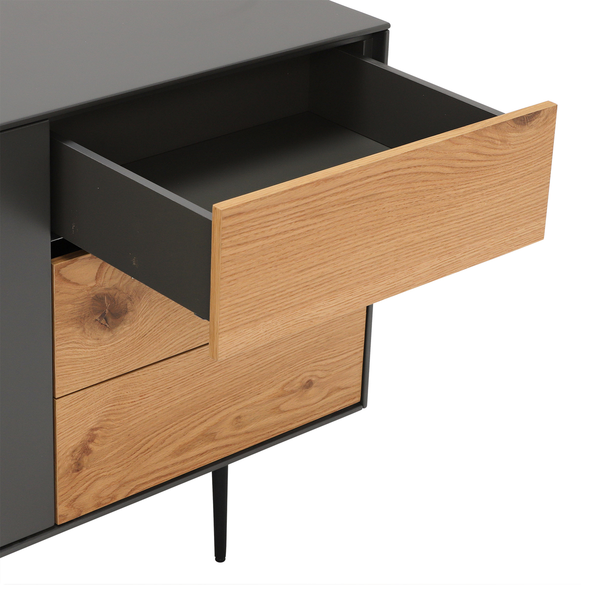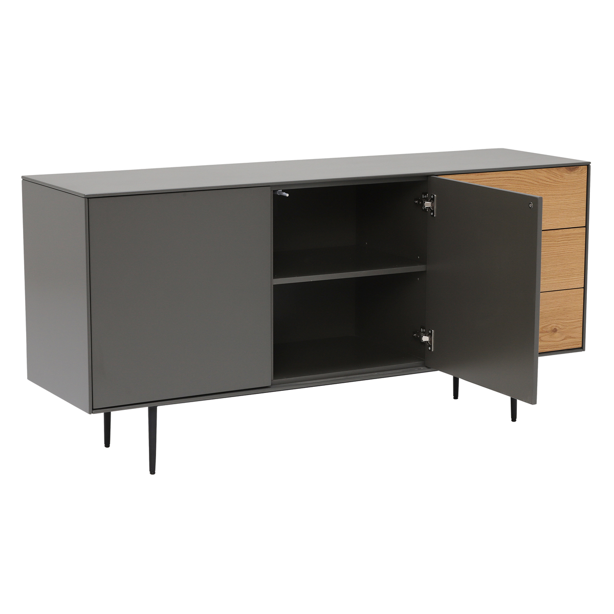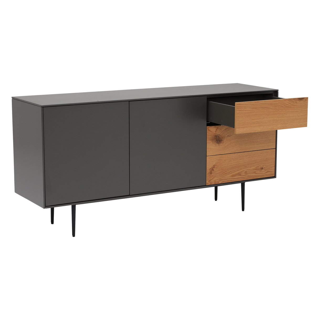 The Denver sideboard features smooth dark grey surfaces with accent wild Oak veneer drawer fronts creating an urban industrial and scandi inspired look. Simple modern design featuring clean contemporary lines, pared back handle less doors and drawers with elegant metal legs.