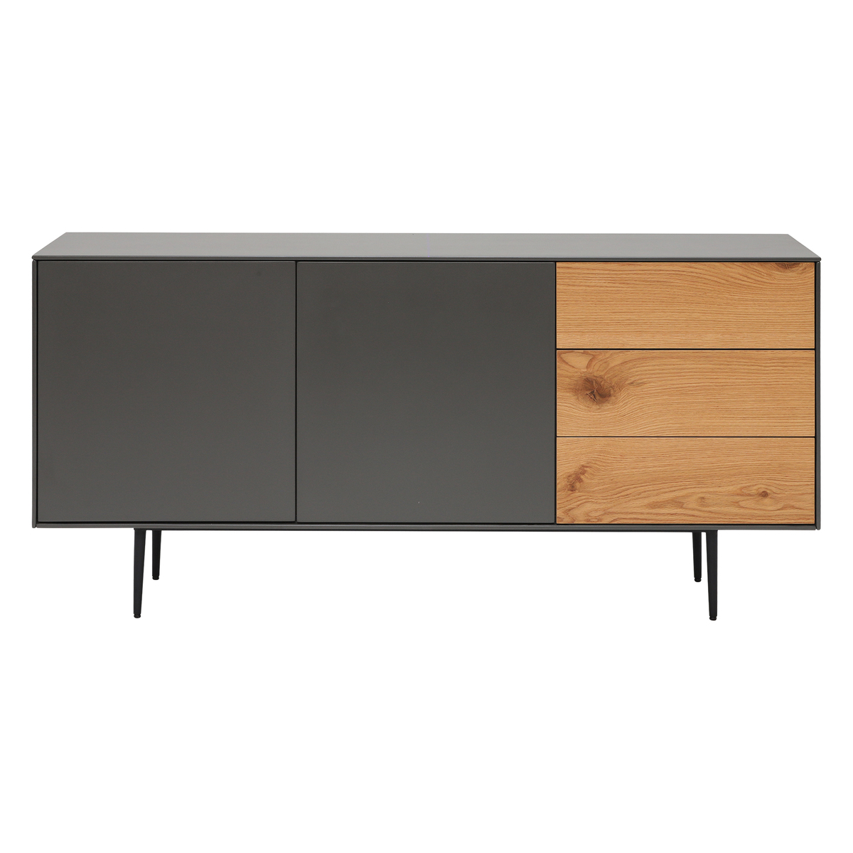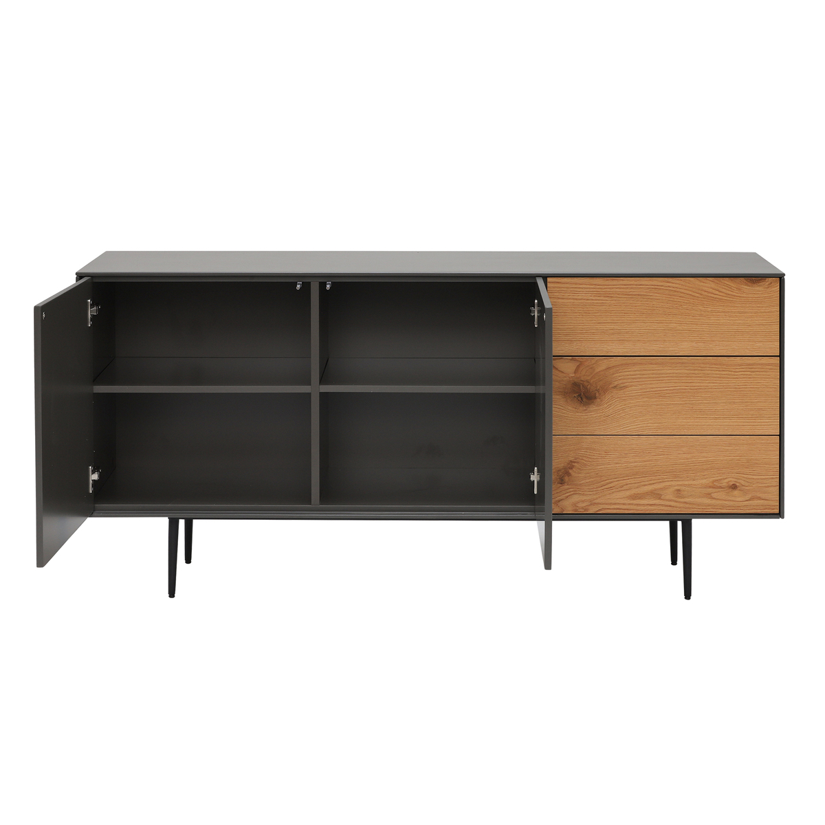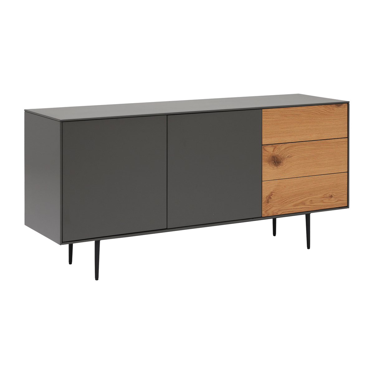 The Denver sideboard features smooth dark grey surfaces with accent wild Oak veneer drawer fronts creating an urban industrial and scandi inspired look. Simple modern design featuring clean contemporary lines, pared back handle less doors and drawers with elegant metal legs.