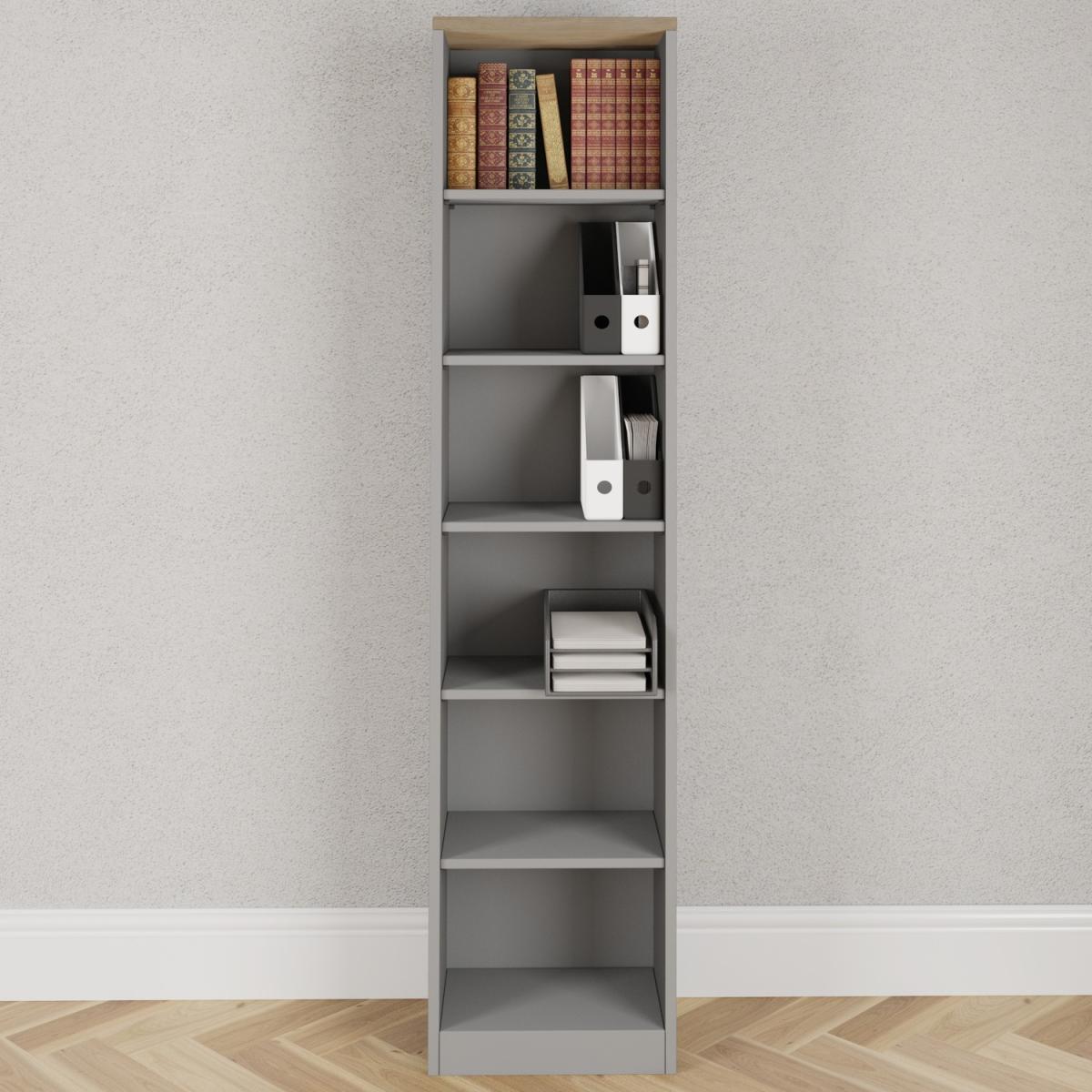 A modern, ready to assemble practical tall narrow bookcase, suitable for living room and home office environments.