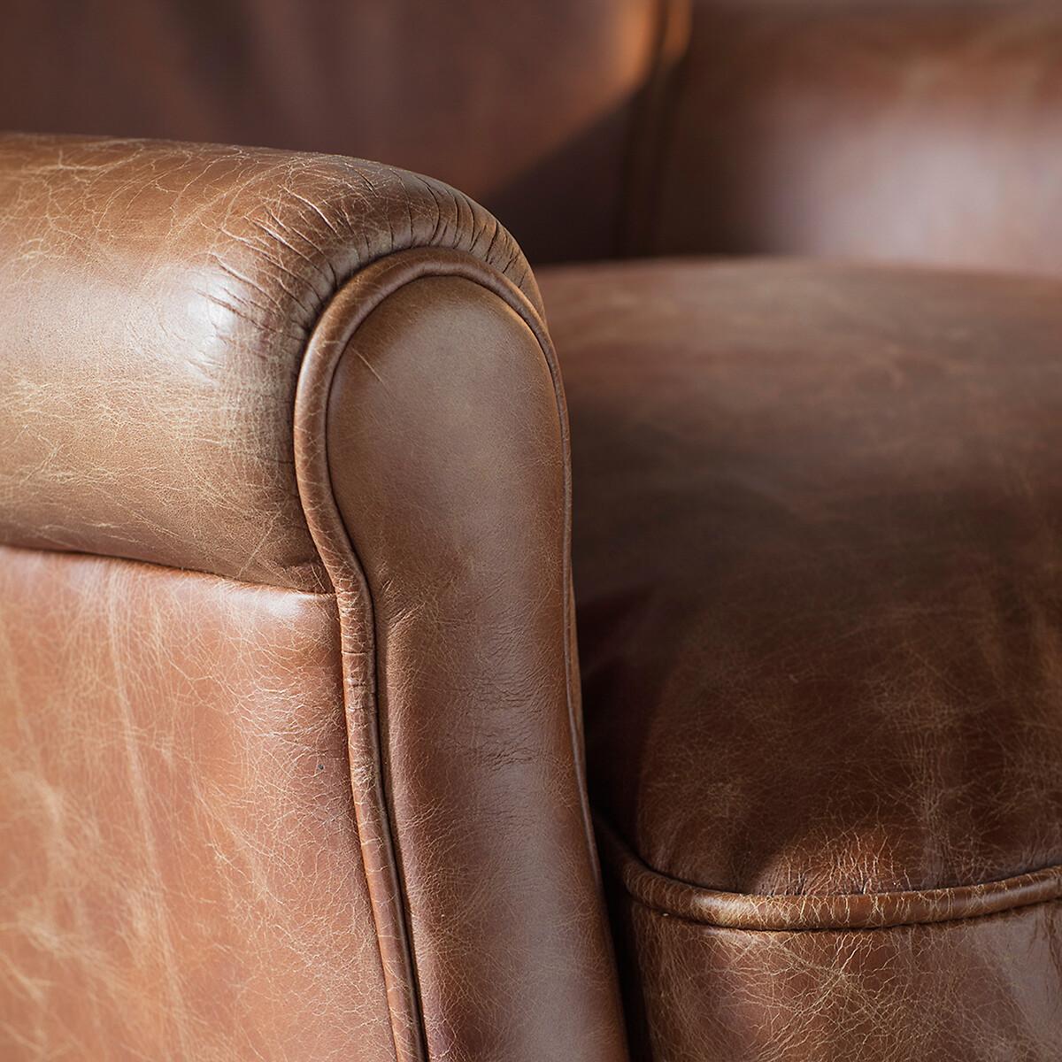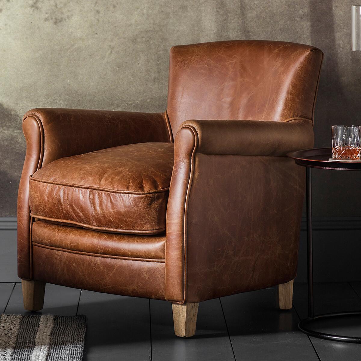 A classically shaped armchair covered in mellow brown vintage leather that is superbly soft and incredibly supple, all finished off with solid ash legs. Relax and snuggle up amongst cushions stuffed generously with feather and foam fillings for the ultimate lounging experience. Product details • Top grain leather upholstery with an aged effect • Square tapered ash wood legs • Solid back • Deep seat • High rolled arms • Foam and feather fillings • Fully assembled • Composition: Ash Wood, Leather. Product Dimensions: L86 x W75 x H81cm. Seat Height: 48 cm. Seat width between the arms: 55 cm. Seat depth: 65 cm. Back rest height: 45 cm. Armrest height from seat: 15 cm Leg height: 11 cm. Please note: this product cannot be delivered to all Offshore Islands Northern Ireland or Republic of Ireland. This product will be dispatched by one of our trusted suppliers. You’ll be contacted by their selected courier about your delivery. GALLE01