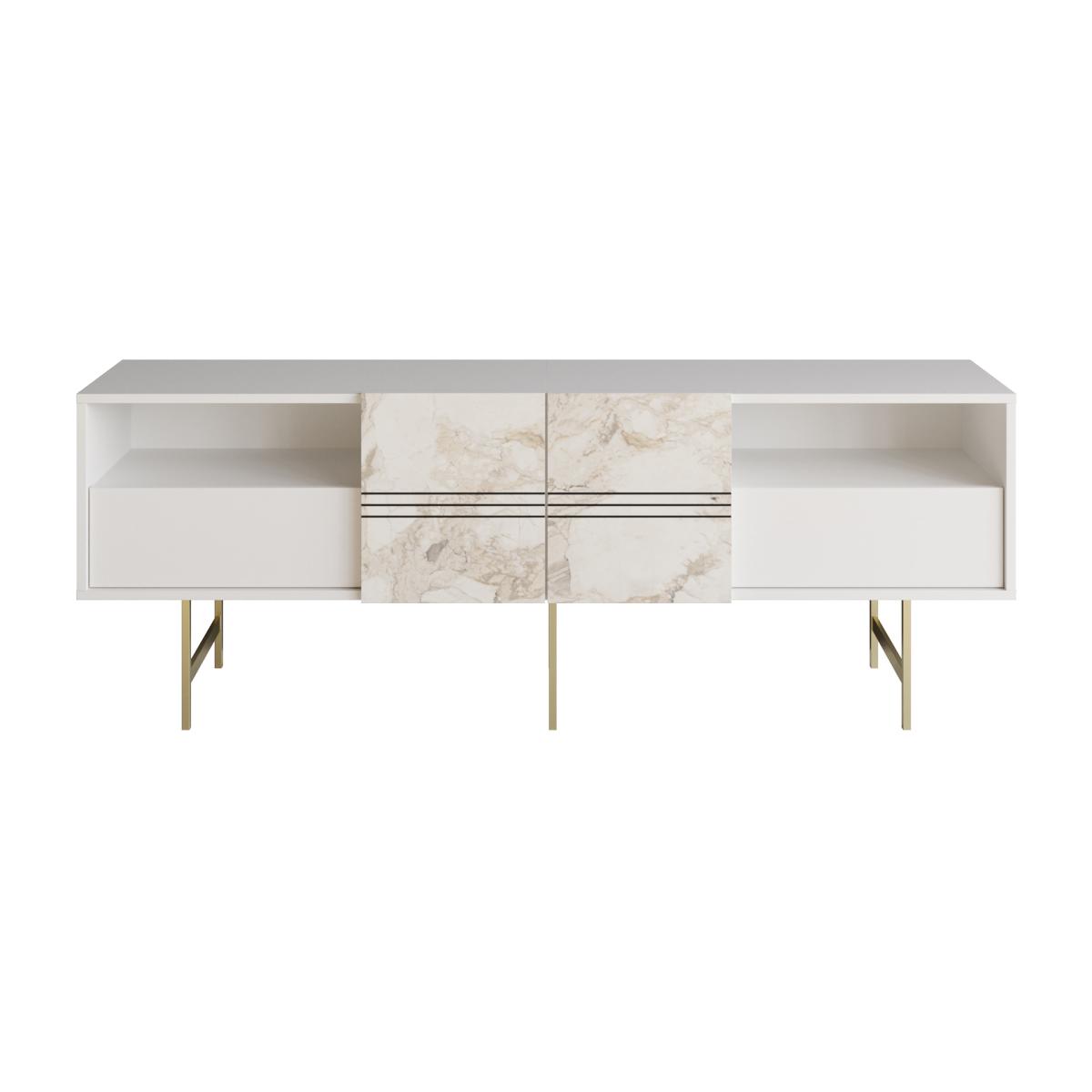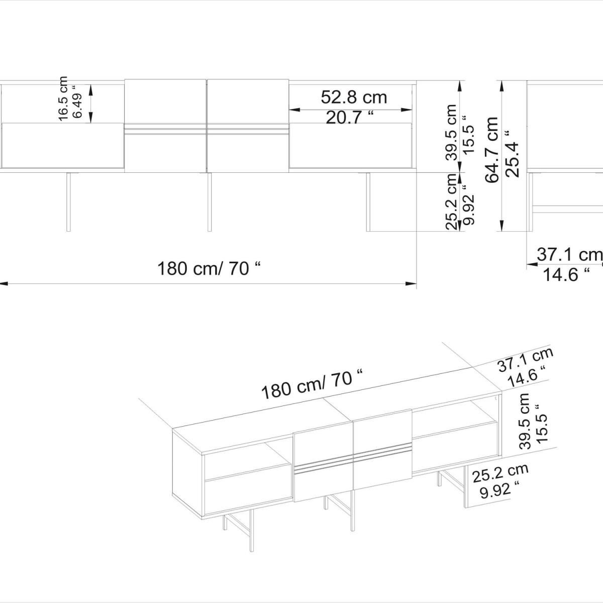 Derin 180cm wide media console with an attractive design can be used as a sideboard console and TV stand at home or in the office. Featuring two half-open shelves and four cabinets, this design offers huge storage space for your books, magazines, TV tuners, remote controllers, or other media devices/collections. Carved straight lines on the drop-down doors make the stand stunning. Drop-down and slab doors of the cabinets are opened without handles. A slightly extended door edge is used as a handle in this design. The console is made of an 18mm thick quality melamine coated particle board and banded with PVC edge banding tape.