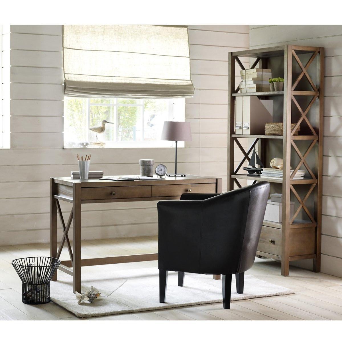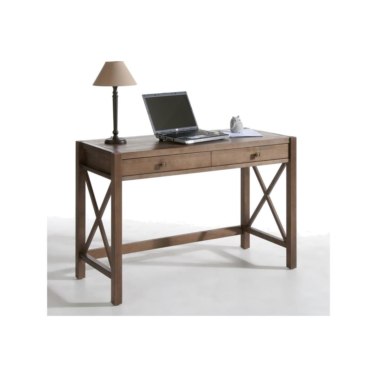 The Derry solid pine desk. This Derry solid pine desk is inspired by the neo-colonial trend in a teak stain, finished with cross-pieces at the sides.