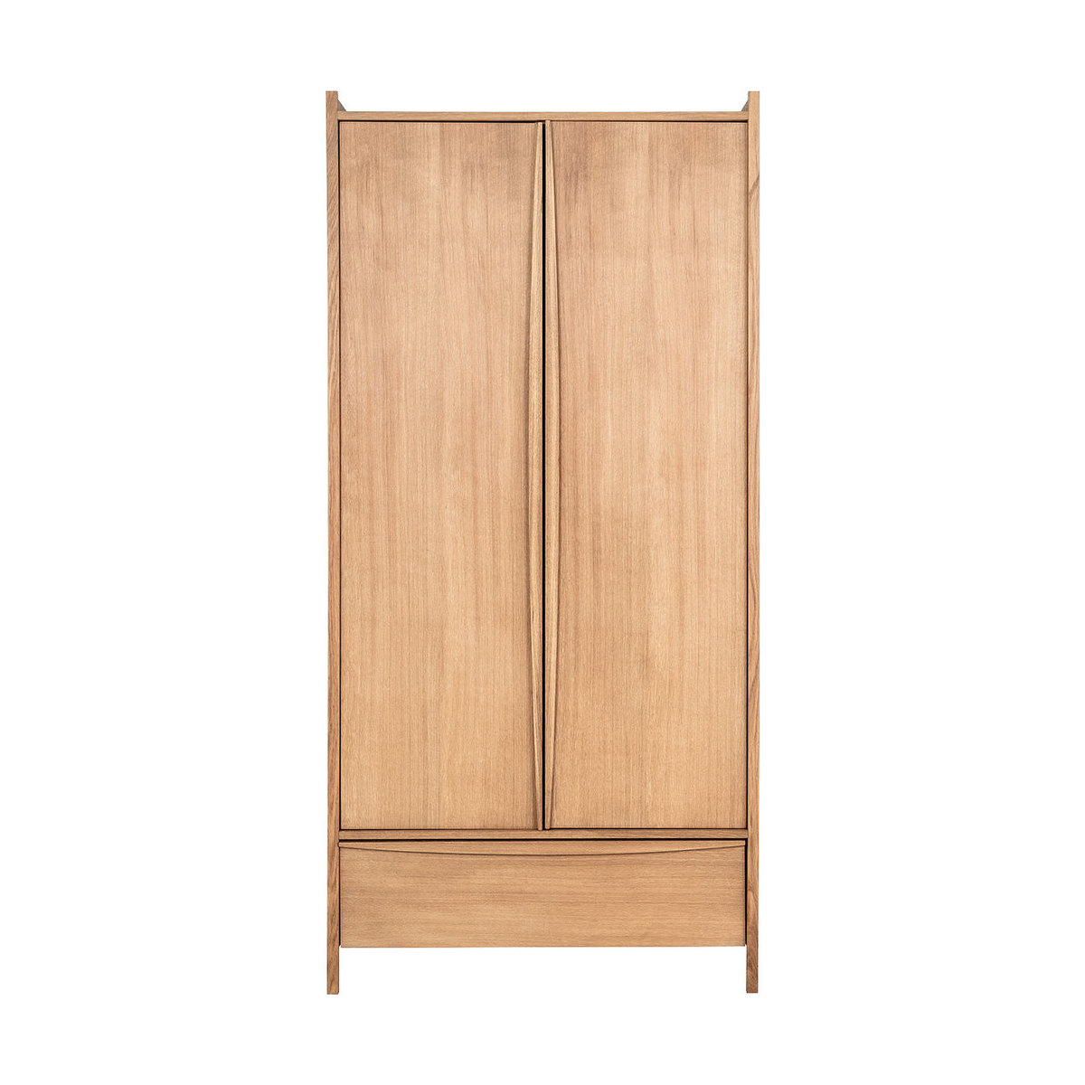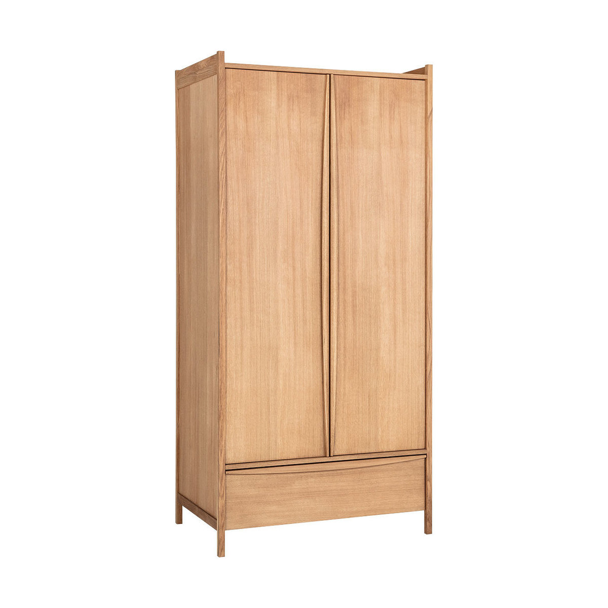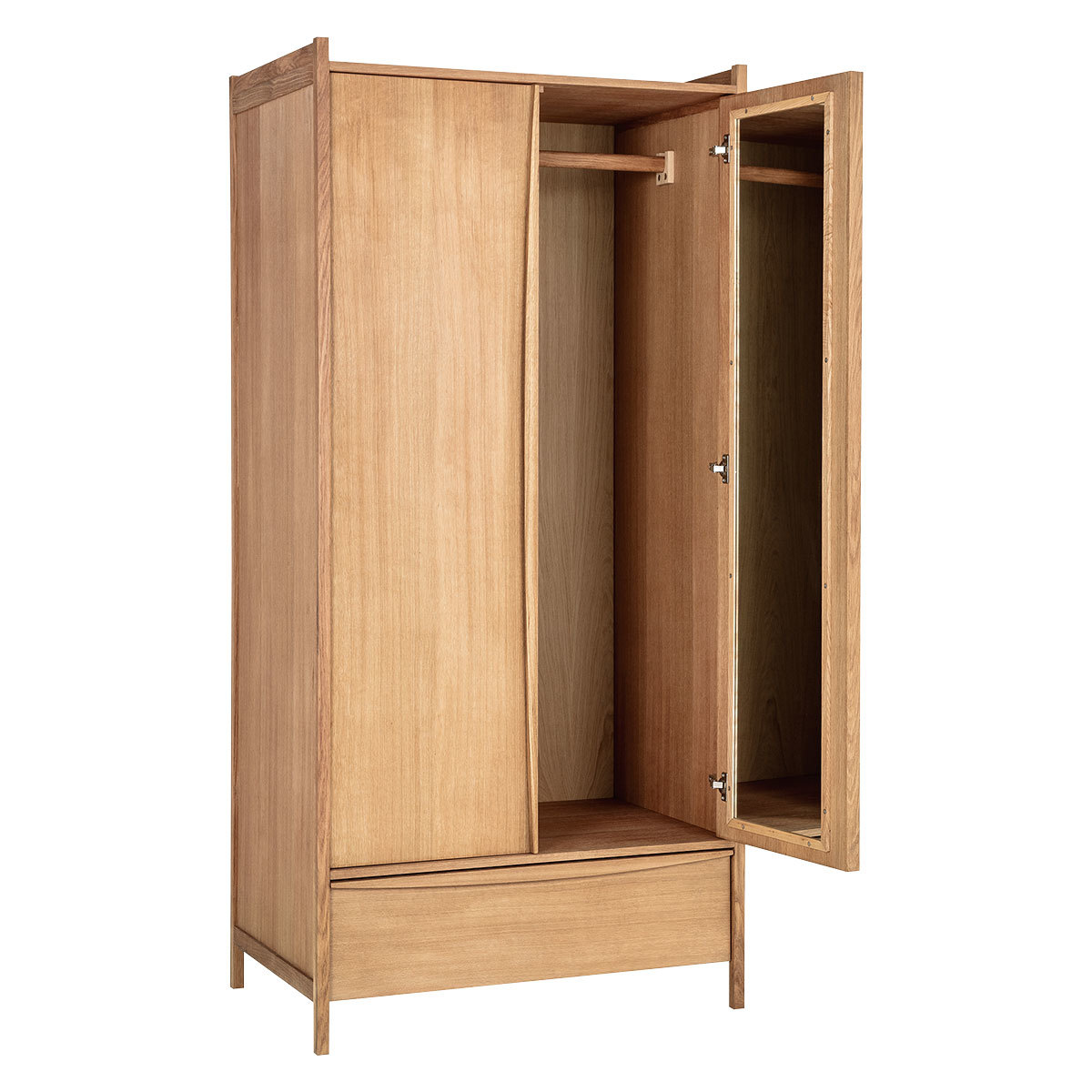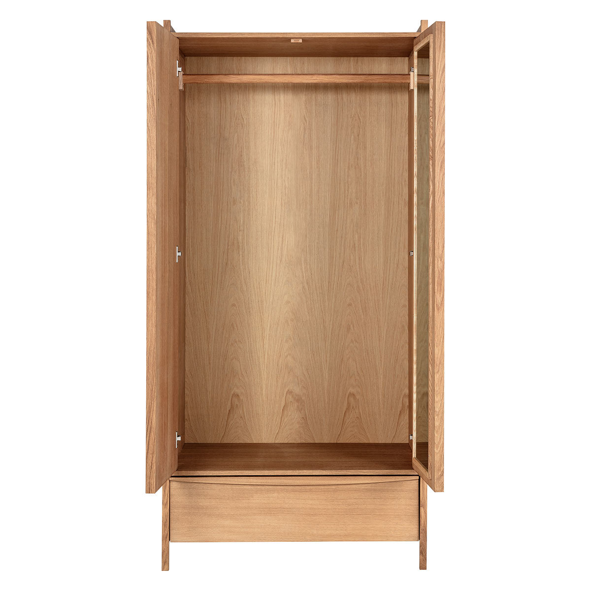 Maximise your storage space in style with the Derwent oak 2 door wardrobe with 1 drawer and full-length mirror. Made from solid oiled oak and oak veneer, this wardrobe’s double doors open to reveal a spacious interior with a solid oak hanging rail and full-length mirror. Raised on slim legs that give lightness to the piece, the bottom drawer is perfect for placing bedding or folded clothes in. Inspired by mid-century design, the hanging compartment and bottom shelf allows for plenty or space to store clothes, shoes and accessories. Designed in our in-house studio, match with other pieces in the Derwent range for a complete, contemporary look.