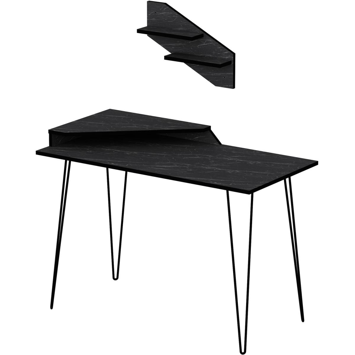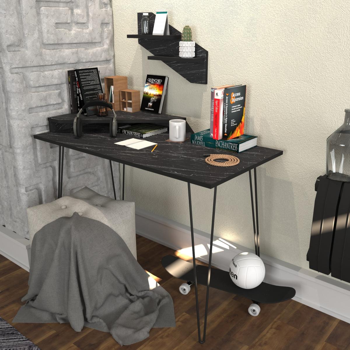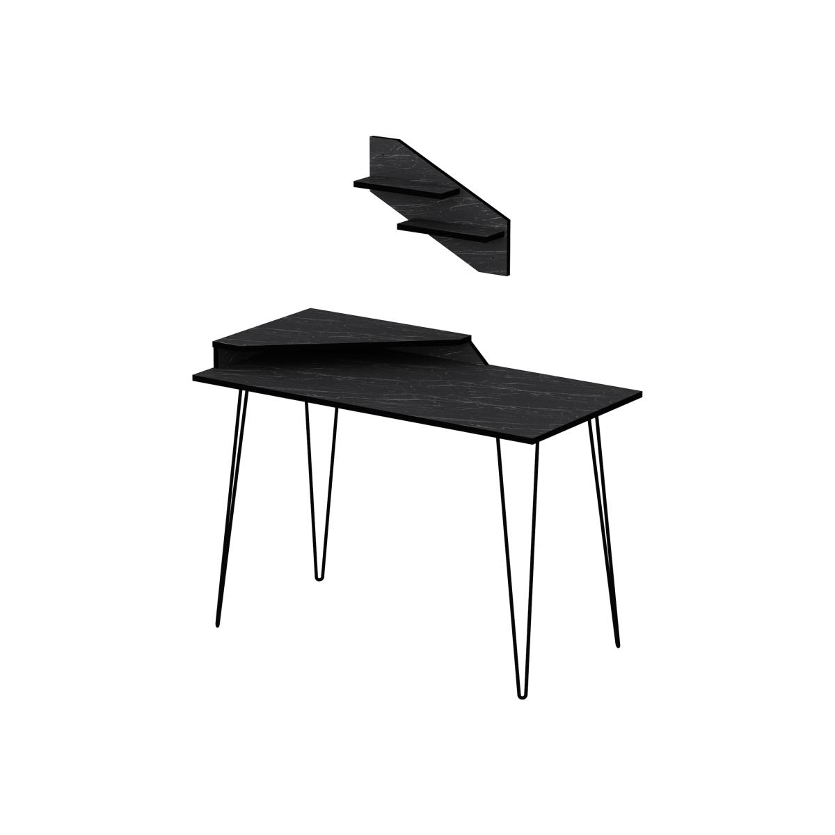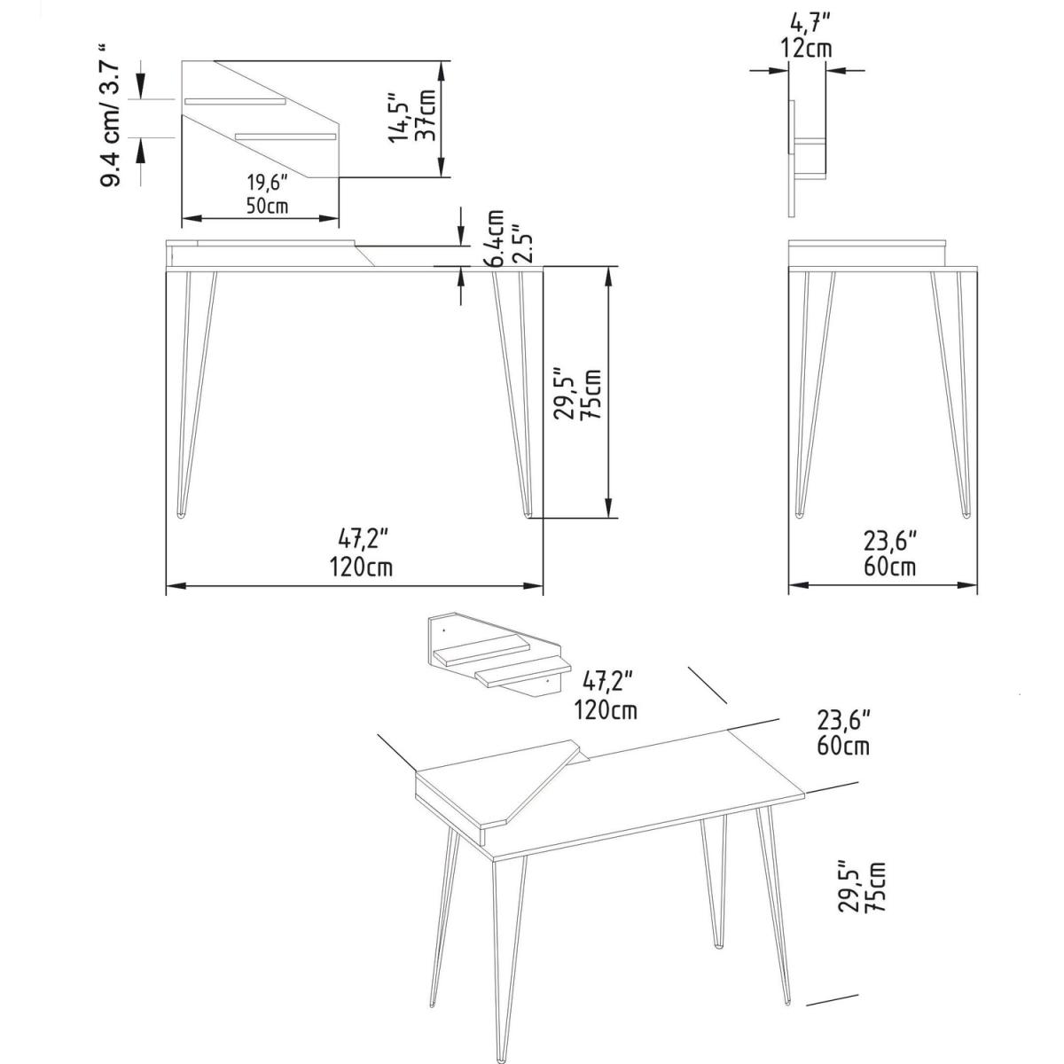 Decorotika Desalvo 120 cm wide computer desk with a wall shelf provides an attractive look that will go smoothly with any style of home/office decor. Features an accent wall shelf and a corner stand for the second monitor. Ideal for use in small spaces to utilize storage and workspace. The desktop and the wall shelf are made of 18 mm thick melamine coated particle board and banded with PVC edge band. Legs are constructed from metal and coated with scratch and impact-resistant static paint. It is manufactured using health-friendly materials.