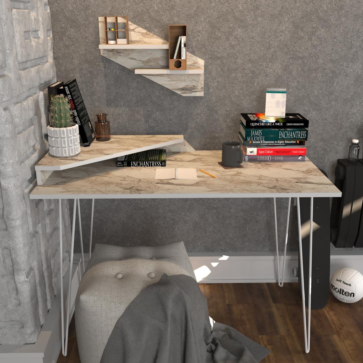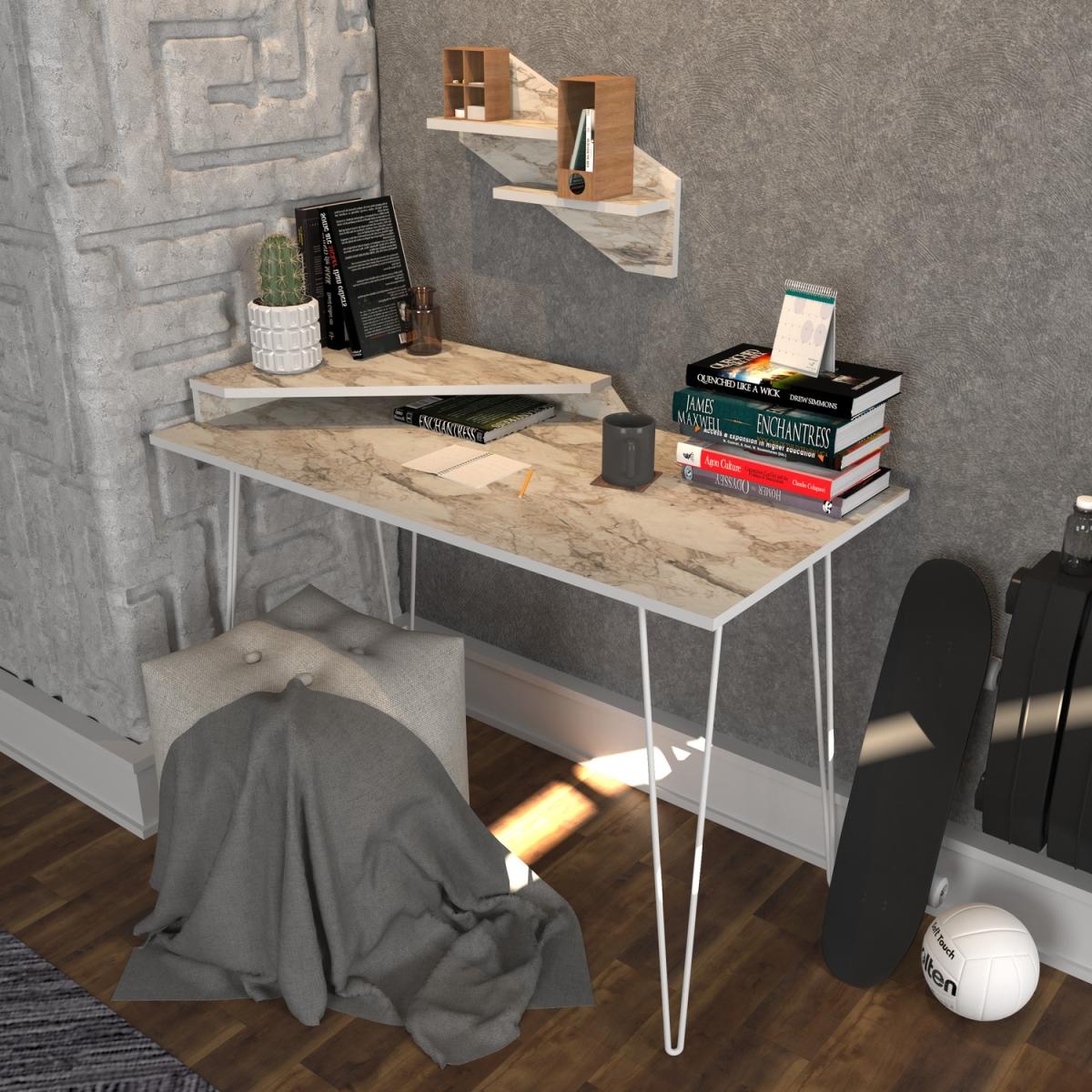Desalvo 120cm Wide Computer Desk with Shelf - Marble White - Marble White
