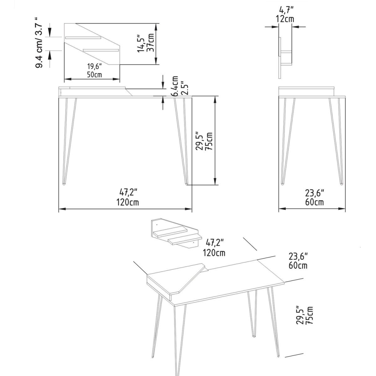 Decorotika Desalvo 120 cm wide computer desk with a wall shelf provides an attractive look that will go smoothly with any style of home/office decor. Features an accent wall shelf and a corner stand for the second monitor. Ideal for use in small spaces to utilize storage and workspace. The desktop and the wall shelf are made of 18 mm thick melamine coated particle board and banded with PVC edge band. Legs are constructed from metal and coated with scratch and impact-resistant static paint. It is manufactured using health-friendly materials.