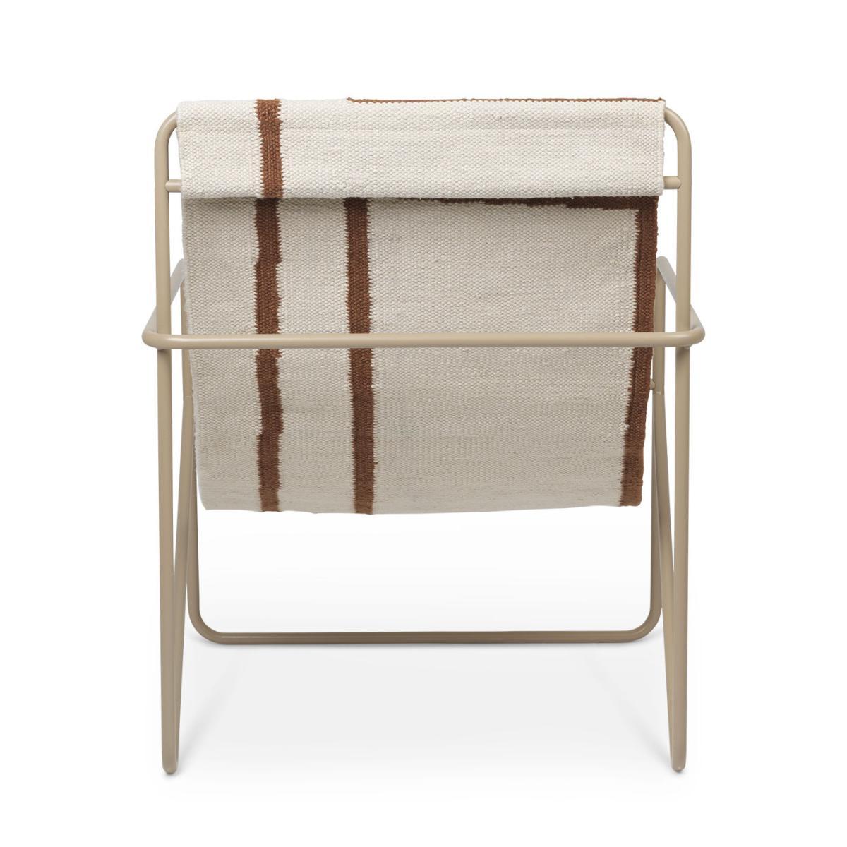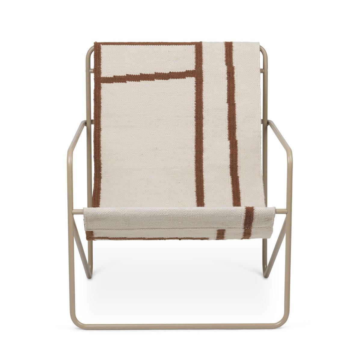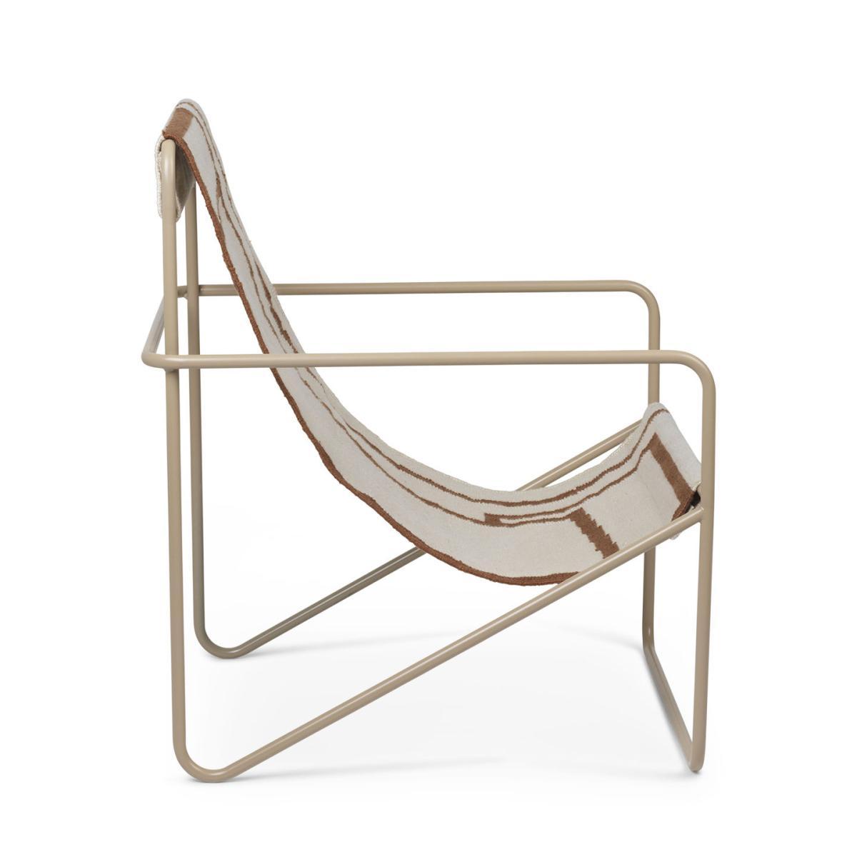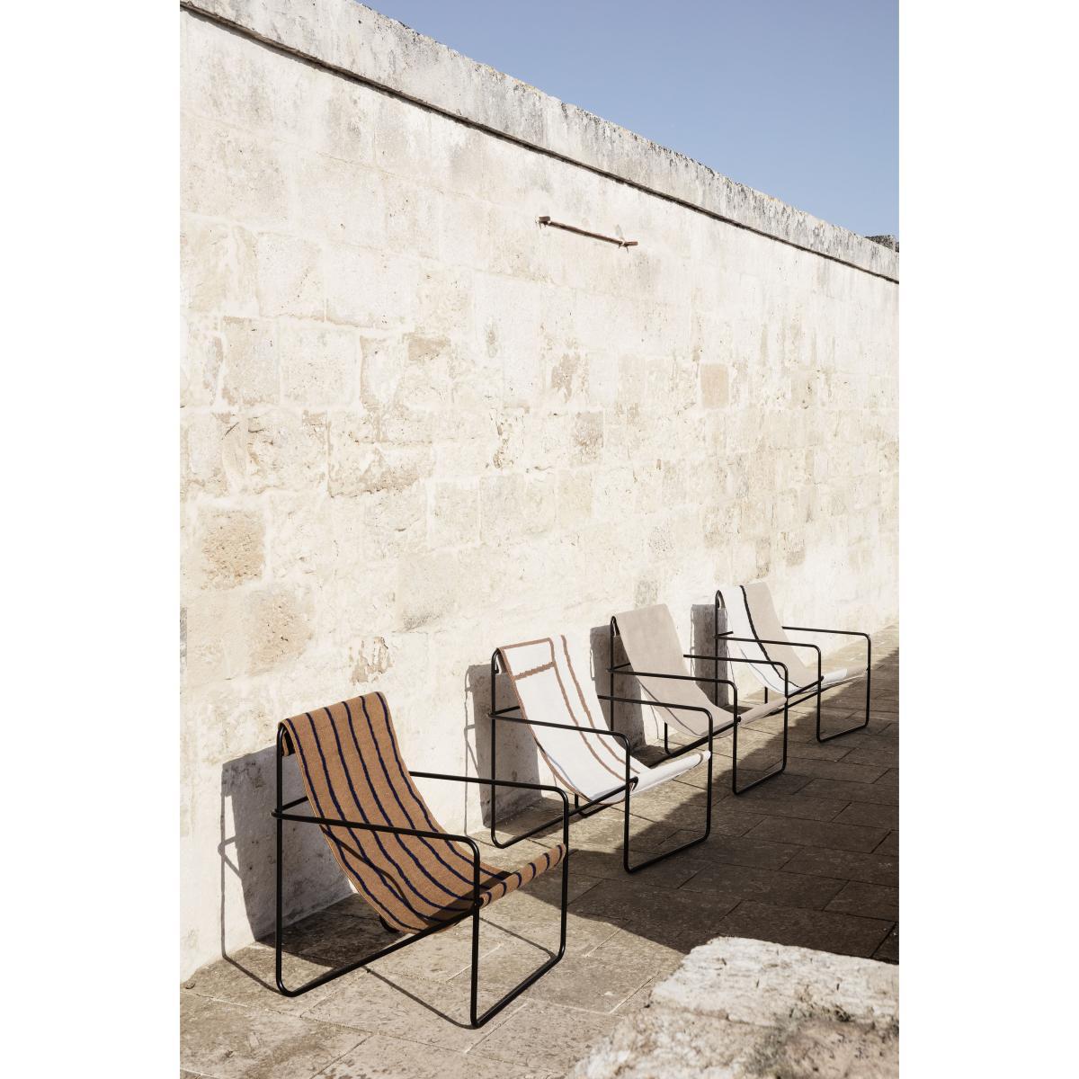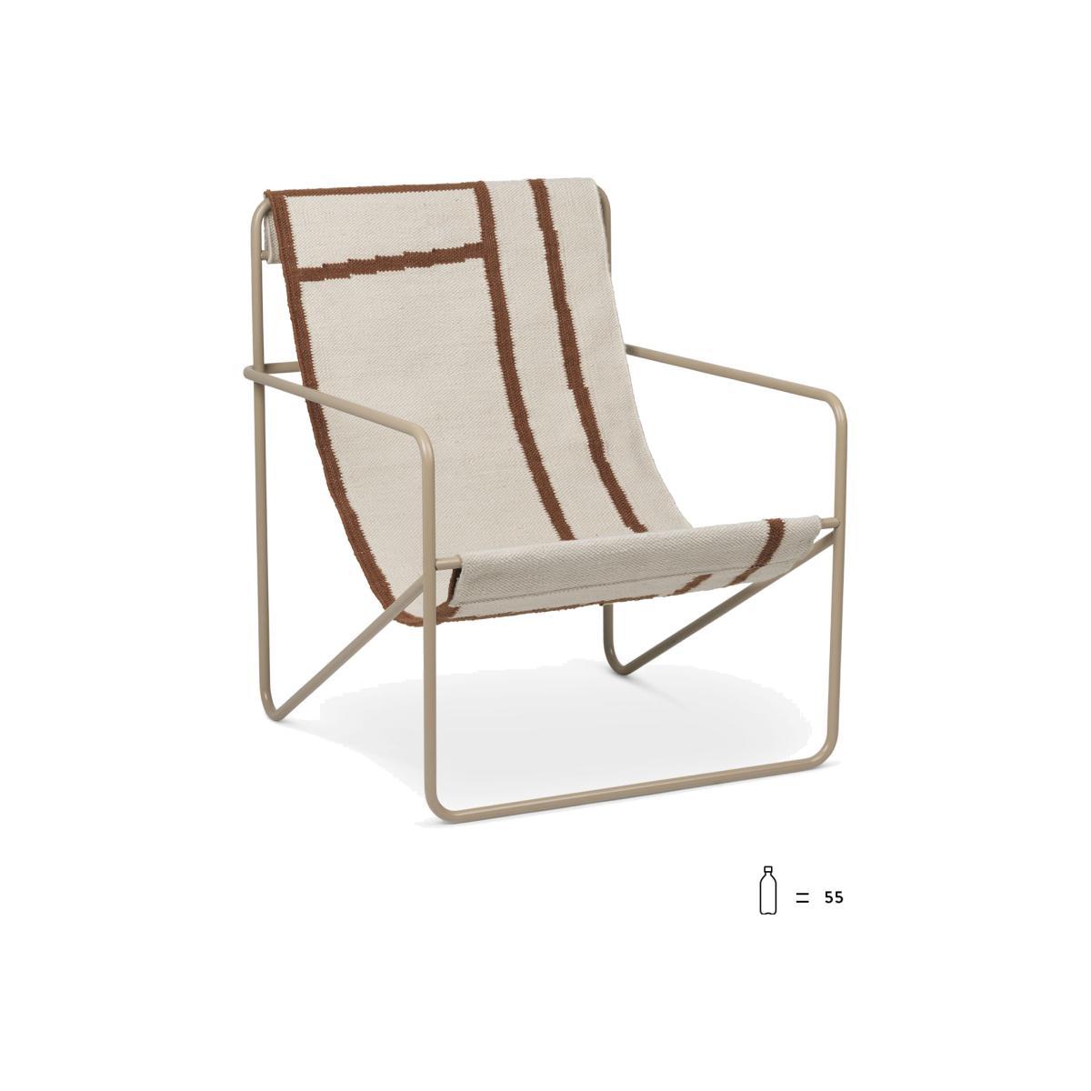 This modernist-inspired armchair has an aerial silhouette with clear geometric lines. The Desert armchair is made up of a thin tubular steel structure from which hangs a seat in flexible, comfortable canvas, decorated with stylised patterns. The classic style with its modernist accents receives a twist with the modernity of the patterns. Eco-designed, the hand-woven canvas is made from recycled plastic bottles. Interchangeable, this fabric is easy to maintain (washable at 30°). Weather-resistant, the Desert armchair is as comfortable in a living room as on a terrace. A true invitation to relaxation, the flexibility of the fabric as well as the enveloping shape of the armchair leave plenty of room for comfort!.