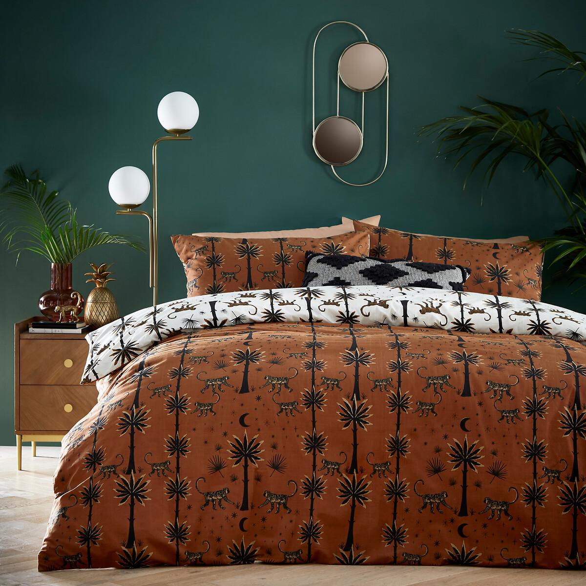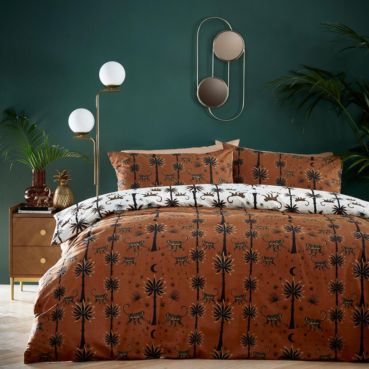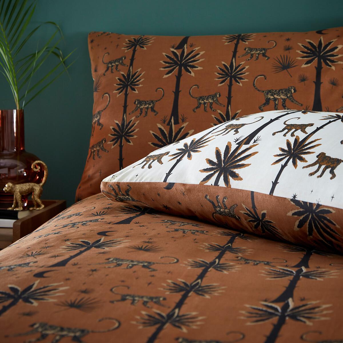 It’s dusk in Morocco and the lively desert monkeys have come out to play. They roam freely around the tall palm trees, under a clear, darkening moonlit starry sky which turns them into shadowy silhouettes. Exuding the amber heat of evenings in North Africa, this duvet cover set brings both warmth and character to your bedroom. The reverse offers a clean, white contrast design, if a more neutral look is required. Perfect to be accompanied by the Dusk Monkey range of cushions for fabulous matching style!Composition: 50% Cotton 50% PolyesterWash/. Care Instructions:Machine Washable (30 degrees max). Low Tumble Dry. Cool Iron. Do Not Dry Clean. Do Not Bleach. Sizes available: Single (137x200), Double (200x200), King (230x220), Super King (260x220).Please note that the Single Set comprises of a Duvet Cover and 1 pillowcase, the Double, King and Super King all come with a Duvet Cover and 2 Pillowcases. This product will be dispatched by one of our trusted suppliers. You’ll be contacted by their selected courier about your delivery.
