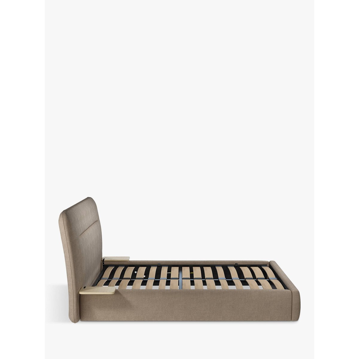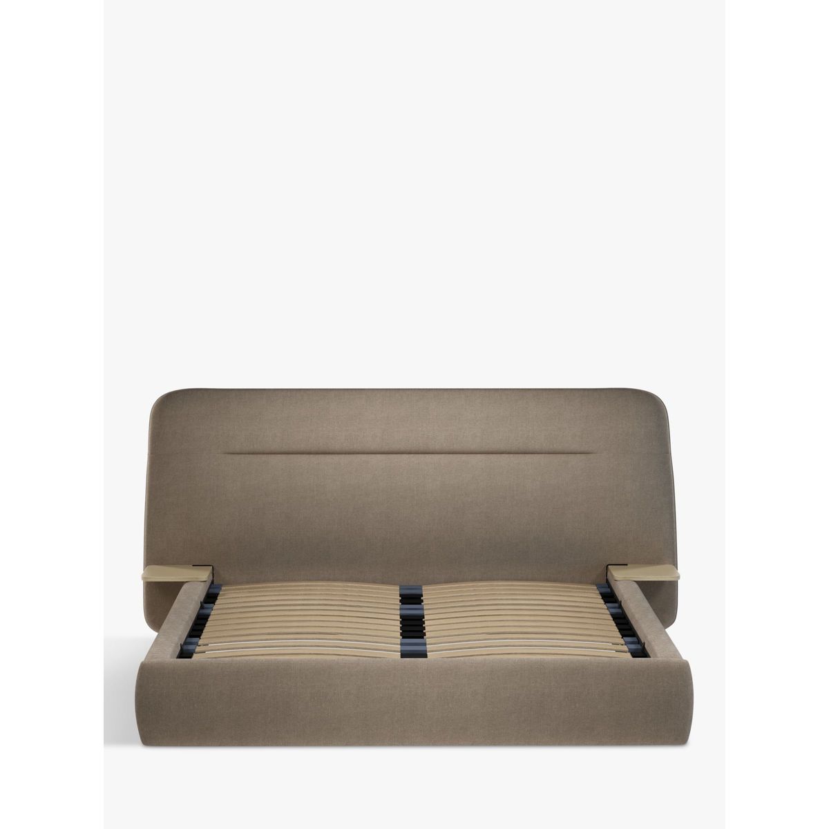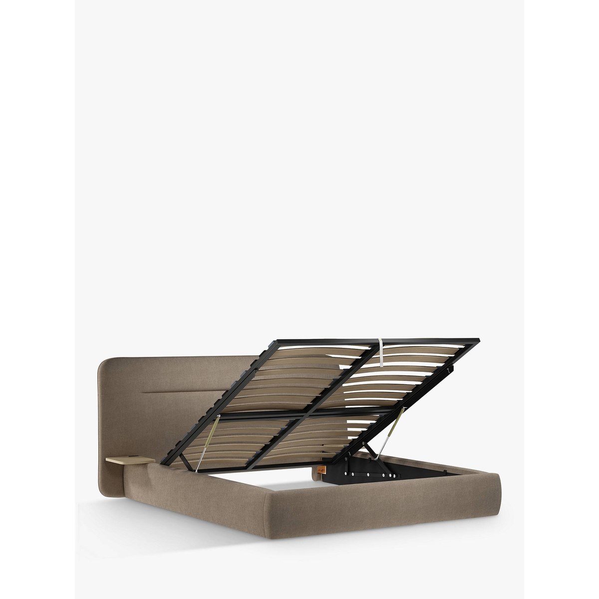 The No.152 ottoman storage bed frame fuses function with style, offering generous storage space in its base so that you can keep your bedroom clutter free. Integrated wooden side tables are suspended neatly on either side of the frame. Ideal for rooms where space is tight, a handle and hydraulic arms facilitate an easy manual lift-up and sprung slats offer additional support for you and your mattress. Smart Slats This bed frame is designed with wider slats at the shoulders, lumbar and feet, that provide maximum support for your mattress so that you experience perfect spinal alignment while you sleep. Standard slat caps are black so we have added grey slat caps to ensure that you know where to place the wider slats.